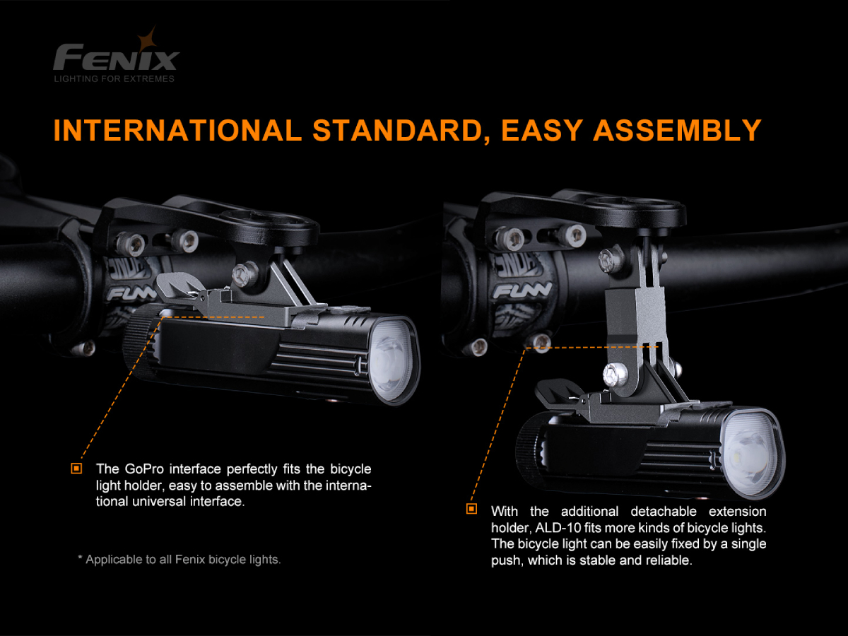 Adaptér Fenix ALD-10 slúži na uchytenie cyklosvetiel Fenix do GoPro montážii. Či už používate GoPro montáž na riadidlách, prilbe či niekde inde, tak vďaka redukcii Fenix ALD-10 môžete odteraz v týchto montážach používať aj cyklosvetlá Fenix.
