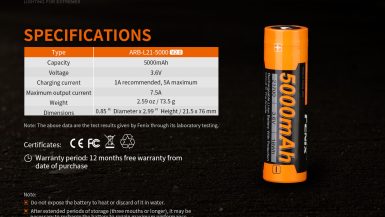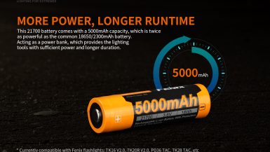Špičkové nabíjateľné batérie Fenix 21700 5000 mAh V2.0 (ARB-L21-5000 V2.0) s ochrannou elektronikou (protected) sú založené na špičkovej technológii LiNiCoO2, ktorá prináša vyššiu bezpečnosť a tiež dlhšiu životnosť. Li-ion nabíjateľné batérie sa vyznačujú veľmi vysokou kapacitou, netrpia pamäťovým efektom a ani samovybíjaním. Li-ion vo veľkosti 21700 sú najlepšou voľbou z hľadiska uchovanej energie vzhľadom k rozmerom a váhe akumulátora, postupne sa presadzujú napríklad v autopriemysle.