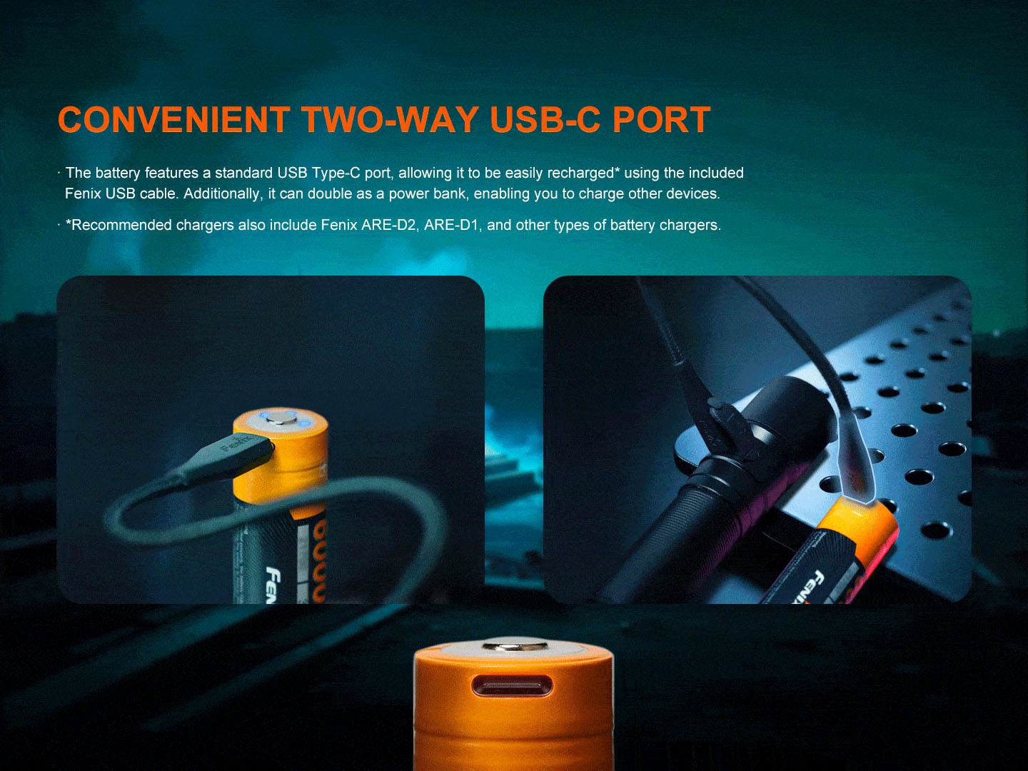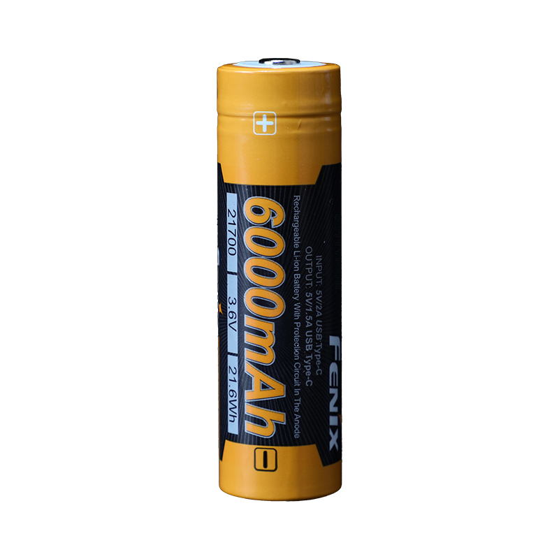 Nabíjateľná batéria Fenix 21700 6000 mAh (ARB-L21-6000B) s ochrannou elektronikou (protected) a s vlastným nabíjacím USB-C konektorom prináša najvyššiu reálnu kapacitu na trhu. Li-ion dobíjateľné batérie sa vyznačujú veľmi vysokou kapacitou, netrpia pamäťovým efektom a ani samovybíjaním. Môže sa nabíjať pripojením kábla do USB-C konektora (napr. z počítača, powerbanky či nabíjačkou na mobilný telefón) alebo aj v klasickej nabíjačke na Li-ion akumulátory. Zároveň je možné akumulátor použiť aj ako powerbanku a nabíjať z neho ďalšie USB zariadenia.