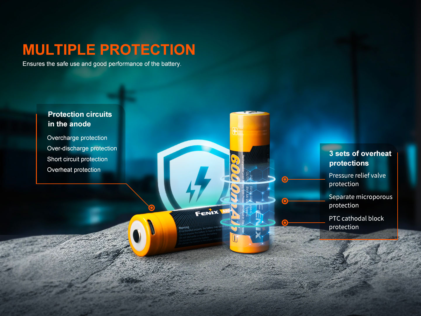 Ochrana akumulátorov Fenix pozostáva z interných bezpečnostných mechanizmov a ochrannej elektroniky. Pridané elektronické obvody zabraňujú prebitiu článku a jeho prílišnému vybitiu. Chránia ho pred skratom či príliš vysokým prúdovým odberom. Ak elektronika batérie vyhodnotí dosiahnutie limitných hodnôt, bezpečne odpojí článok.