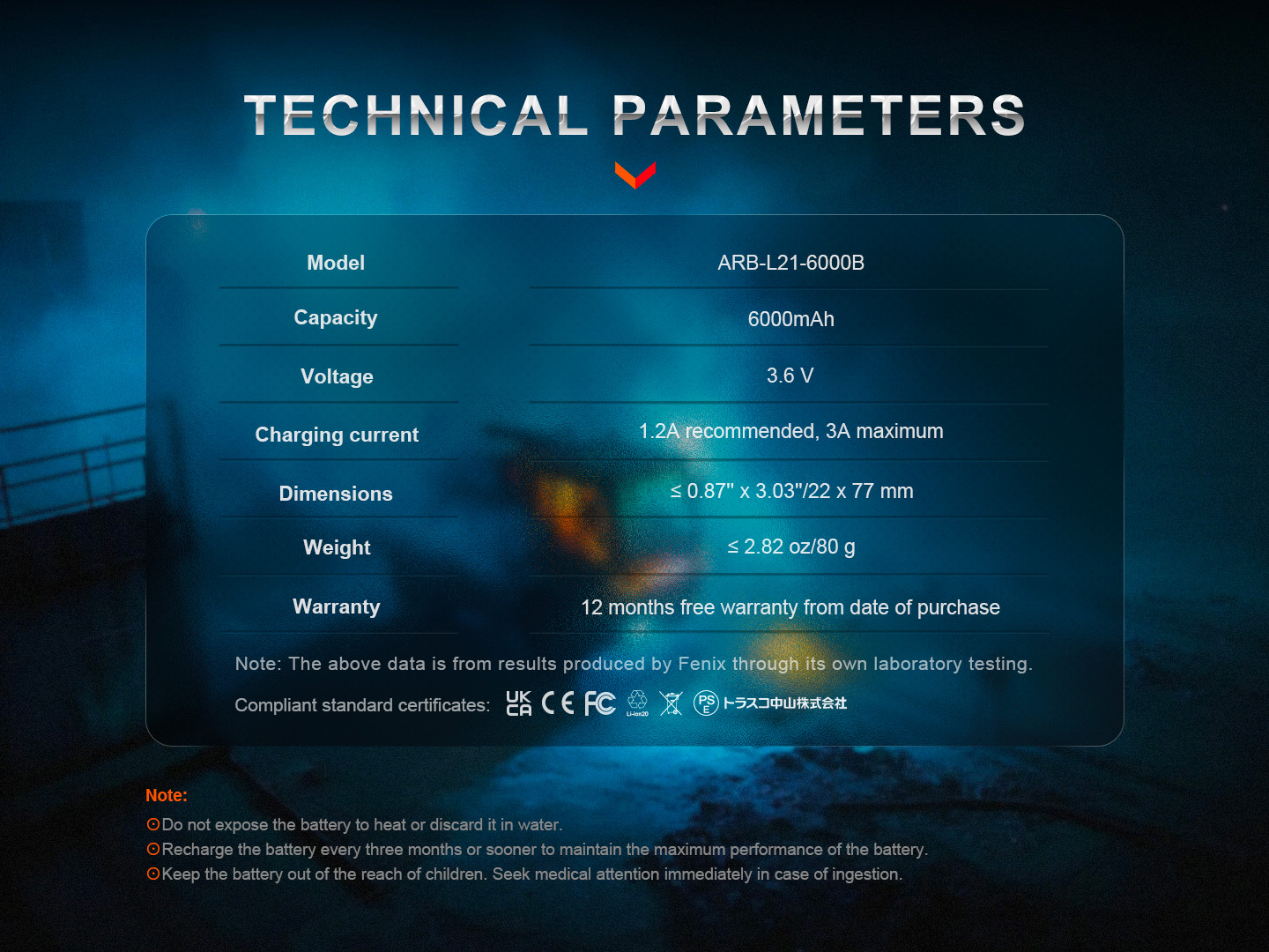 Pozor, rozmery akumulátora sú 22 milimetrov x 77 milimetrov, takže má väčší priemer ako bežné Li-ion typu 21700. Zmestí sa teda len do niektorých svietidiel a čeloviek. Kompatibilný je s týmito svietidlami Fenix: TK22R, TK30R, HT18R, HT32, LR36R, LD45R, PD40R V3.0, PD36R V2.0.