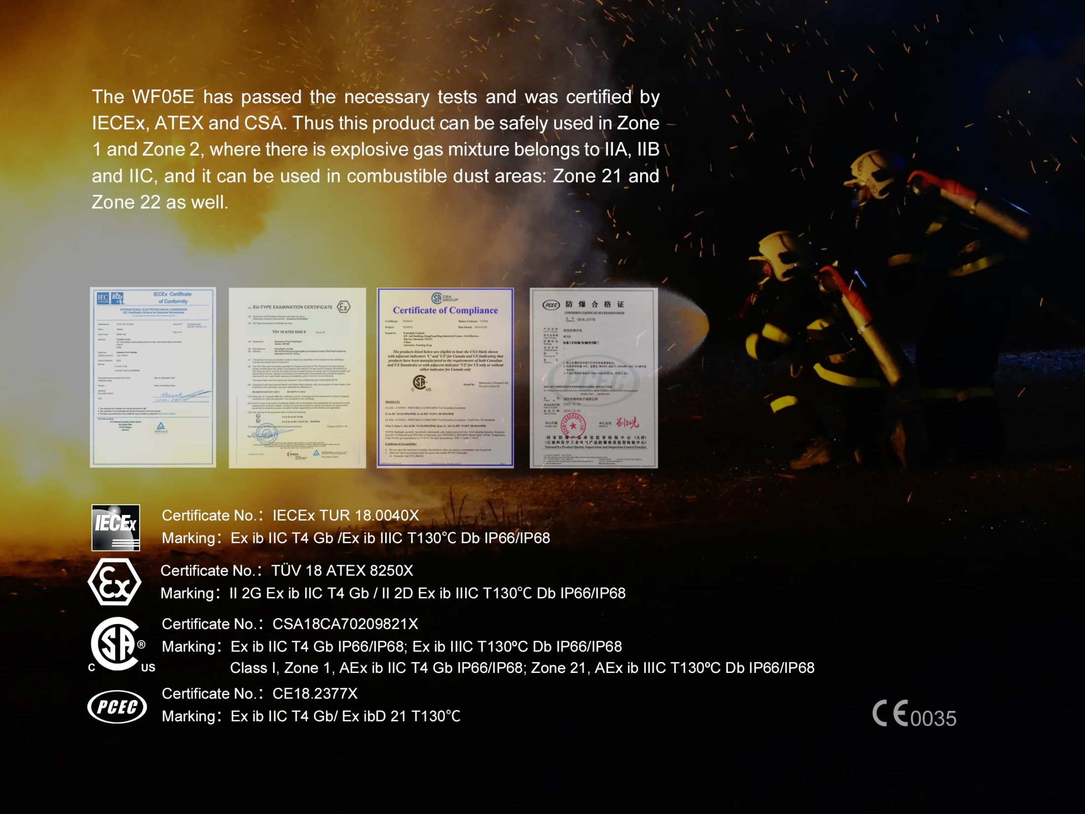 Profesionálne svietidlo Fenix WF05E s certifikáciou ATEX/IEC pre použitie vo výbušnom prostredí. Svietidlo je napájané dvoma mikrotužkovými (AAA) batériami a poskytuje svetelný tok až 85 lúmenov. Telo svietidla je vyrobené z hliníkovej zliatiny pre vysokú odolnosť a nárazuvzdornosť a spona z antistatického plastu. Svietidlo je určené najmä pre hasičov, záchranárov, použitie v chemických, ropných, textilných a metalurgických prevádzkach a ďalších oblastiach, kde nemožno použiť bežné svetlá. Tvarovo pripomína pero a možno ho tak nosiť napríklad v náprsnom vrecku. Svietidlo nie je určená pre použitie v baniach.