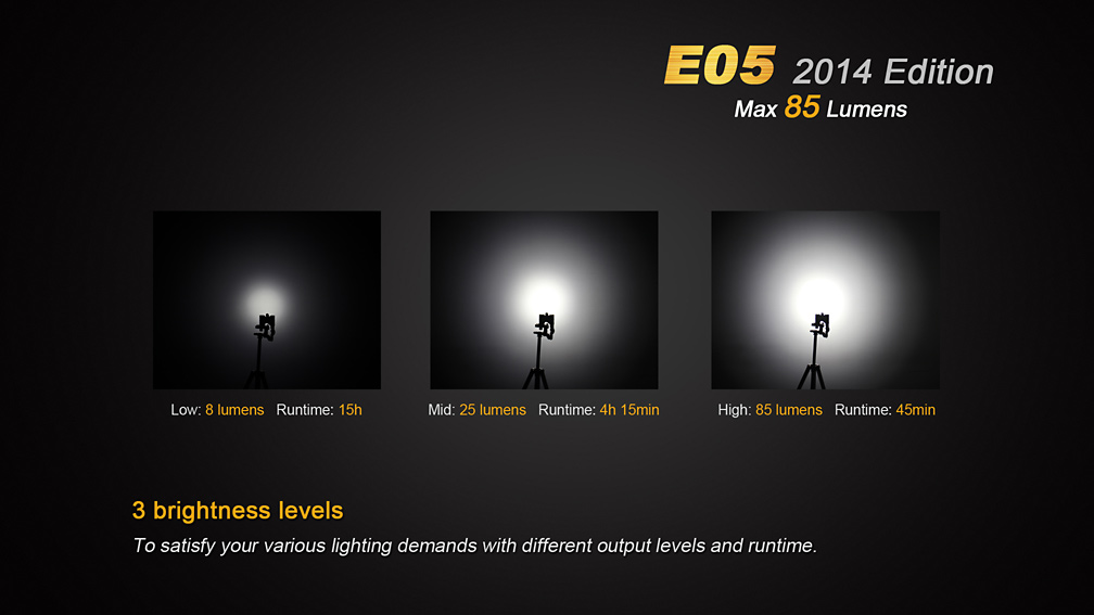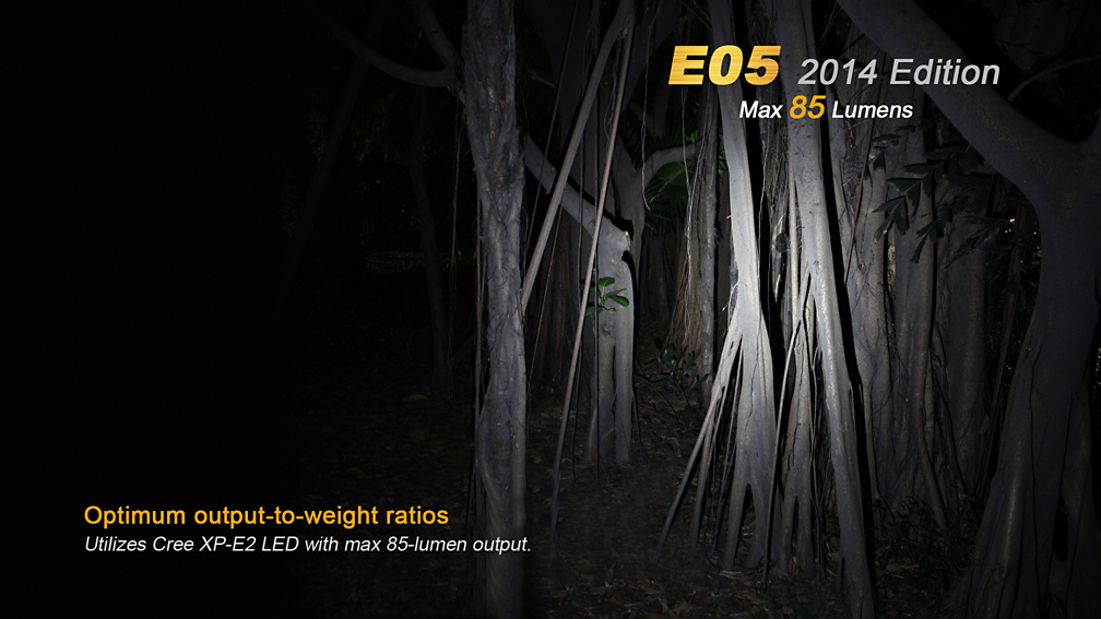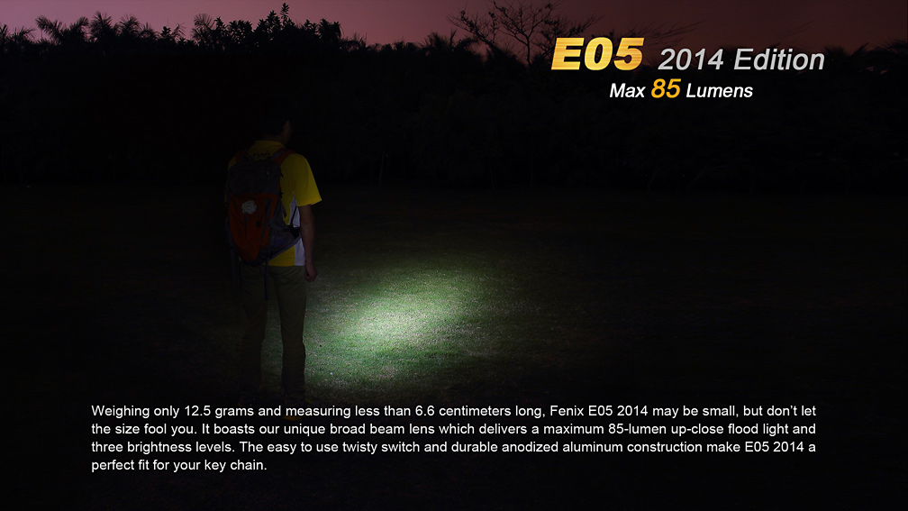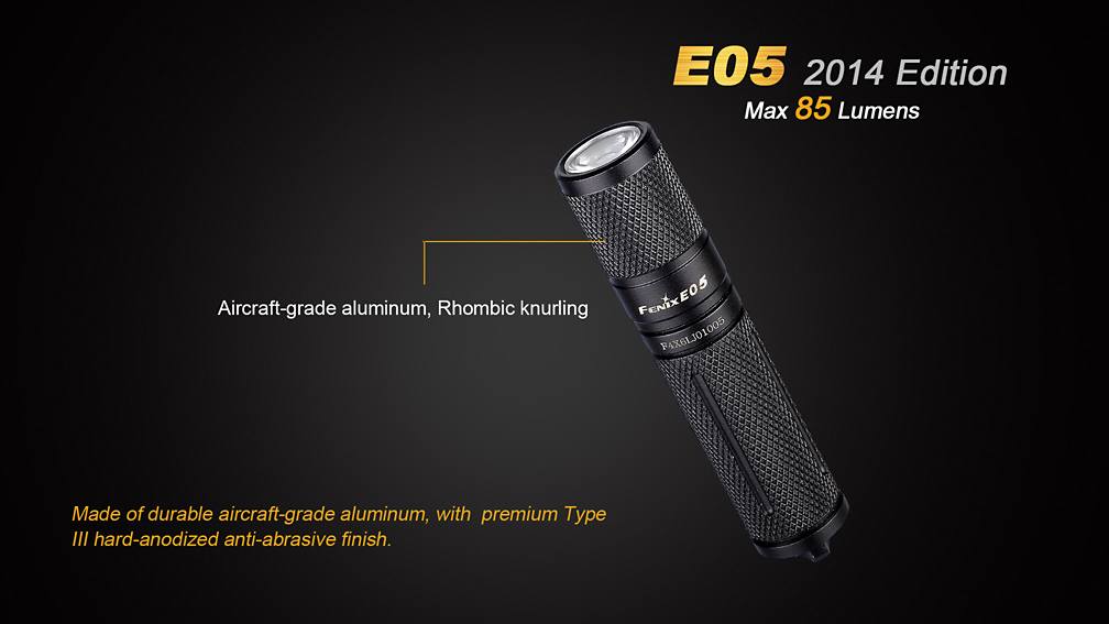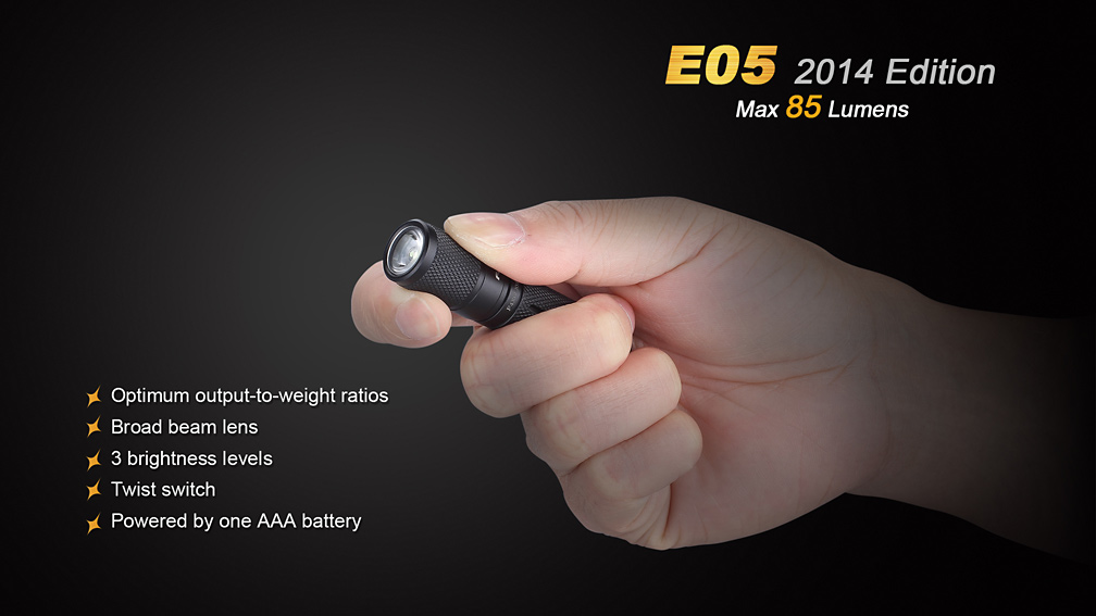 Druhá generácia LED baterky Fenix E05 ponúka výrazne navýšenie výkonu a tri režimy svietenia. Vďaka svojím zanedbateľným rozmerom a váhe môže byť nosená v zásade kdekoľvek – vo vrecku, na kľúčoch či v peňaženke. Svetlo nie je o moc väčšie než mikrotužková (AAA) batéria, z ktorej je taktiež napájané. Samozrejmosťou je vysoká kvalita prevedenia, odolnosť a vodotesnosť. Jedná sa o malého užitočného spoločníka pre použitie v každodenných situáciách so svetelným výkonom až 85 lúmenov a výdržou až 15 hodín prevádzky.