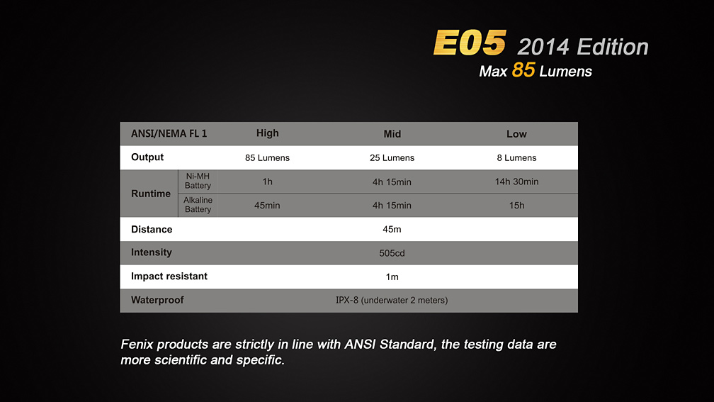 Všetky parametre svietidla (svetelný tok, doba svietenia na batérie, vodotesnosť, dosvit a nárazuvzdornosť) sú merané v súlade s normou ANSI/NEMA FL 1-2009 Flashlight Basic Performance Standard.