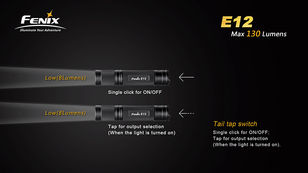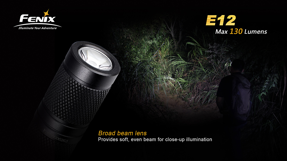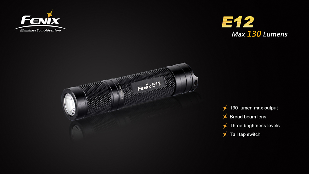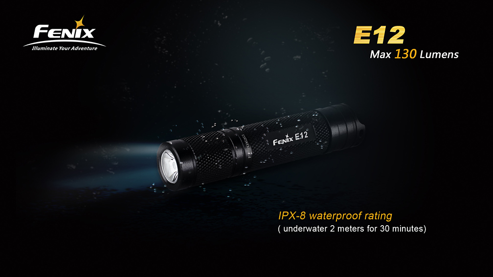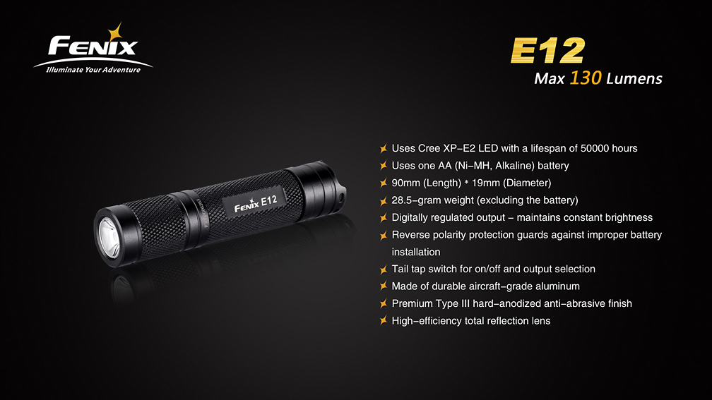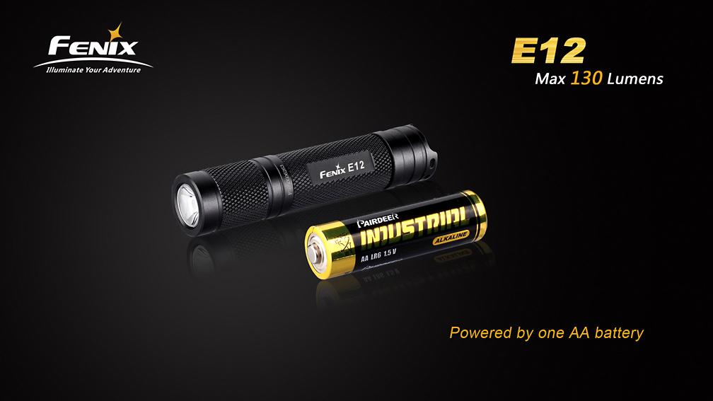 Baterka Fenix E12 je perfektné vreckové svetlo na jednu tužkovú batériu, ktoré poskytne výkon až 130 ANSI lúmenov. Vďaka kompaktným rozmerom a váhe ho možno pohodlne nosiť neustále pri sebe. Samozrejmosťou je vysoká kvalita prevedenia, odolnosť a vodotesnosť. Fenix E12 disponuje tromi úrovňami osvetlenia, čo užívateľom umožňuje jednoducho zvoliť režim uprednostňujúci vysokú intenzitu osvetlenia alebo dlhú dobu prevádzky až 40 hodín.