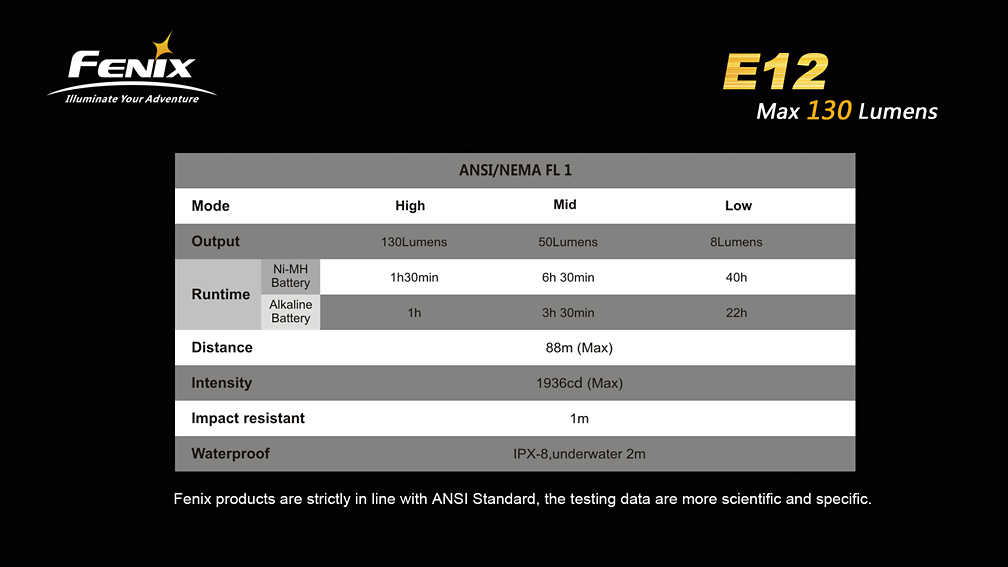 Všetky parametre svietidla (svetelný tok, doba svietenia na batérie, vodotesnosť, dosvit a nárazuvzdornosť) sú merané v súlade s normou ANSI/NEMA FL 1-2009 Flashlight Basic Performance Standard.