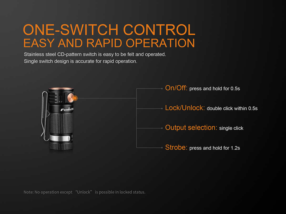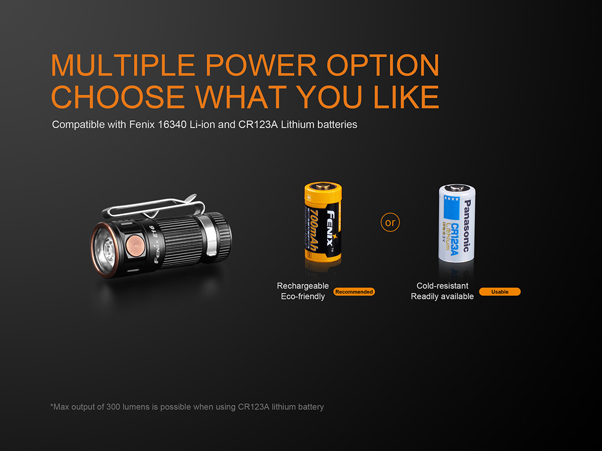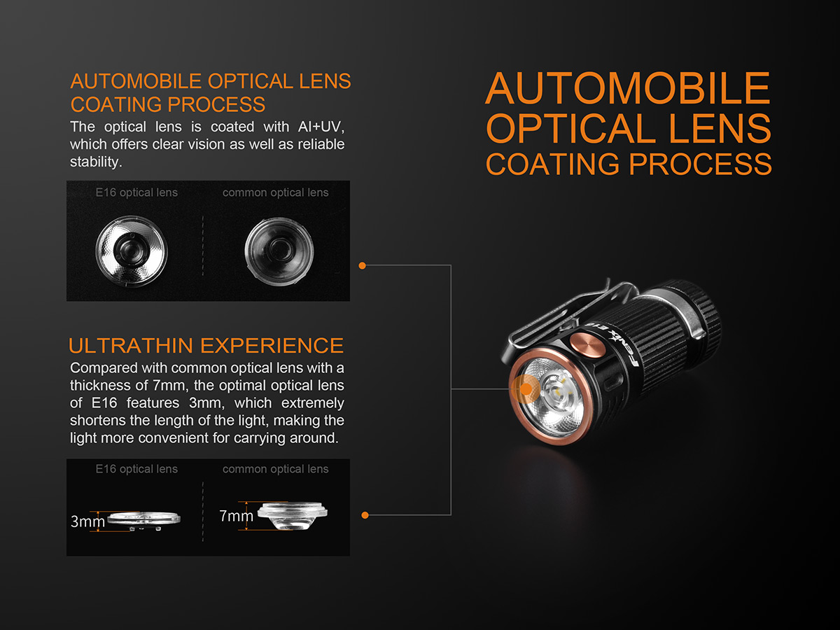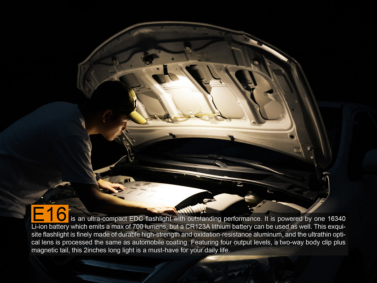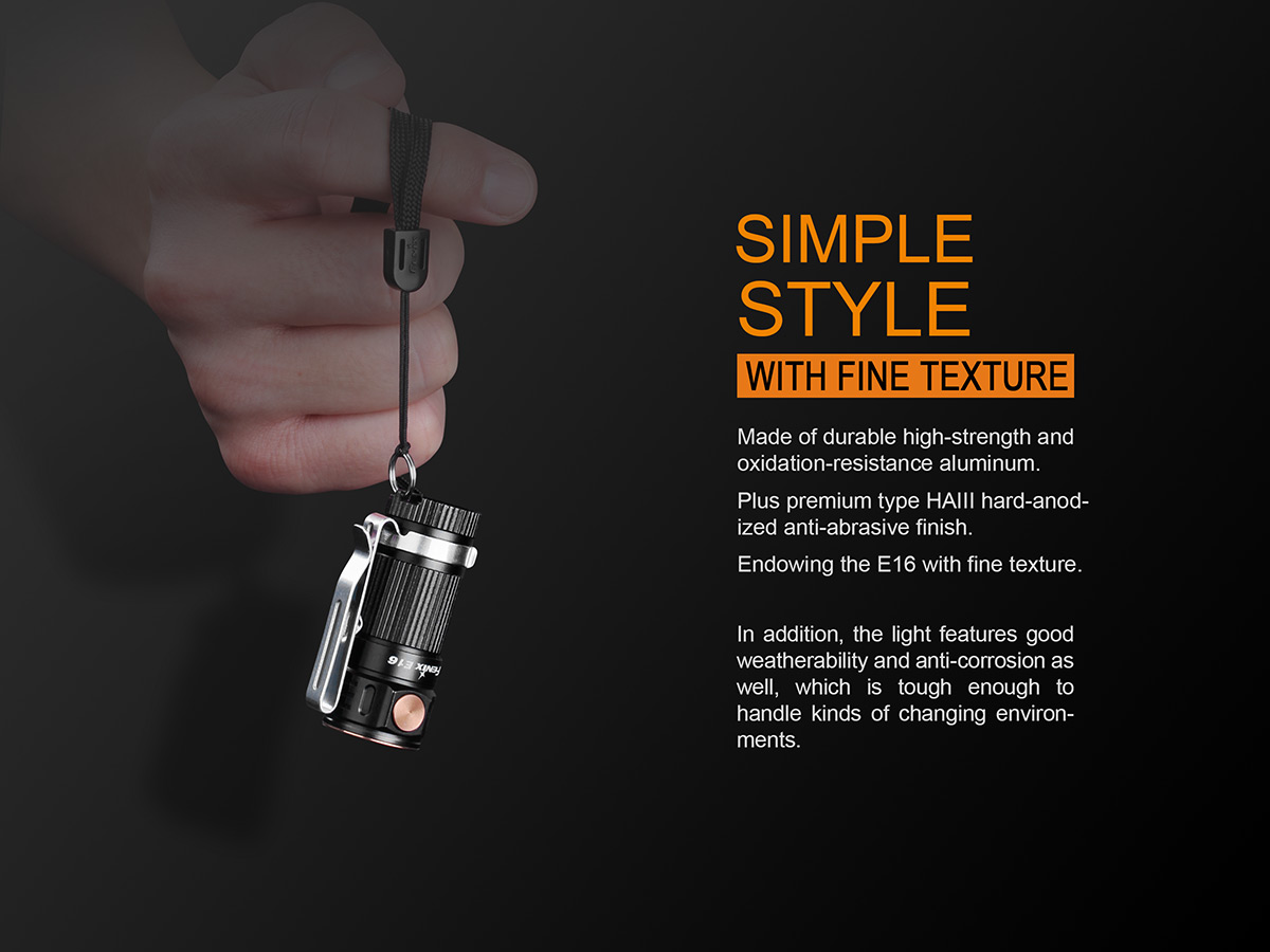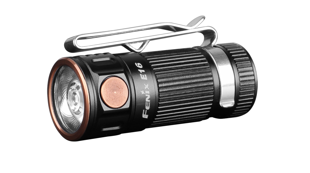 Fenix E16 je miniatúrne vreckové LED svietidlo s krátkodobým extrémnym výkonom až 700 lúmenov (ANSI). Tento model používa ako svetelný zdroj diódu Cree XP-L HI s teplejším odtieňom svetla. Vďaka dĺžke len 51 milimetrov a váhe 21 gramov ho možno nosiť stále pri sebe – vo vrecku, na kľúčoch či v kabelke. Možno ho napájať nabíjateľným Li-ion akumulátorom RCR123A, ale aj jednorazovou CR123A batériou.