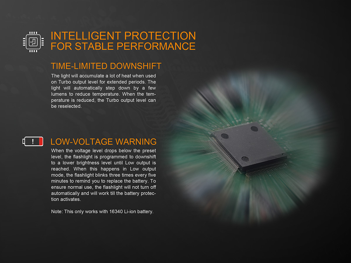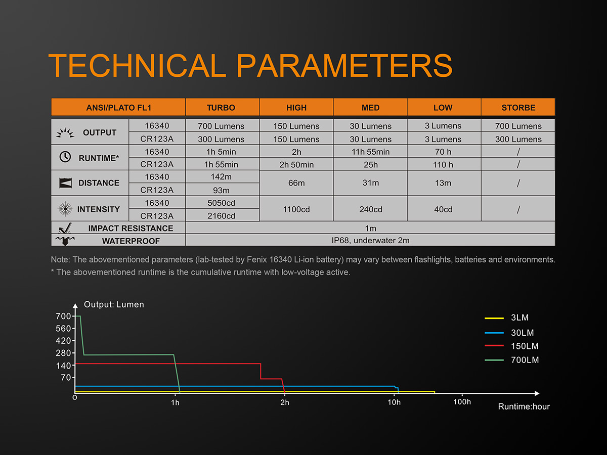 Všetky parametre baterky (svetelný tok, doba svietenia na batérie, vodotesnosť, dosvit a nárazuvzdornosť) sú merané v súlade s normou ANSI/NEMA FL 1-2009 Flashlight Basic Performance Standard.