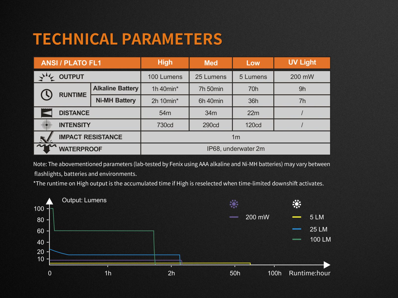 Všetky parametre baterky (svetelný tok, doba svietenia na batérie, vodotesnosť, dosvit a nárazuvzdornosť) sú merané v súlade s normou ANSI/NEMA FL 1-2009 Flashlight Basic Performance Standard.