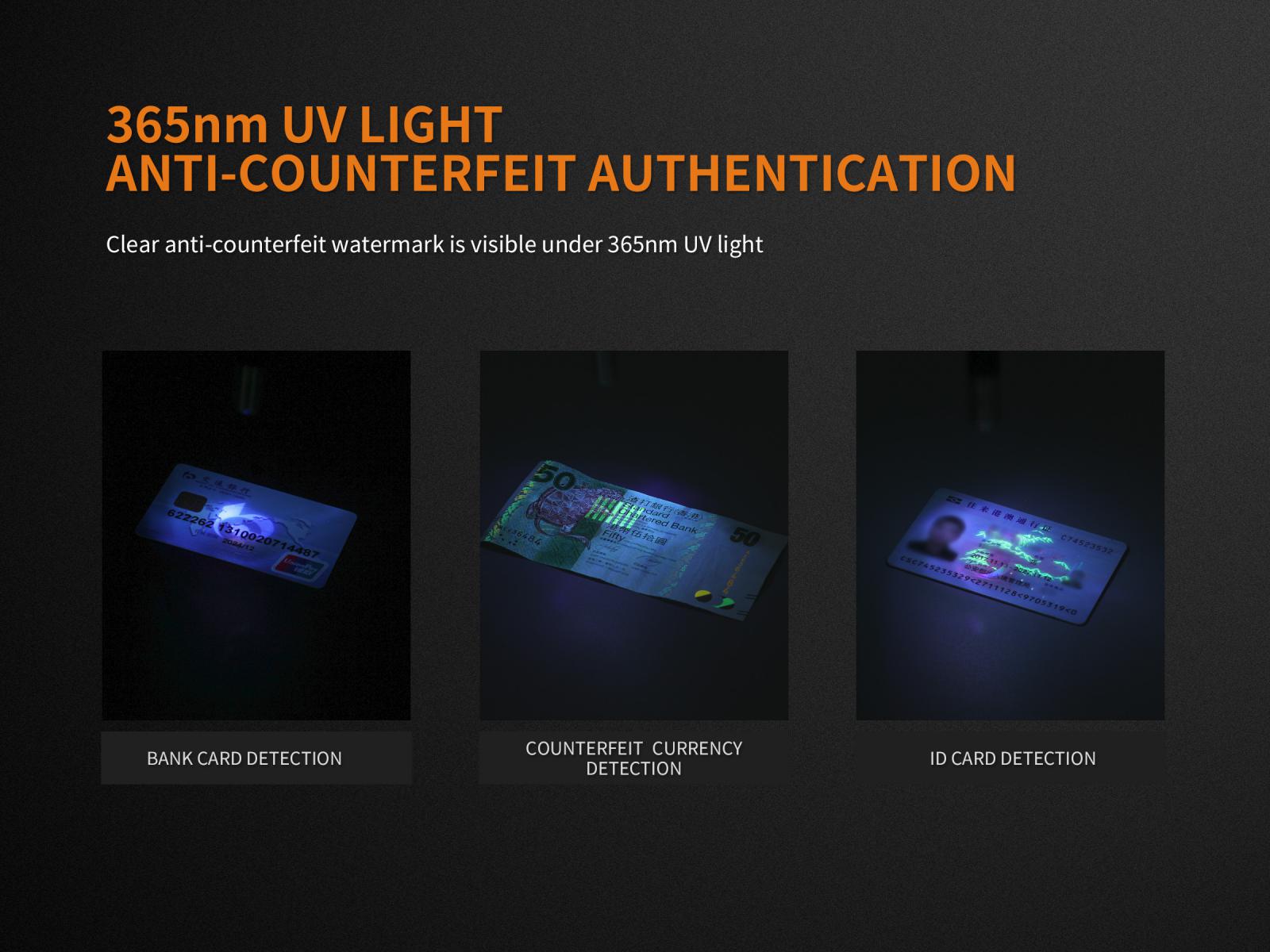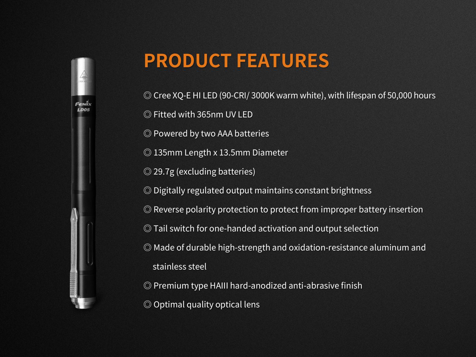 Naviac je osadená ultrafialovou LED s vlnovou dĺžkou 365 nm a žiarivým tokom 200 mW. Ultrafialové svetlo umožní napríklad rýchlu kontrolu pravosti dokladov, bankoviek a platobných kariet. Ďalej slúži aj na kontrolu čistoty alebo kvality materiálu či k forenznej analýze. Hlava a koncovka svietidla sú vyrobené z nerezovej ocele a navyše je táto UV baterka vybavená sponou pre nosenie vo vrecku alebo na opasku. Vďaka dĺžke 13,5 centimetra a váhe 30 gramov je LD05 ideálnou baterkou pre každodenné nosenie (Everyday Carry – EDC). Priemerom 1,35 centimetra sa hodí aj pre osvetľovanie horšie prístupných miest. Vzhľadom k jej parametrom ju doporučujeme ako baterku pre lekárov, policajtov a ako pracovné svietidlo.