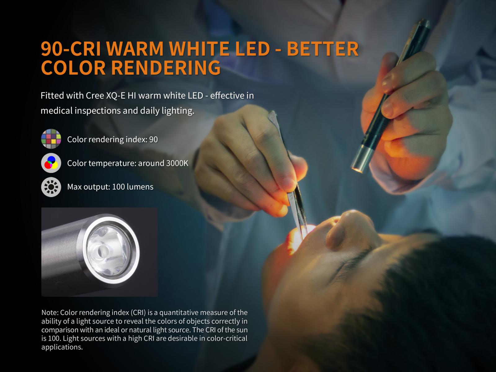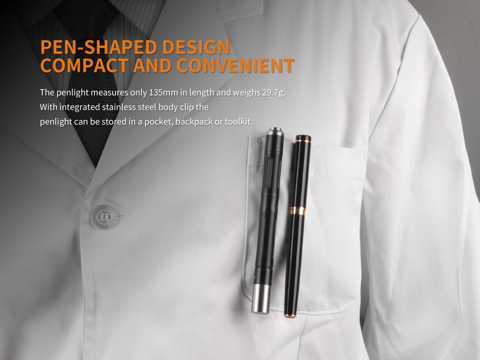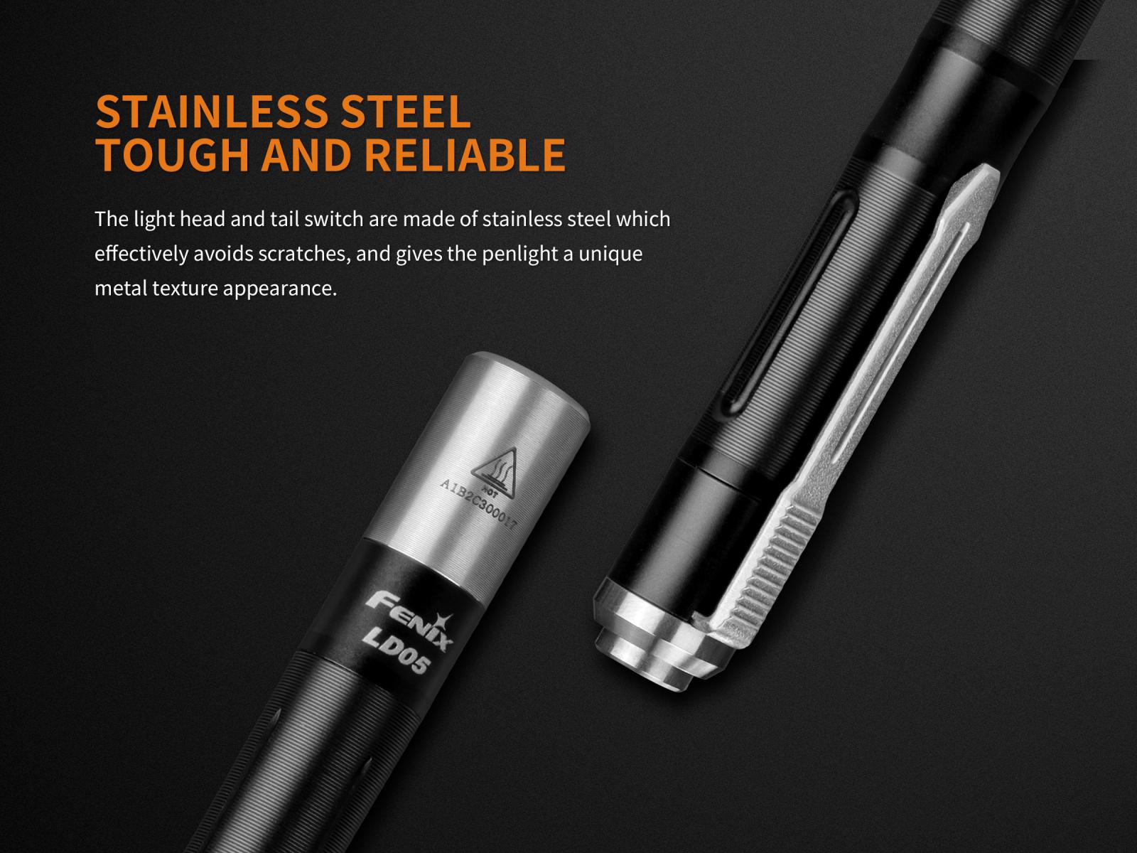 Fenix LD05 V2.0 je kompaktné LED svietidlo v tvare pera napájané dvomi mikrotužkovými AAA batériami. Ponúka svetelný tok až 100 lúmenov (ANSI) a dosvit 54 metrov. Je osadená výkonnou LED Cree XQ-E s teplejším odtieňom svetla a vysokým indexom kvality podania farieb CRI 90 (Color Rendering Index). Vďaka vernému vykresleniu farieb sa hodí napríklad na lekárske vyšetrenia.