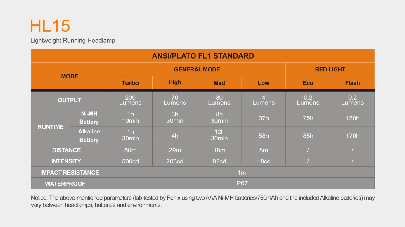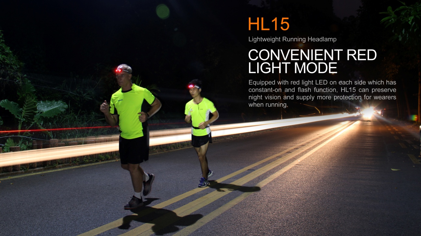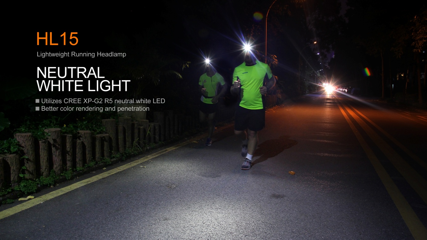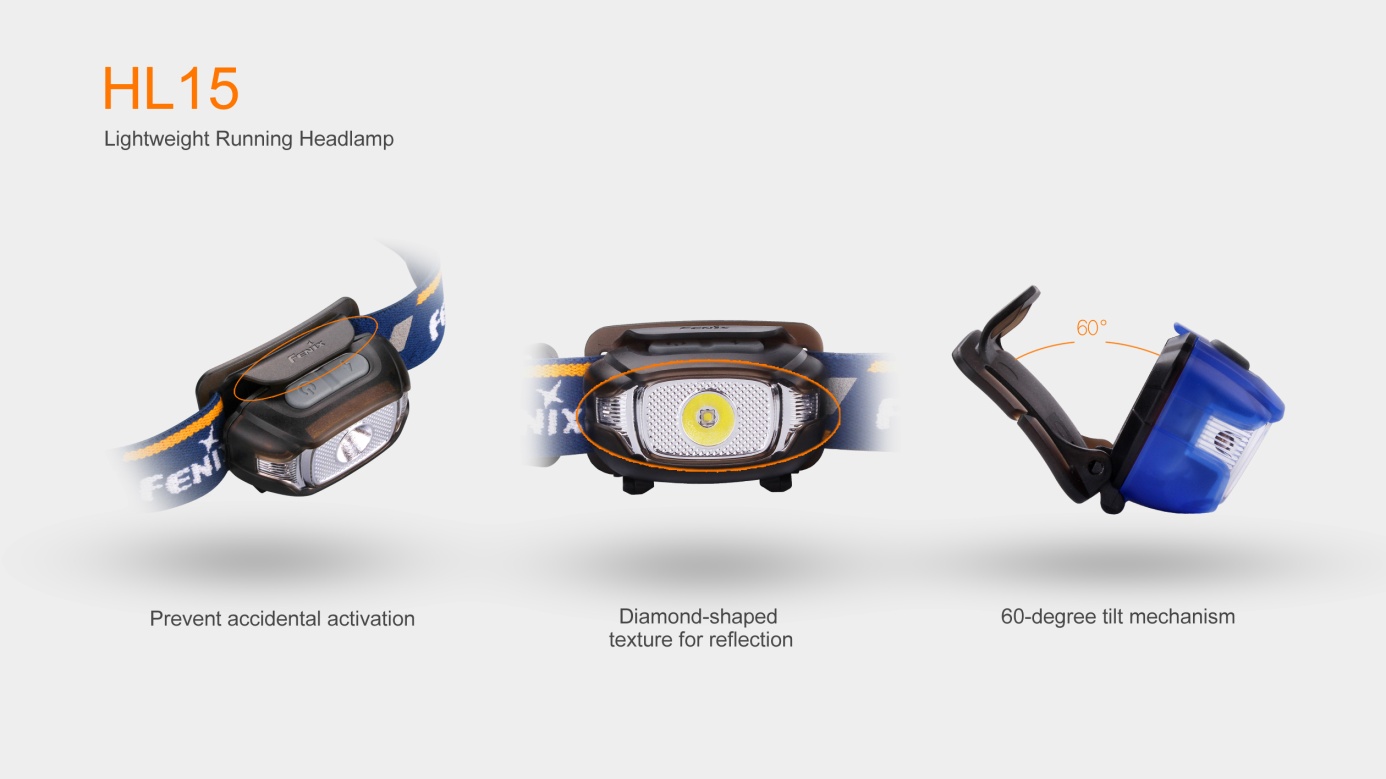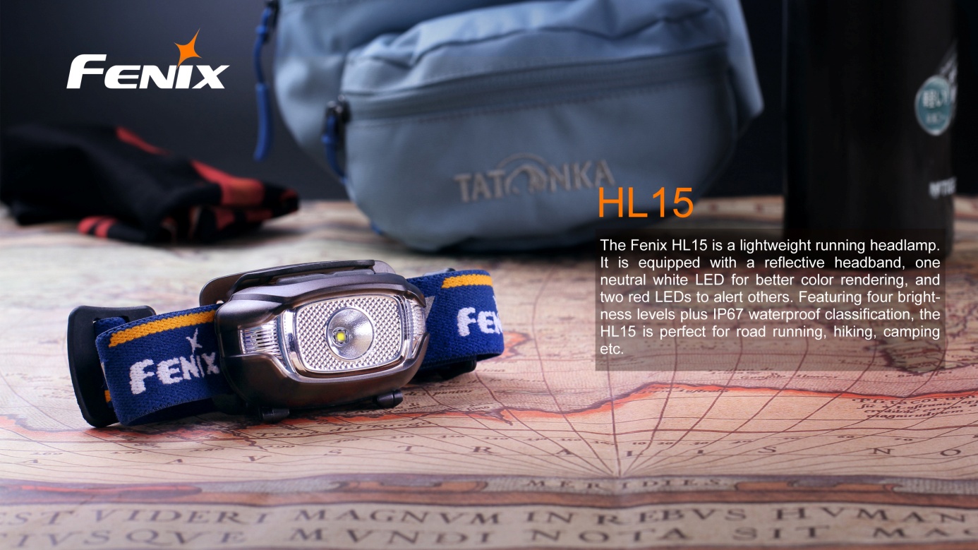 Kompaktná čelovka Fenix HL15 prináša svetelný tok až 200 lúmenov (ANSI) a dosvit 50 metrov. Napájanie zabezpečujú dve mikrotužkové AAA batérie, ktoré sa umiestňujú do vnútra čelovky. Je osadená diódou Cree XP-G2 s teplejším odtieňom svetla (neutral white). Výhodou tohto odtieňa svetla je prirodzenejšie a kontrastnejšie podanie farieb v teréne. K dispozícii je celkom 6 režimov výkonu vrátane dvoch režimov červeného svetla, ktoré nerušia adaptáciu očí na tmu. Prednosťou čelovky je aj dobrá vodeodolnosť a prachotesnosť zodpovedajúca štandardu IP67. Popruh čelovky je opatrený reflexnými prvkami, ktoré zaisťujú dobrú všesmerovú viditeľnosť bežca pri behu po ceste. Vďaka váhe iba 60 gramov tak Fenix HL15 výborne poslúži ako bežecká čelovka, čelovka na kempovanie aj turistiku a červené LED iste ocenia astronómovia.
