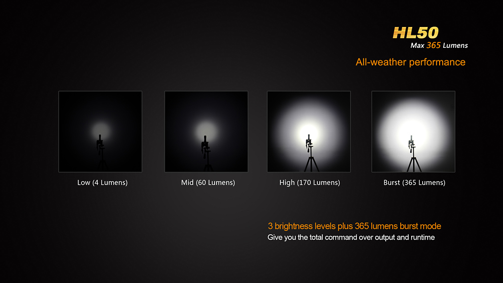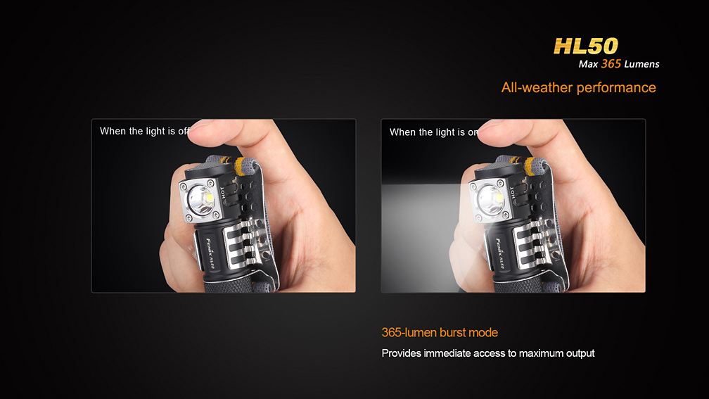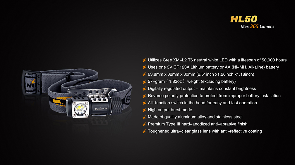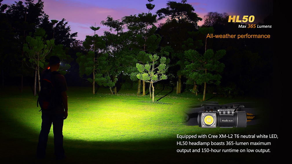 Kompaktná LED čelovka Fenix HL50 prináša mimoriadny výkon až 365 lúmenov (ANSI) a dosvit do vzdialenosti 77 metrov. K napájaniu možno použiť buď 3V lítiovú batériu CR123A alebo po naskrutkovaní nástavca (súčasť balenia) i bežnú tužkovú AA batériu. Svetelným zdrojom je špičková LED Cree XM-L2 T6 s teplejším odtieňom svetla (neutral white).