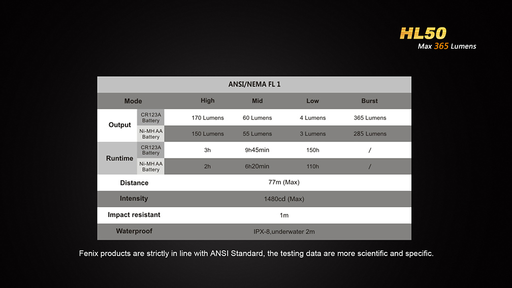 Všetky parametre svietidla (svetelný tok, doba svietenia na batérie, vodotesnosť, dosvit a nárazuvzdornosť) sú merané v súlade s normou ANSI/NEMA FL 1-2009 Flashlight Basic Performance Standard.