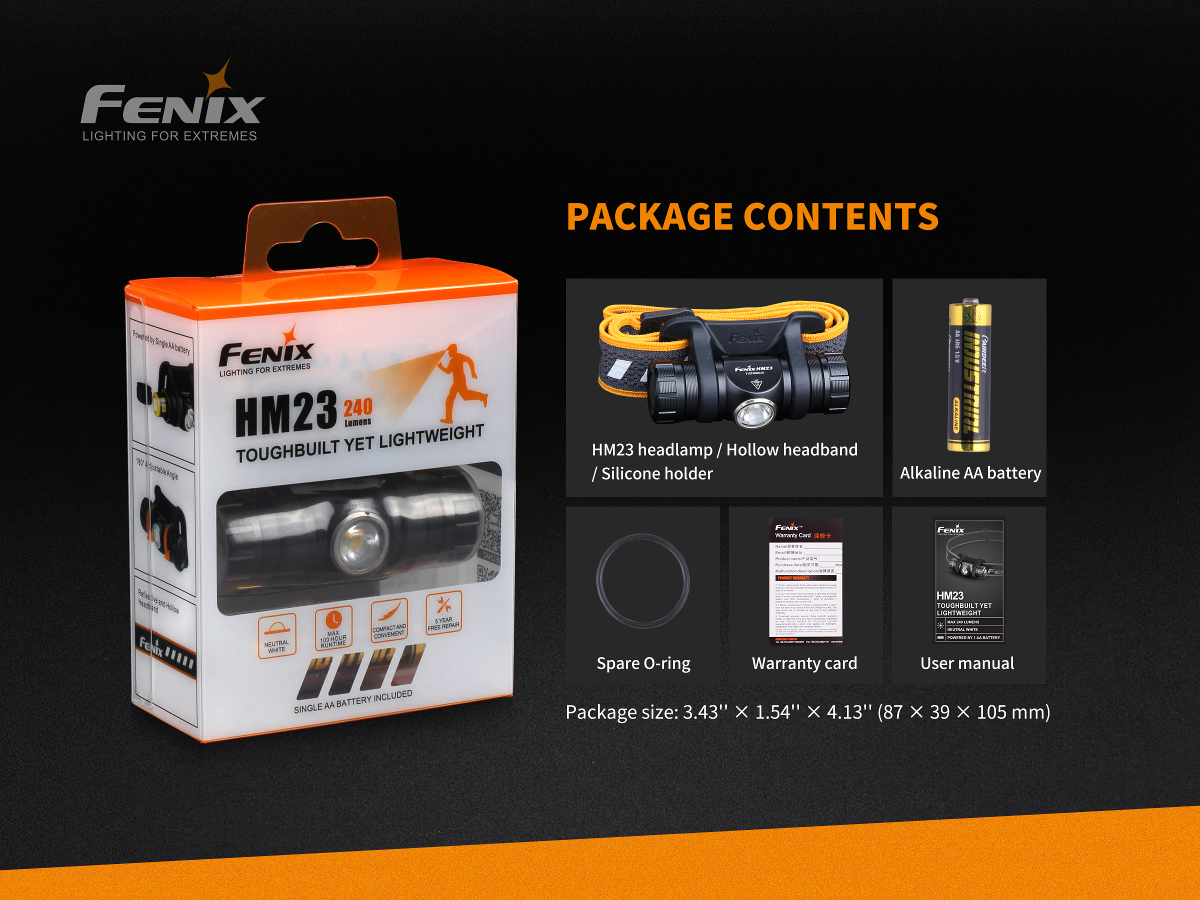 Kompaktná LED čelovka Fenix HM23 ponúka svetelný tok až 240 lúmenov (ANSI) a dosvit 53 metrov. Na napájanie je použitá jedna tužková AA batéria, s ktorou dosahuje výdrž až 100 hodín v najnižšom režime (viac ako 4 dni). Svetelným zdrojom je špičková Cree LED s teplejším odtieňom svetla (neutral white). Výhodou tohto odtieňa svetla je prirodzenejšie a kontrastnejšie podanie farieb v prírode. Vďaka precíznemu prevedeniu tela z hliníkovej zliatiny a držiaku z odolného silikónu je HM23 nárazuvzdorná pádom z výšky až 2 metre a tiež plne prachotesná a vodotesná podľa štandardu IP68. Čelovka ponúka celkom tri režimy výkonu a elektroniku s funkciou predĺženia výdrže, v režimoch 240 a 70 lúmenov postupne znižuje výkon pre dosiahnutie dlhšej doby svietenia (viz. graf výdrží v jednotlivých režimoch).