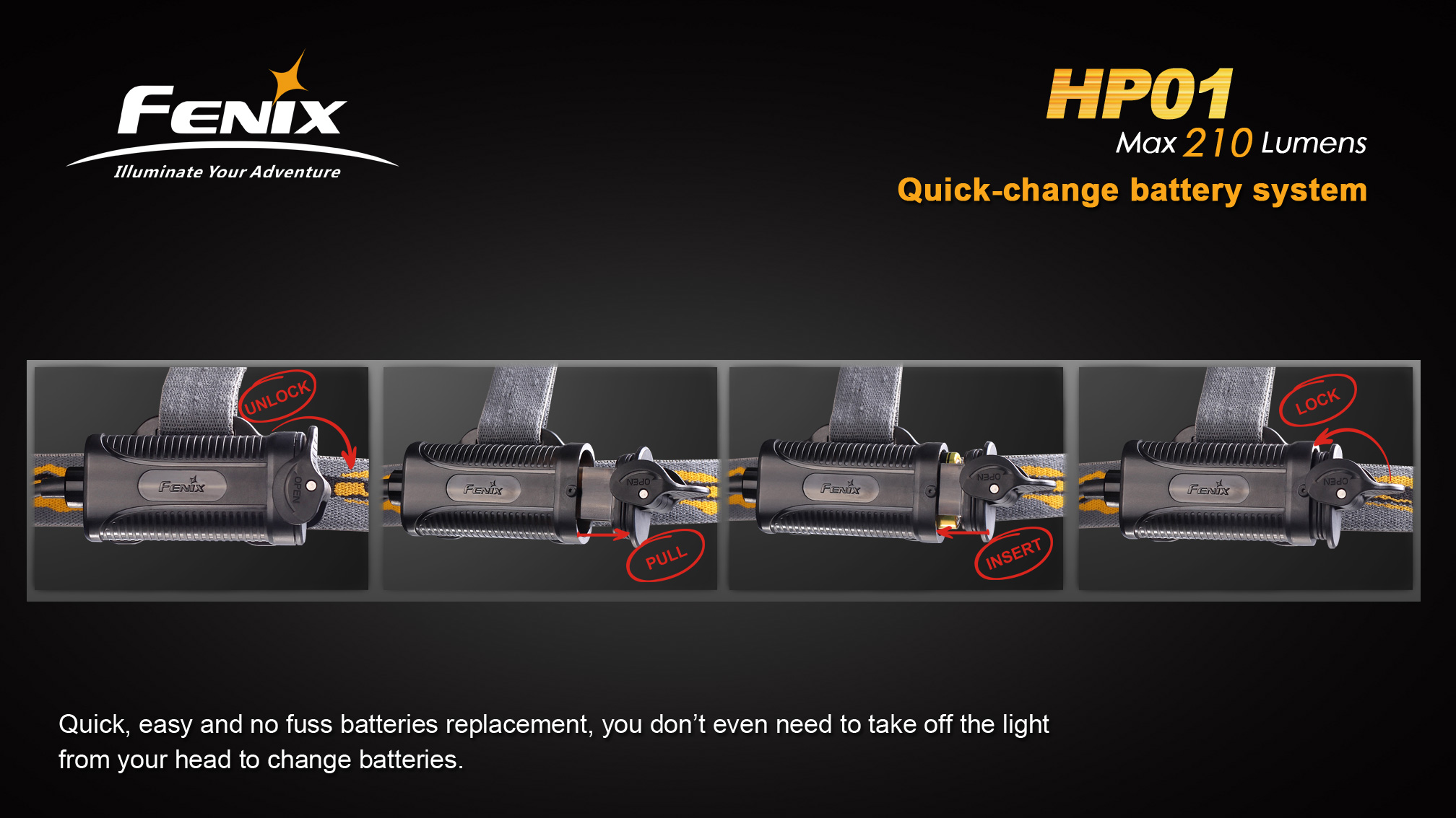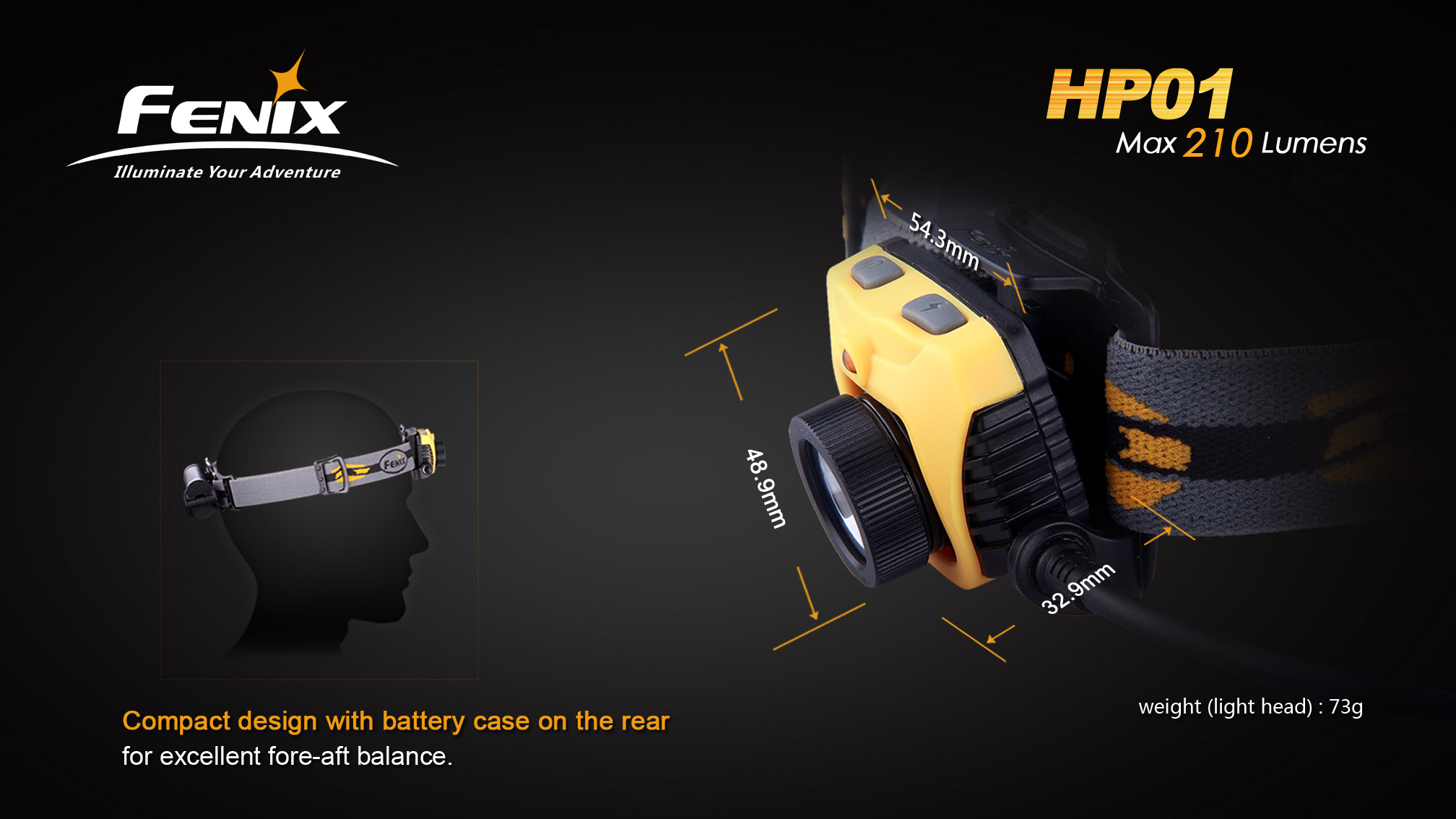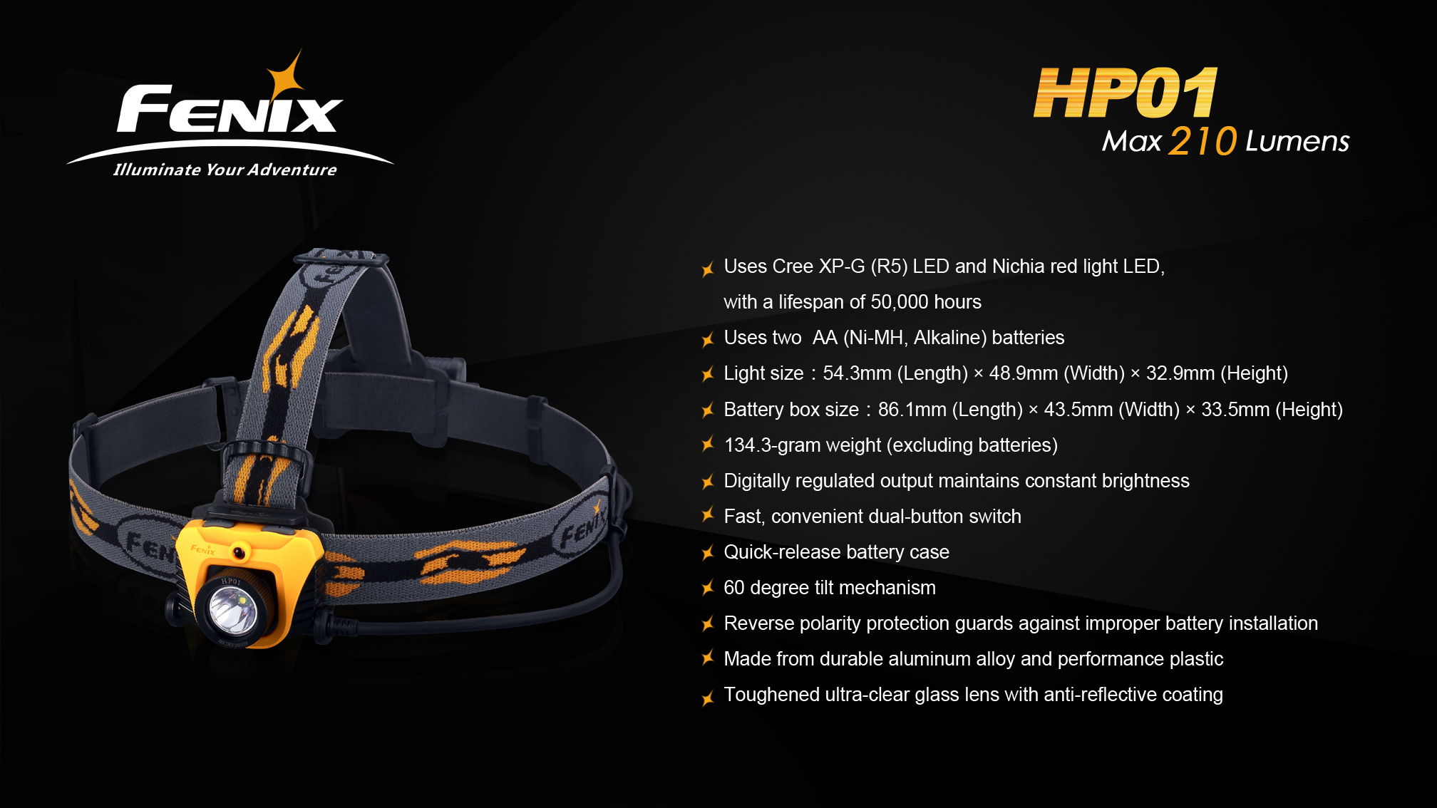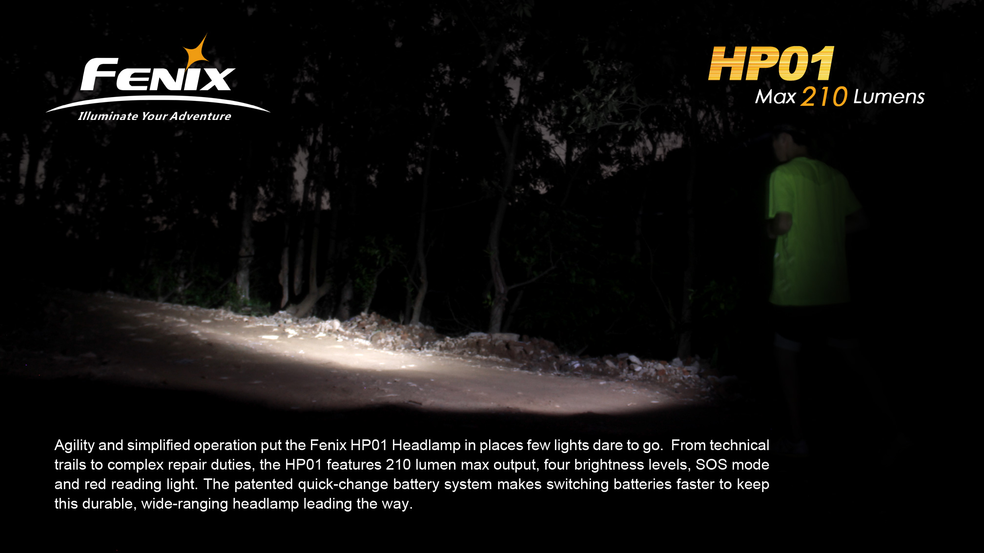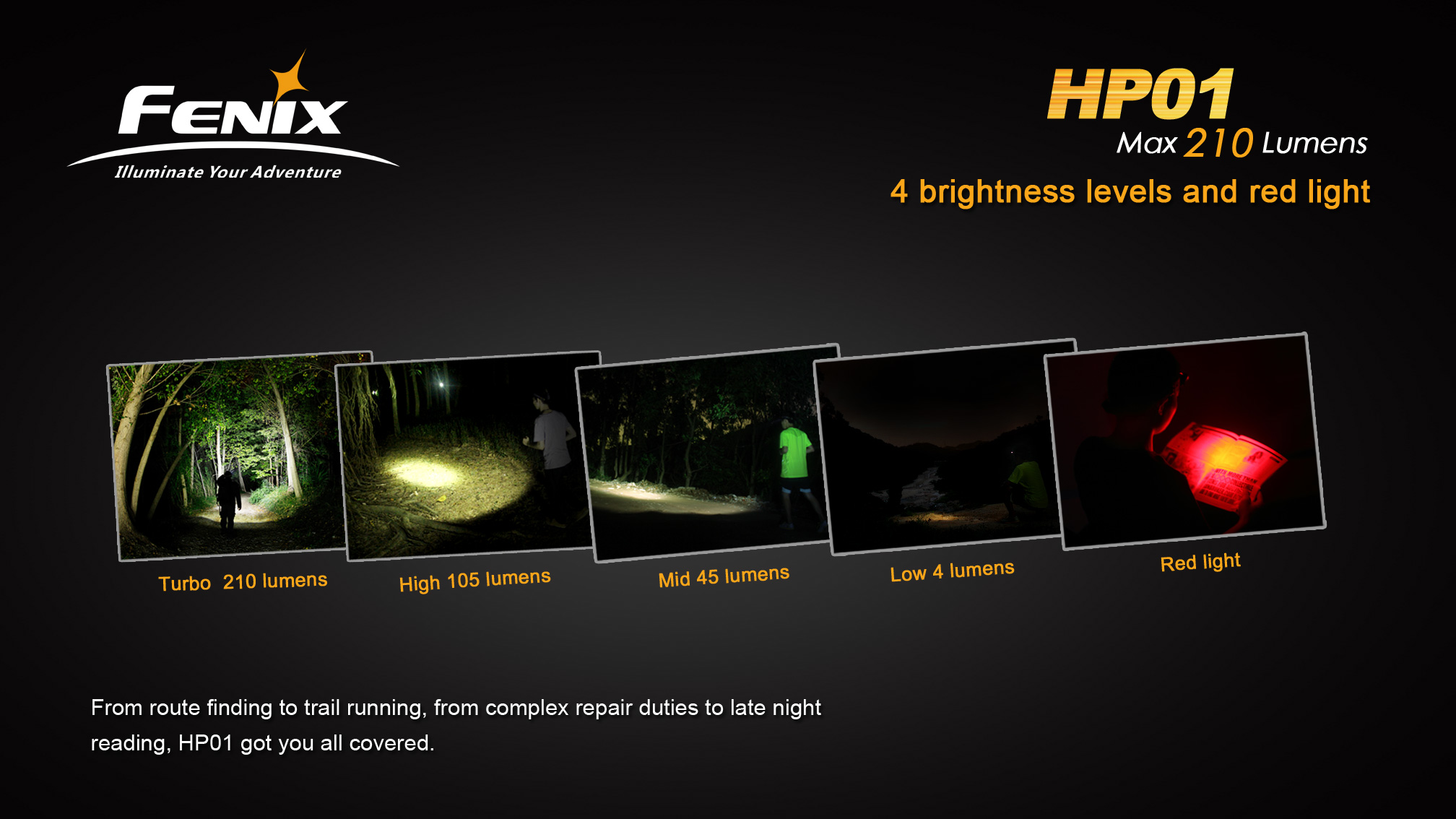 Fenix HP01 je ľahká outdoorová čelovka so svetelným výkonom až 210 lúmenov a dosvitom až 95 metrov. Na napájanie používa dve tužkové batérie, ktoré sú umiestnené v puzdre na zátylku. V najúspornejšom režime vydrží svietiť viac ako päť dní v kuse. Okrem hlavného bieleho svetla je u tejto čelovky k dispozícii aj červené svetlo zabraňujúce oslneniu. Fenix HP01 výborne poslúži na večerné behanie, kempovanie aj turistiku a červenú LED ocenia aj astronómovia.