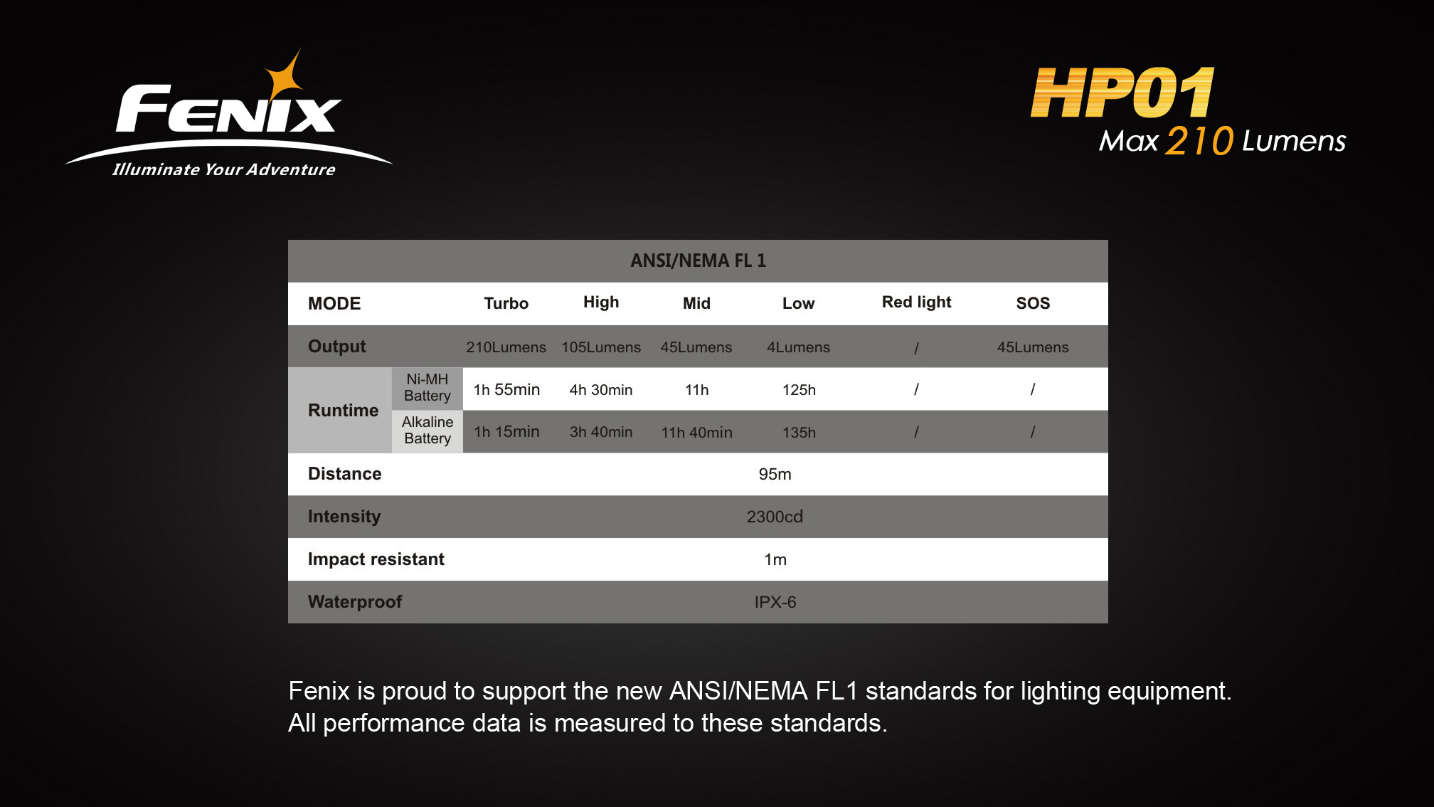 Všetky parametre svietidla (svetelný tok, doba svietenia na batérie, vodotesnosť, dosvit a nárazuvzdornosť) sú merané v súlade s normou ANSI/NEMA FL 1-2009 Flashlight Basic Performance Standard.
