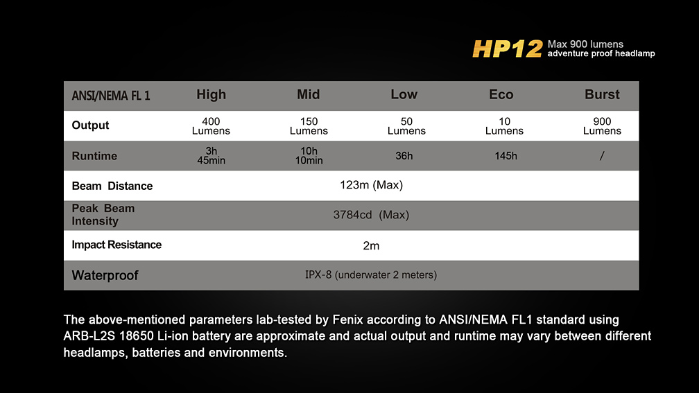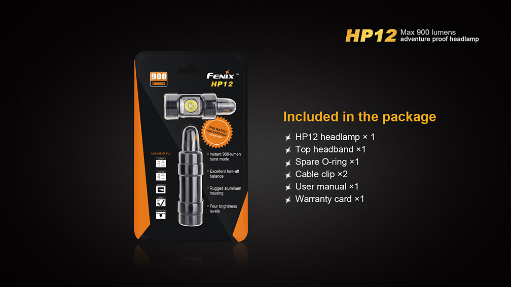Fenix HP12 sa radí k extrémne výkonným čelovkám, vďaka svetelnému toku až 900 lúmenov a dosvitu do vzdialenosti 123 metrov. Batérie sú umiestnené v puzdre na zátylku a možno použiť buď dve lítiové CR123A alebo jeden vysokokapacitný li-ion akumulátor typu 18 650. Svetelným zdrojom je špičková LED Cree XM-L2 s účinnosťou až 180 lúmenov na Watt. Vďaka odolnému prevedeniu tela i batériového puzdra z hliníkovej zliatiny je HP12 nárazuvzdorná pádom z výšky až 2 metre a taktiež plne prachuvzdorná a vodotesná podľa štandardu IP68. K dispozícii je celkom 5 režimov výkonu s výdržou slušných 145 hodín prevádzky. Čelovka je napájaná digitálne regulovaným konštantným prúdom pre zaručenie stáleho svetelného výkonu i pri znižovaní napätia v batériách (pri ich pozvoľnom vybíjaní). Fenix HP12 je primárne určená pre rôzne športové aktivity, ako napríklad bežecké lyžovanie, nočný beh, cyklistiku, rybárčenie, speleológiu a veľa ďalších.