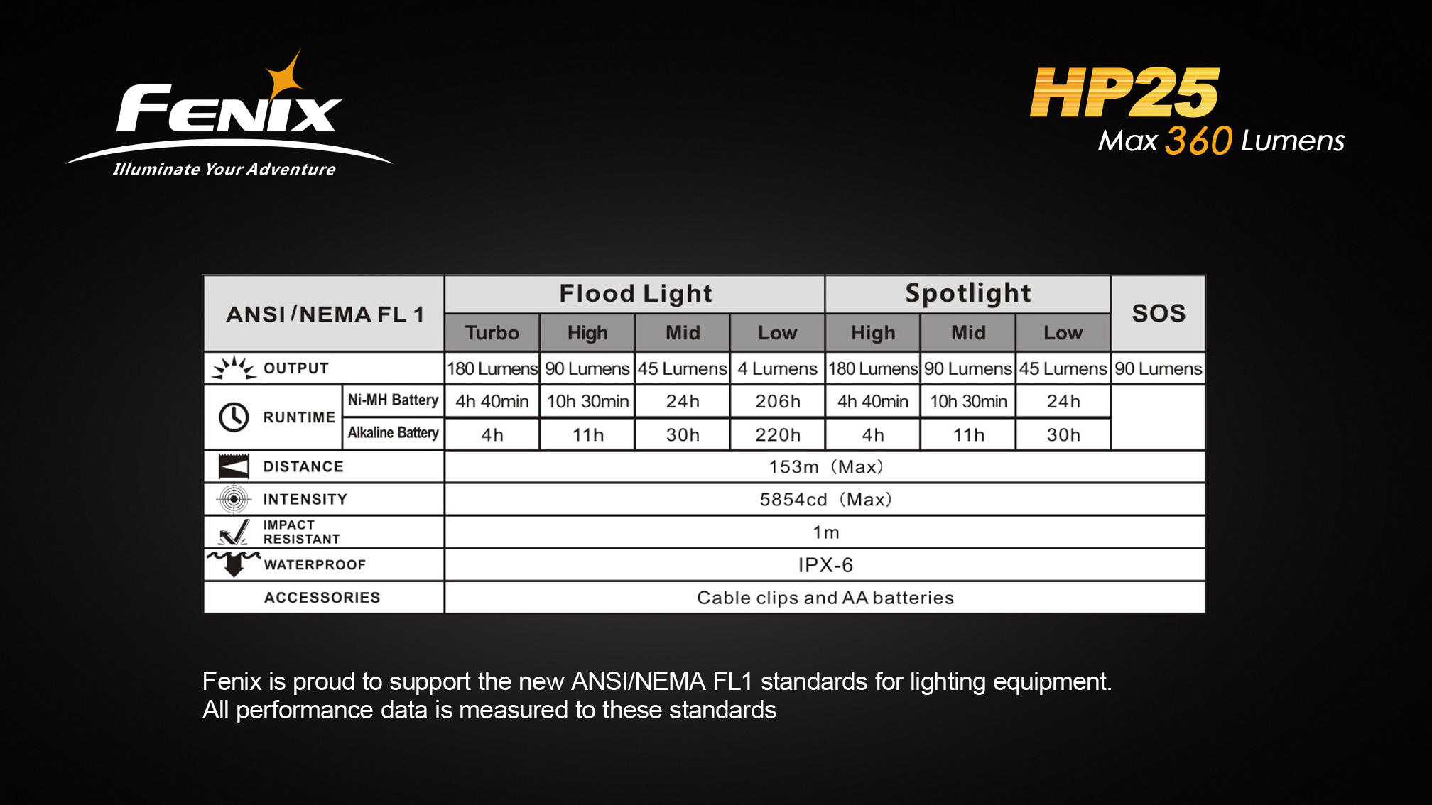 Všetky parametre svietidla (svetelný tok, doba svietenia na batérie, vodotesnosť, dosvit a nárazuvzdornosť) sú merané v súlade s normou ANSI/NEMA FL 1-2009 Flashlight Basic Performance Standard.