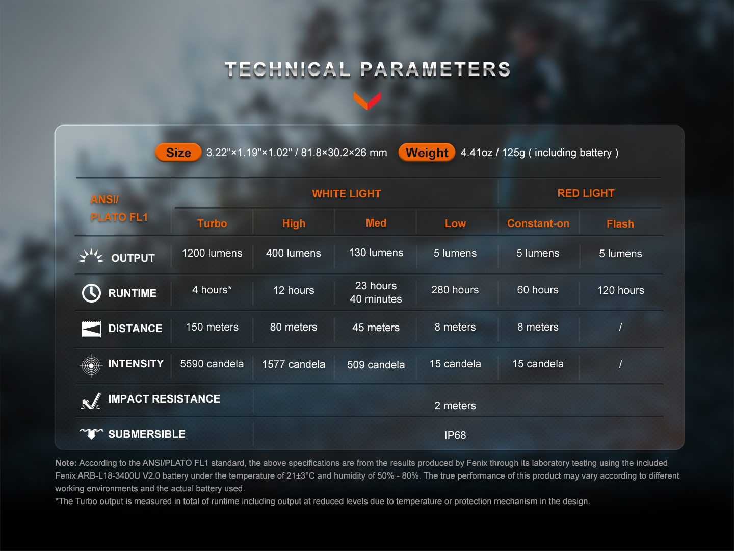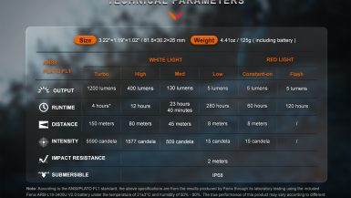 Všetky parametre svietidla (svetelný tok, doba prevádzky na batérie, vodotesnosť, dosvit a nárazuvzdornosť) sú zmerané v súlade s normou ANSI/NEMA FL 1-2009.