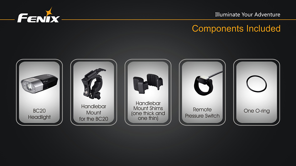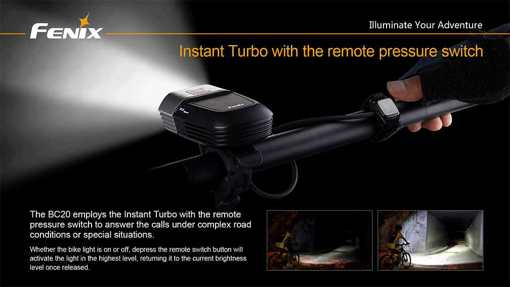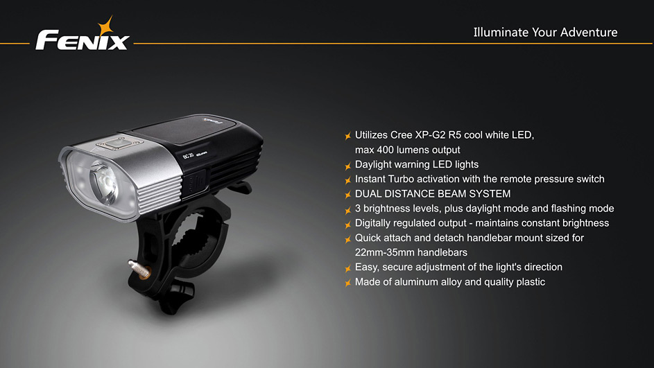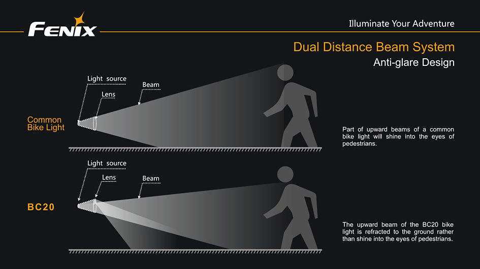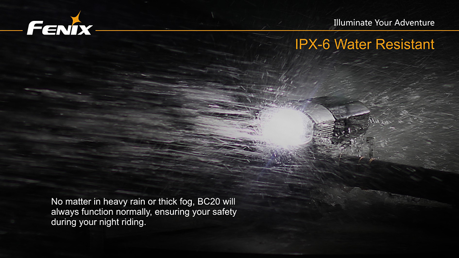 Cyklo svetlo Fenix BC20 prináša svetelný tok 400 lúmenov (ANSI), k napájaniu využíva štyri tužkové batérie AA. Ako svetelný zdroj slúži výkonná LED Cree XP-G2 R5 a štyri vysoko jasné diódy s životnosťou 50 000 hodín. Svetlo používa novo vyvinutú technológiu dvojitého smerovania svetla „Dual Distance Beam System“, ktorá pomáha vzniku svetelného kužeľa, ktorý plynulo osvetľuje celý priestor pred bicyklom a to i v miestach, kam bežne predávané cyklistické svetlá nedosiahnu.