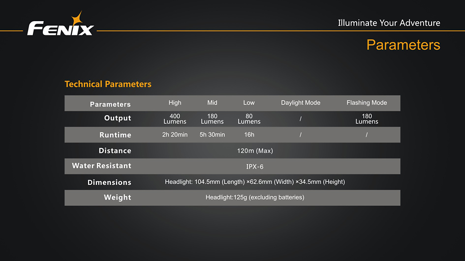 | Výkon (lúmeny) | 80 | 180 | 400 | 180 | 120 m | 3 600 cd | 1 m | IPX6, prudký dážď | 104,5 mm | 62,6 mm | 34,5 mm | 125 g (bez batérií) |