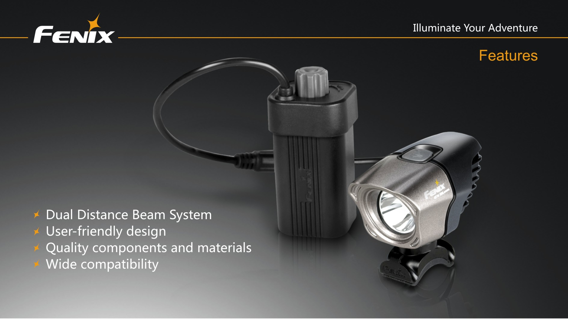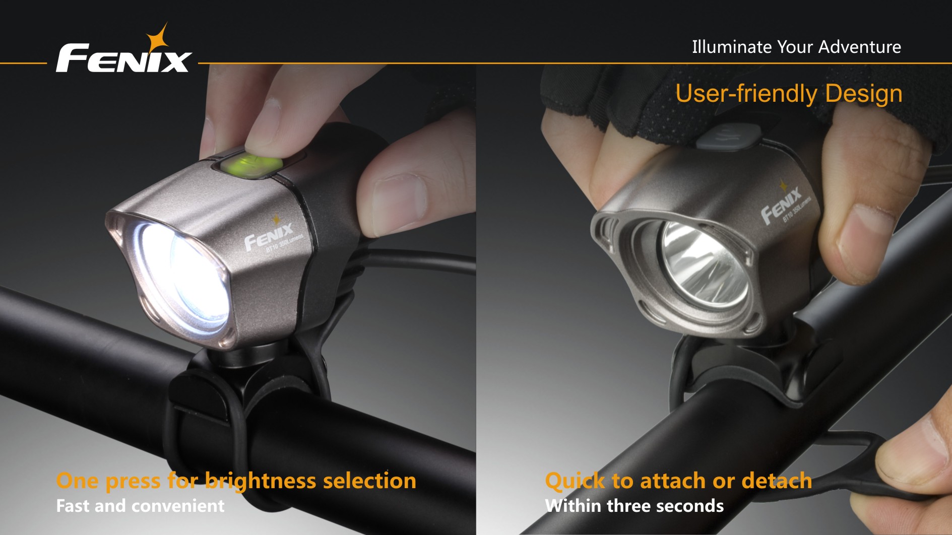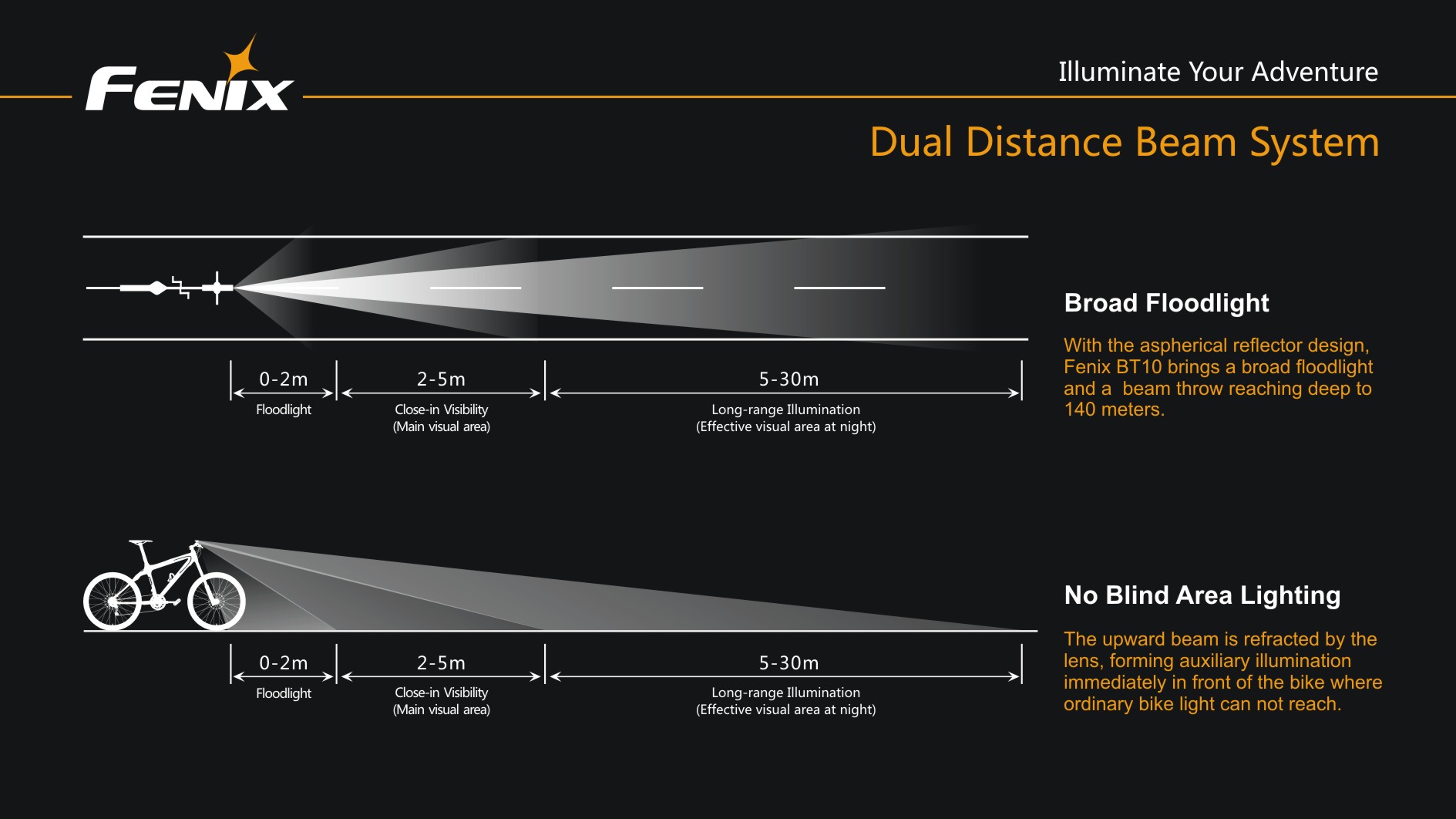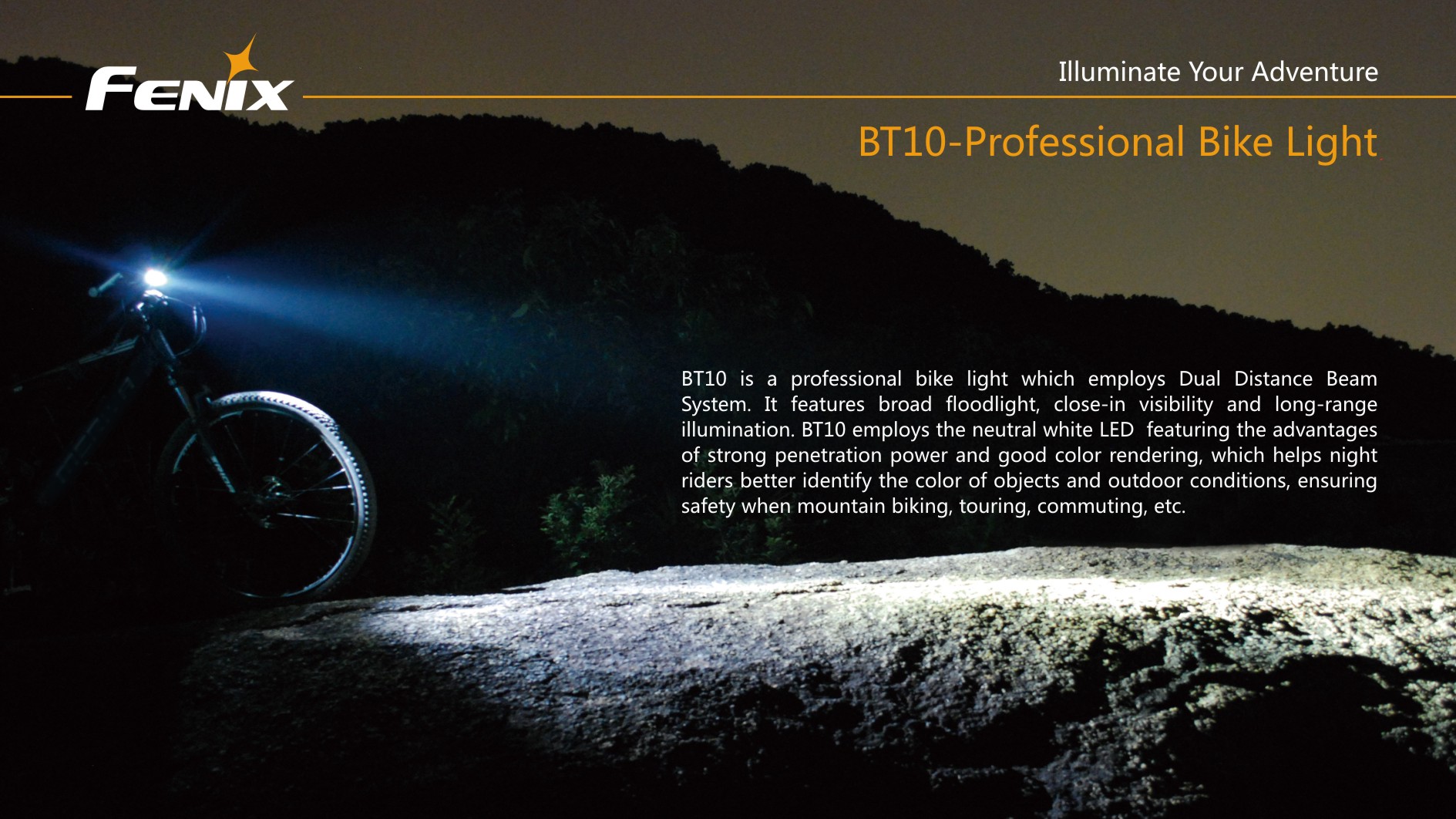 Cyklistické svetlo Fenix BT10 ponúka svetelný tok až 350 lúmenov (ANSI), je napájané štyrmi tužkovými batériami (alkalické, lítiové či nabíjacie NiMH). Svetelným zdrojom je výkonná dióda Cree XP-G s teplejším odtieňom svetla (neutral white), ktorá poskytuje prirodzenejšie a kontrastnejšie podanie farieb v teréne. Svietidlo používa novo vyvinutú technológiu dvojitého smerovania svetla „Dual Distance Beam System“, ktorá pomáha rozdeleniu svetelného kužeľu tak, že plynule osvetľuje celý priestor pred predným kolesom bicykla a to aj v miestach, kam bežné predávané cyklistické svietidlá nedosiahnu.
