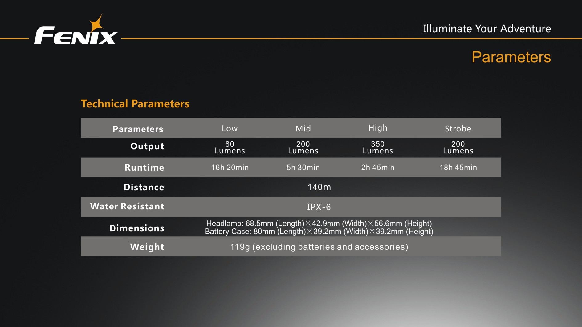 | Výkon (lúmeny) | 80 | 200 | 350 | 200 | 140 m | 4 900 cd | 1 m | IPX6, prudký dážď | 68,5 mm | 42,9 mm | 56,6 mm | 119 g (bez batérií) |