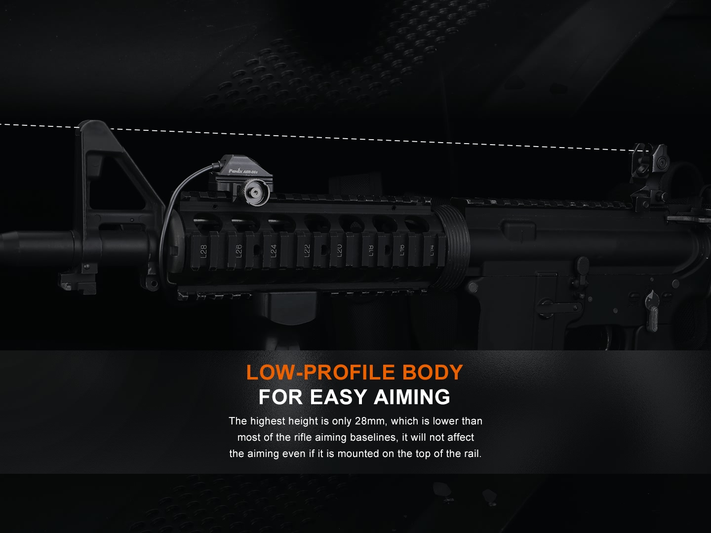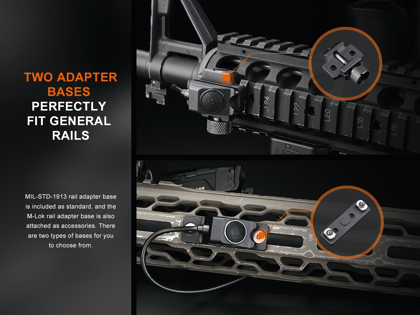 Taktický káblový spínač AER-06S ku svietidlu Fenix GL19R slúži na použitie svietidla na dlhej zbrani. Kábel sa so svietidlom prepojí prostredníctvom USB-C portu. Na druhom konci kábla je umiestnené bezhlučné tlačidlo. Spínač je možné vďaka priloženému príslušenstvu umiestniť na zbraňovú lištu Picatinny MIL-STD-1913 aj rozhranie M-LOK.