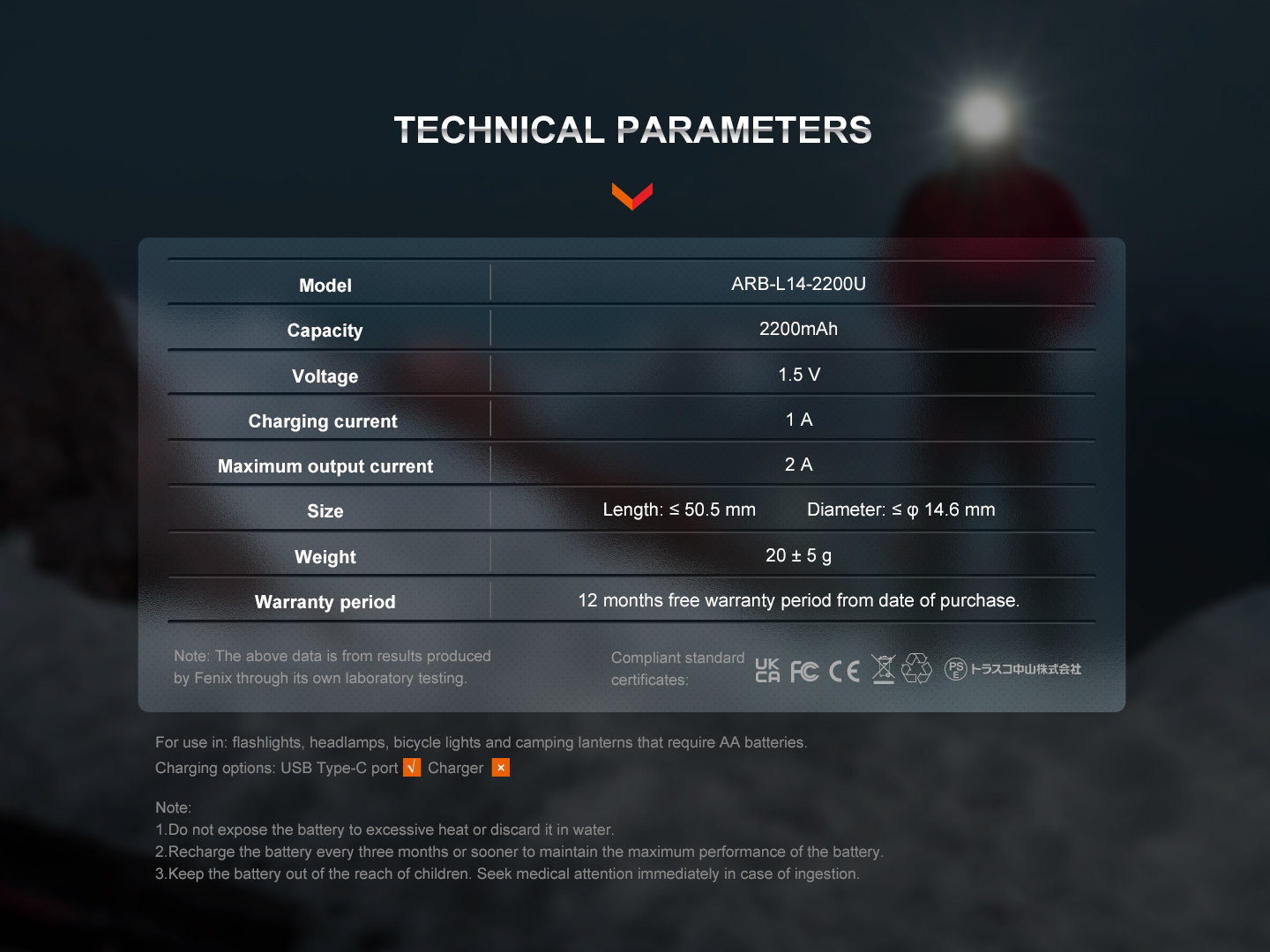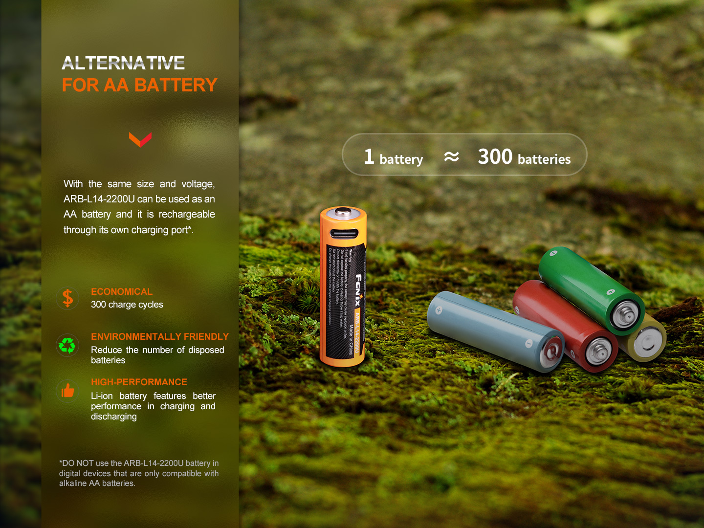 Dobíjateľná batéria Fenix ARB-L14-2200U slúži ako náhrada klasických ceruzkových AA batérií. Vnútri sa jedná o Li-ion článok, ktorý je vybavený regulačnou elektronikou, ktorá prvých 70-80% kapacity drží pevné výstupné napätie 1,5 V a potom drží konštantných 1,2 V až do vybitia. Akumulátor je teda obzvlášť vhodný do prístrojov, ktoré sú citlivé na výšku napätia a napríklad s nabíjacími NiMH nepracujú správne, alebo len po krátku dobu. Kapacita akumulátora je 2200 mAh (3,3 Wh čo zodpovedá kapacite 2750 mAh pri NiMH).