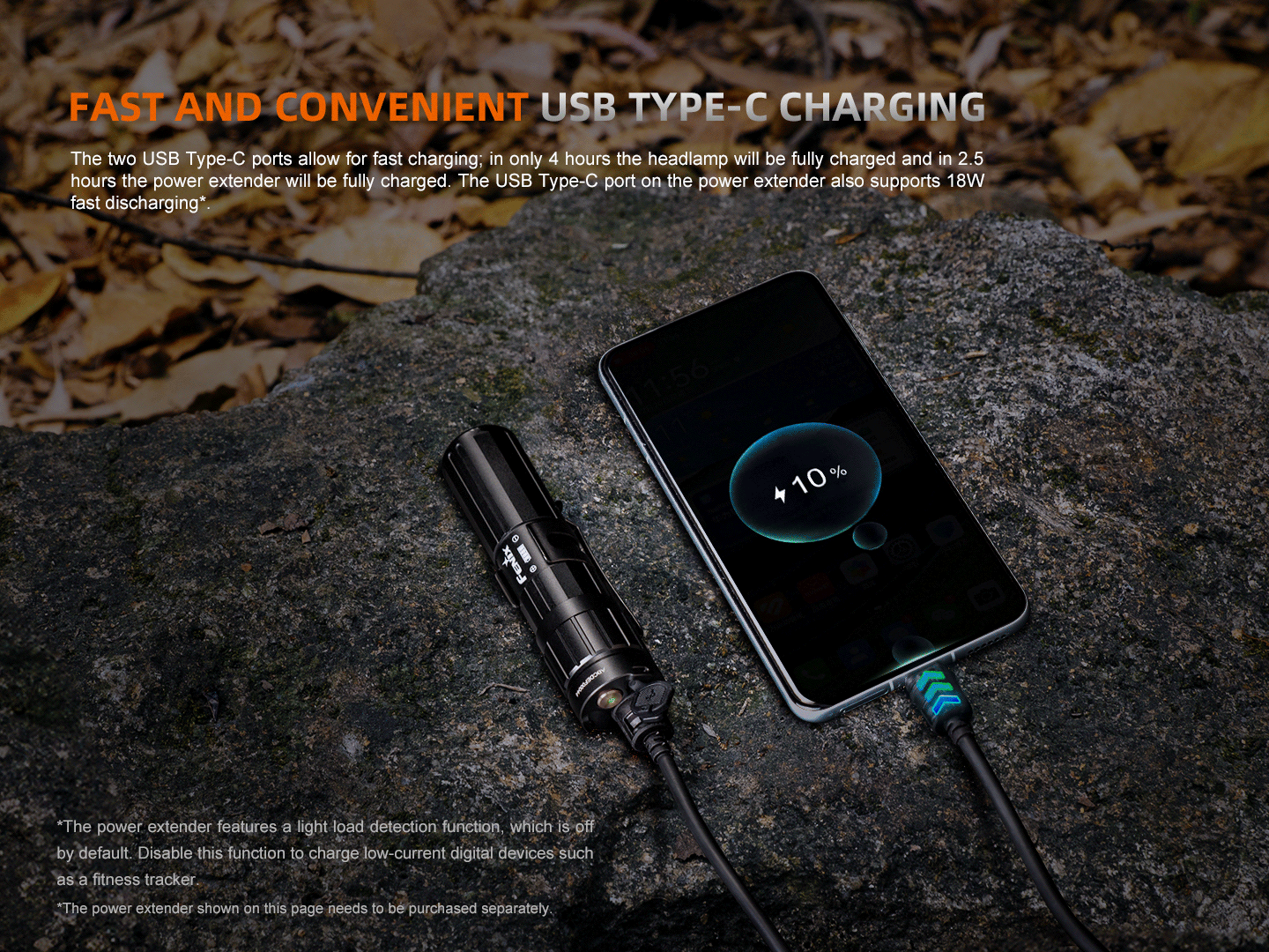 Funkcia powerbanky – Odklopte protiprachovú krytku a zapojte nabíjací USB-C kábel do nabíjacieho portu na puzdre. Jedným stlačením tlačidla na batériovom puzdre sa zapne funkcia powerbanky. Ak je powerbanka zapnutá, tak sa stlačením tlačidla opäť vypne. Po výmene batérie v batériovom puzdre sa funkcia powerbanky zapne automaticky, ak je pripojené k čelovke. Powerbanka podporuje tieto rýchlonabíjacie protokoly: PD3.0/PD2.0, QC3.0/QC2.0, FCP, SFCP, PE2.0/PE1.1