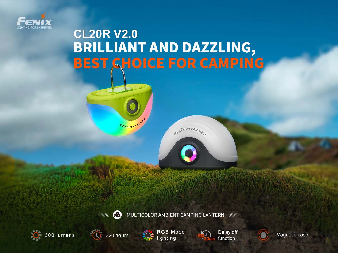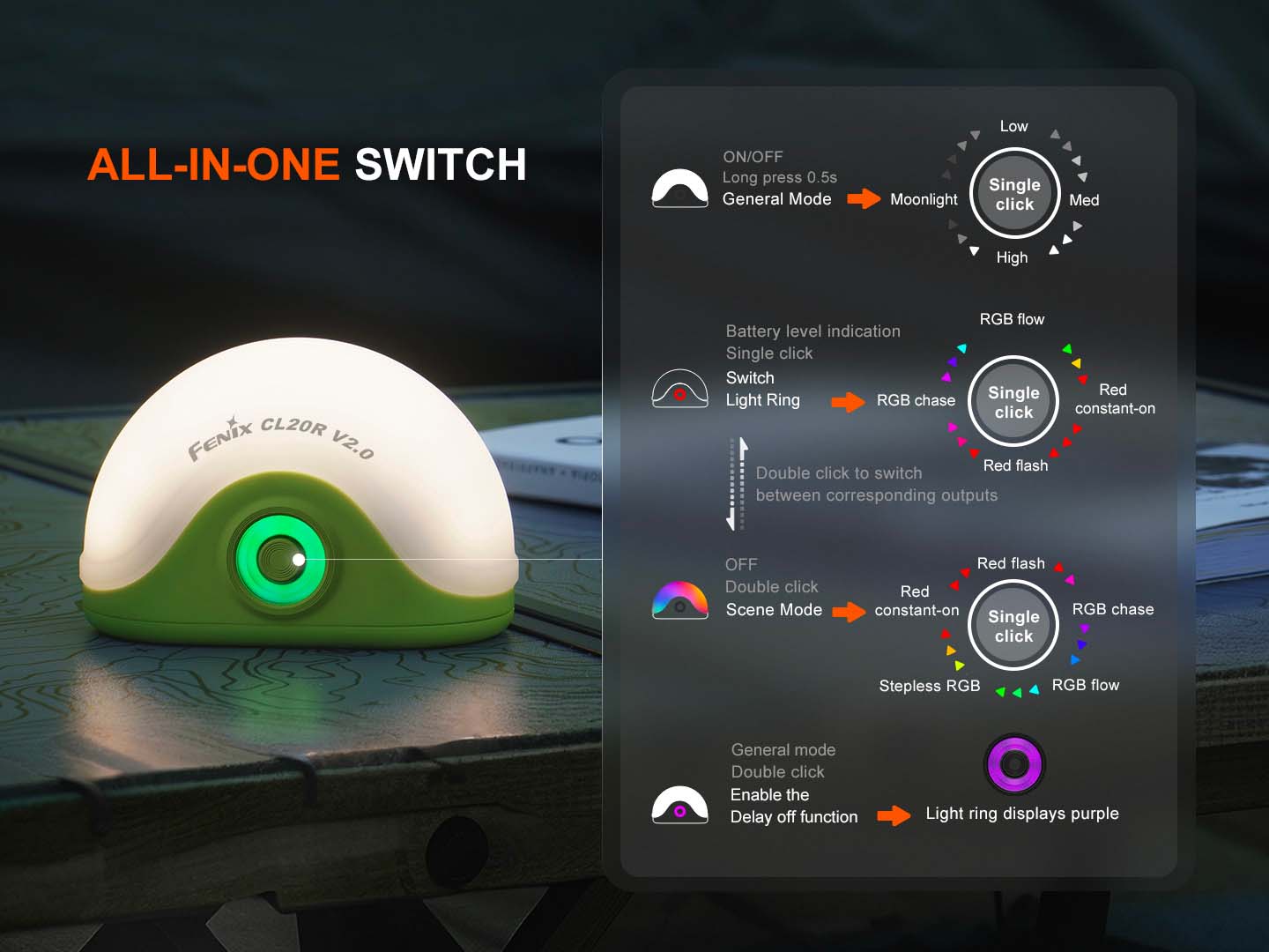 Prepínanie spôsobov svietenia – Funkcia odloženého vypnutia: Ak je lucerna zapnutá do režimov bieleho svetla, dvakrát rýchlo stlačte spínač, tým sa aktivuje funkcia odloženého vypnutia. Svetelný prstenec spínača sa rozsvieti na fialovo a lucerna sa po 20 minútach sama vypne. Ak je lucerna zapnutá do farebných režimov svietenia alebo má aktívny farebný prstenec, tak medzi týmito dvoma spôsobmi svietenia sa prepína dvojitým stlačením spínača. Ak je aktívny režim plynulej zmeny farieb, potom dvojitým stlačením spínača pozastavíte aktuálnu farbu alebo opäť obnovíte plynulú zmenu farieb.