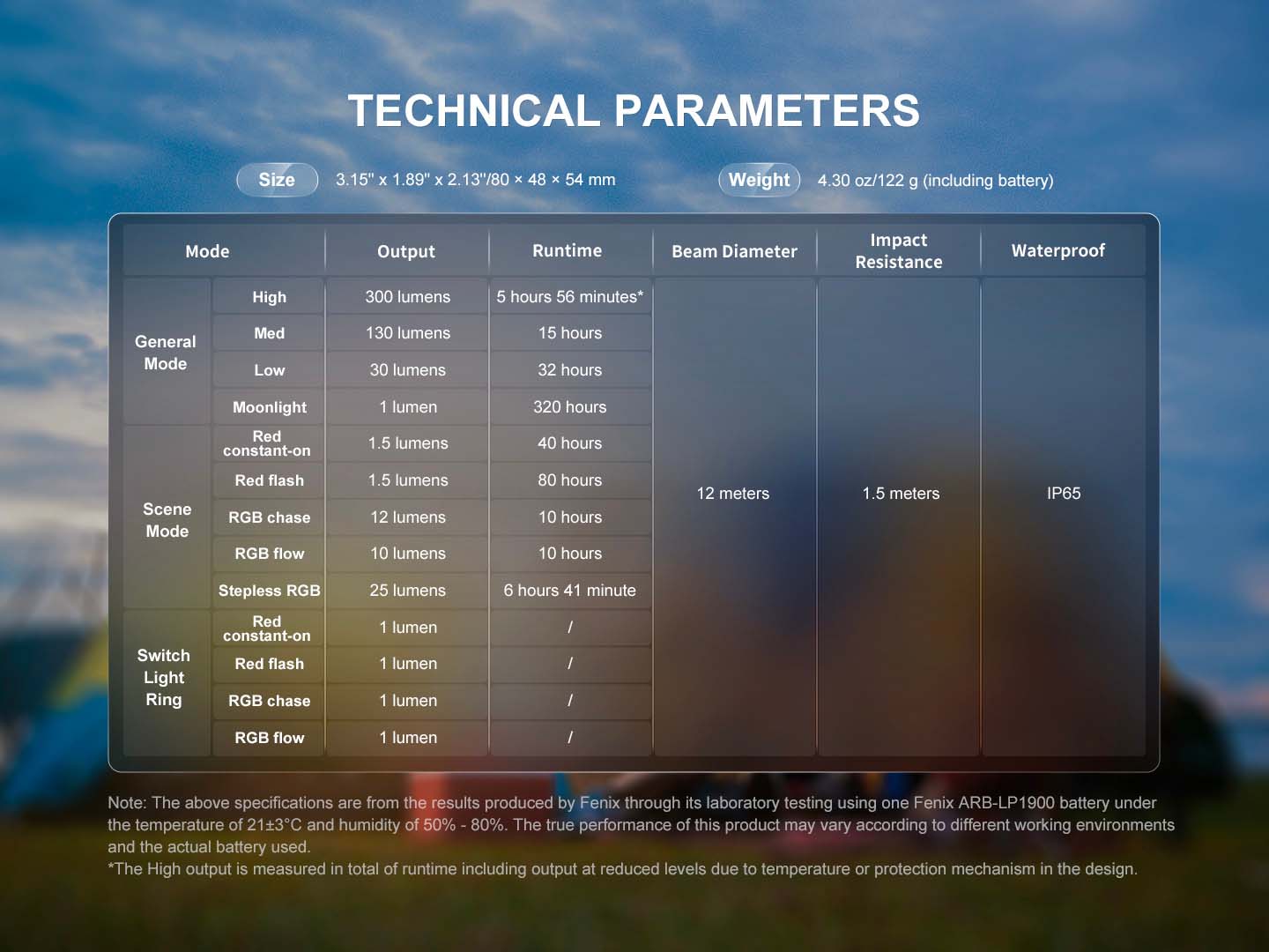 Indikácia stavu batérie – Po každom zapnutí, alebo stlačení spínača pri vypnutej lucerne sa na 3 sekundy zobrazí stav batérie na svetelnom prstenci spínača. Ak prstenec svieti na zeleno je batéria nabitá na viac ako 85 %. Zelené blikanie znamená 50-85 % kapacity. Ak svieti na červeno, je nabitá na 25-50 %. Červené blikanie značí, že zostáva menej ako 25 % kapacity batérie. Táto funkcia je aktívna len s originálnou batériou Fenix ARB-LP1900.