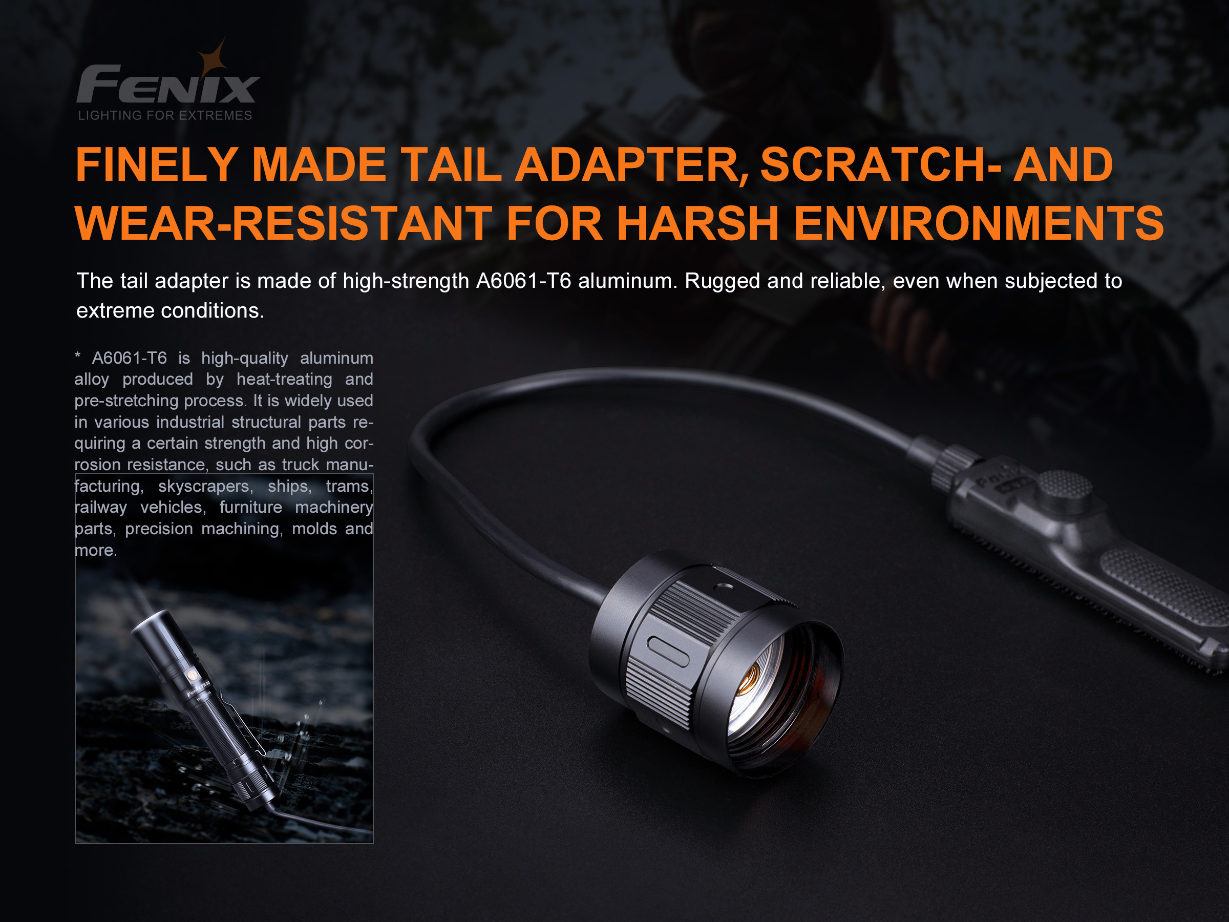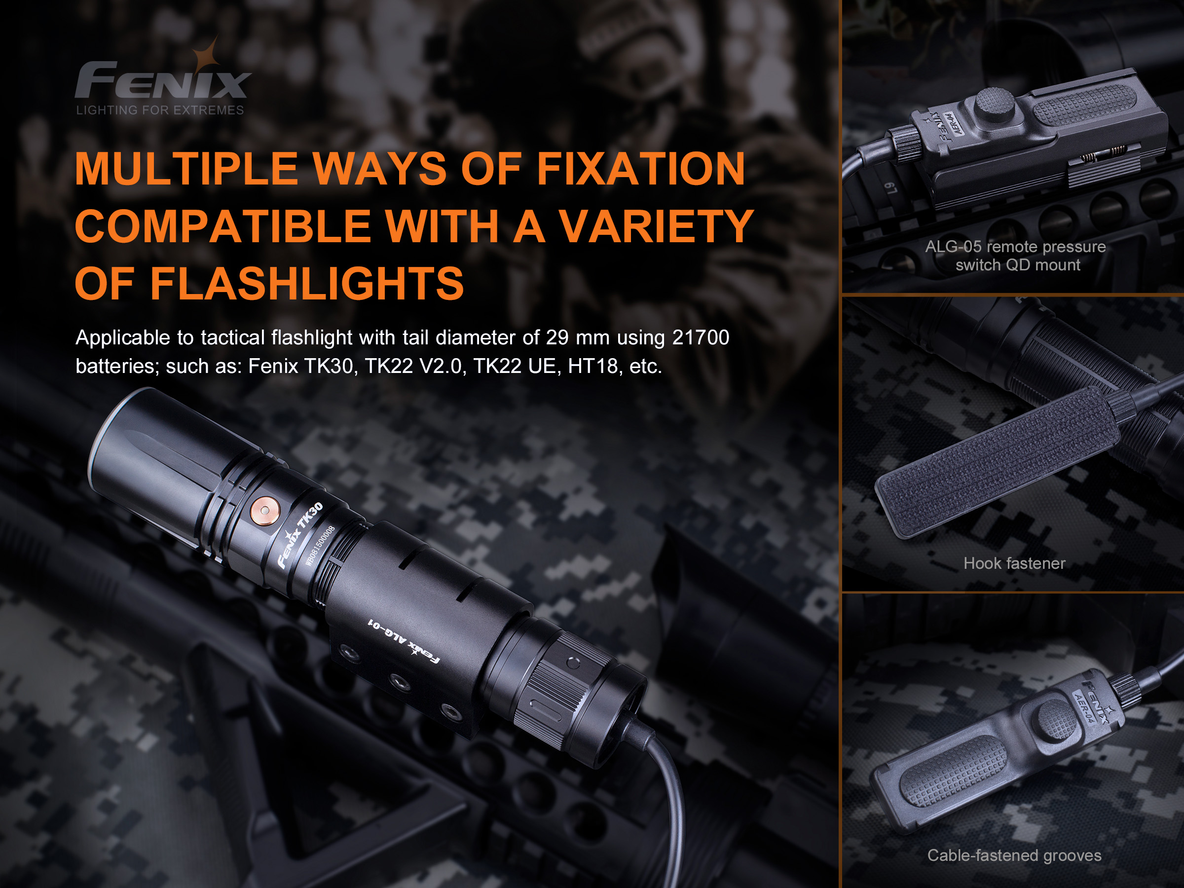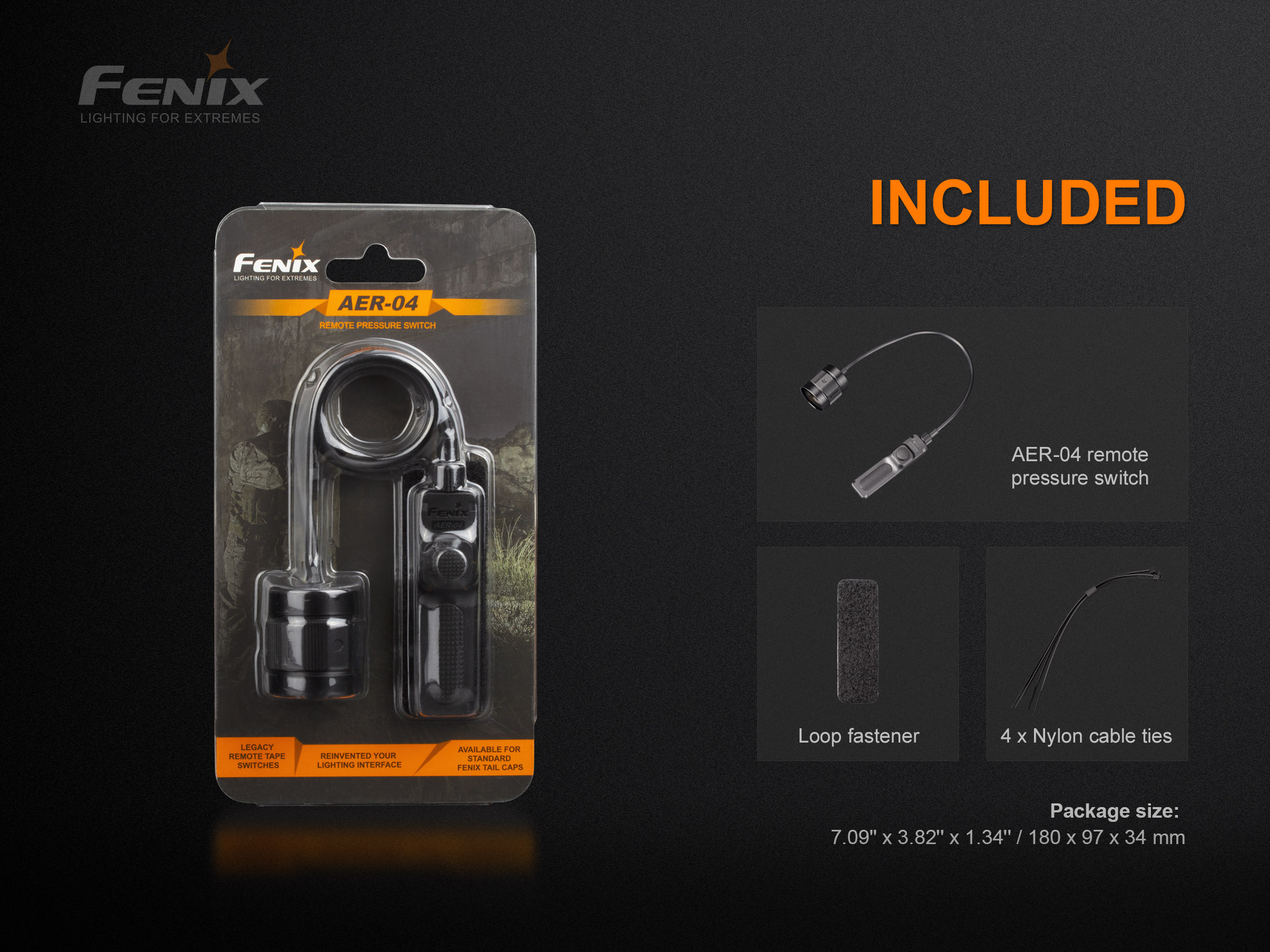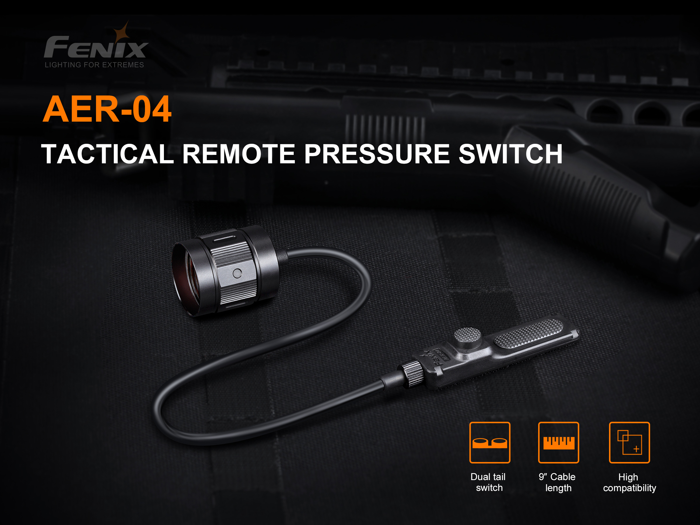 Taktický káblový spínač AER-04 pre svietidlá Fenix HT18, TK22 V2.0 a TK22 UE (na staršie TK22 nepasuje). Vhodný na použitie so svietidlom na dlhej zbrani. Na konci kábla je tlačidlo pre trvalé rozsvietenie a plochý tlakový spínač s funkciou okamžitej aktivácie. Tlakom na plochý spínač sa svietidlo rozsvieti a pri pustení zhasne. Spínač je navyše doplnený suchým zipsom, čo vám pomôže s jeho umiestnením kamkoľvek na zbrani.