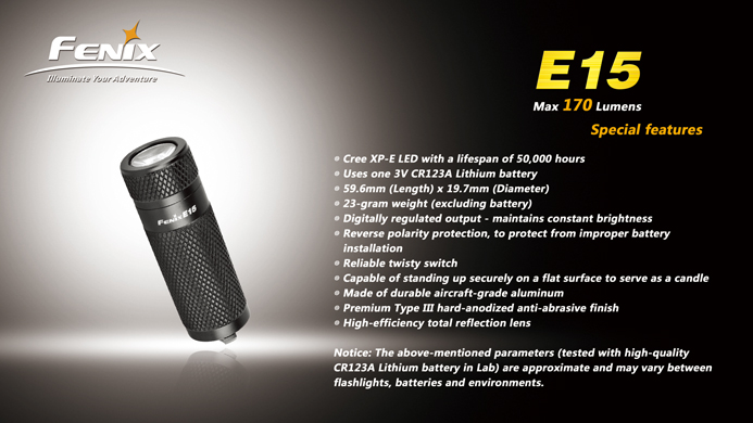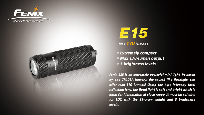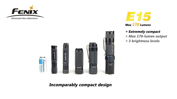 LED svetlo Fenix E15 R2 je perfektné vreckové mini svietidlo s vysokým výkonom. Vďaka svojím zanedbatelným rozmerom a váhe môže byť nosená v podstate kdekoľvek – vo vrecku, na kľúčoch či v kabelke. Svietidlo nieje oveľa väčšie ako CR123 batérie, z ktorej je napájené. Samozrejmosťou je vysoká kvalita prevedenia, odolnosť a vodotesnosť. Jedná sa o malého užitočného spoločníka pre použitie v každodenných situáciách. S týmto svetlom urobíte každému radosť!