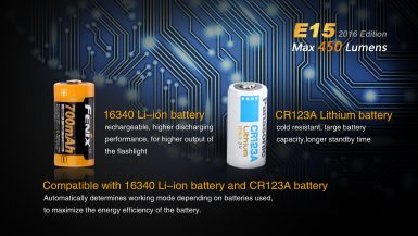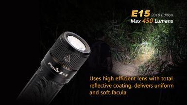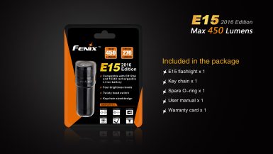 Fenix E15 R5 je naozaj miniatúrna LED baterka s vysokým výkonom až 450 lúmenov (ANSI). Zdrojom svetla je výkonná LED Cree XP-G2 R5. Vďaka svojim zanedbateľným rozmerom a váhe, je možné baterku nosiť stále pri sebe – vo vrecku, na kľúčoch či v kabelke. Na rozdiel od svojho predchodcu je možné ho napájať nie len batériou CR123A, ale aj li-ion akumulátorom RCR123A, s ktorým dosahuje vyššieho výkonu. Samozrejmosťou je vysoká kvalita vyhotovenia, odolnosť a vodotesnosť. Lampáš je svojimi vlastnosťami predurčený, aby slúžil ako ideálny malý spoľahlivý spoločník, ktorý je vždy po ruke.