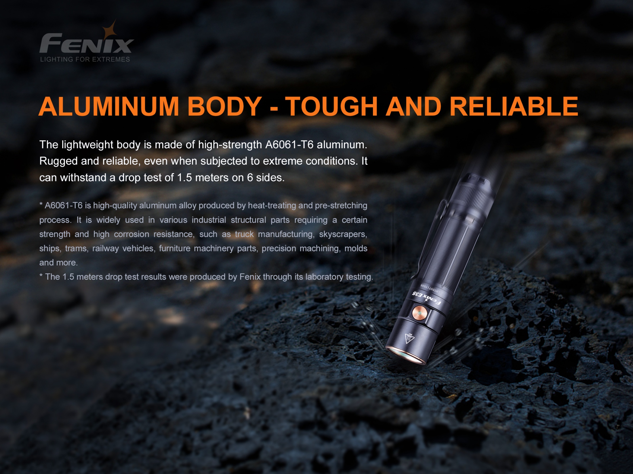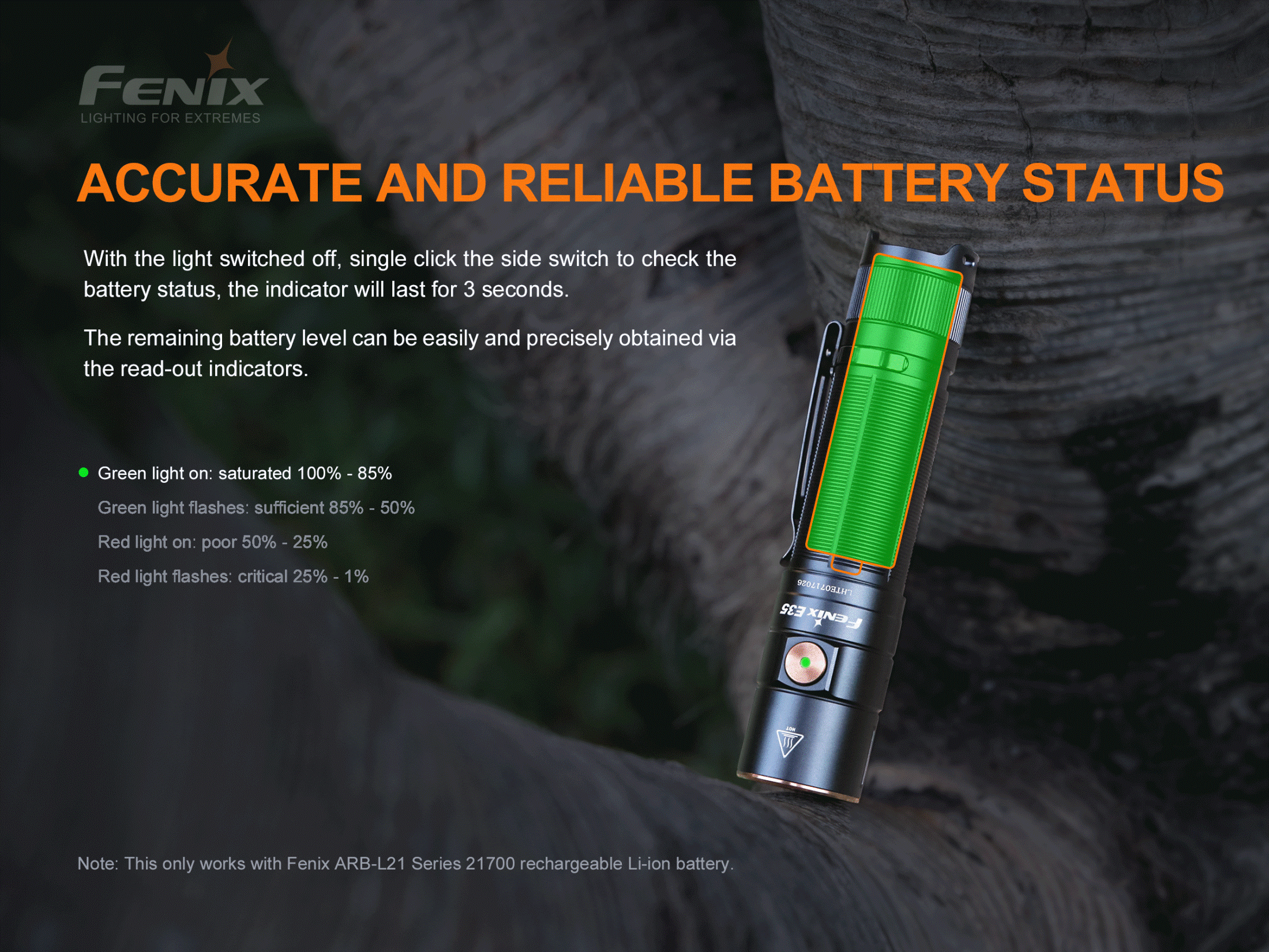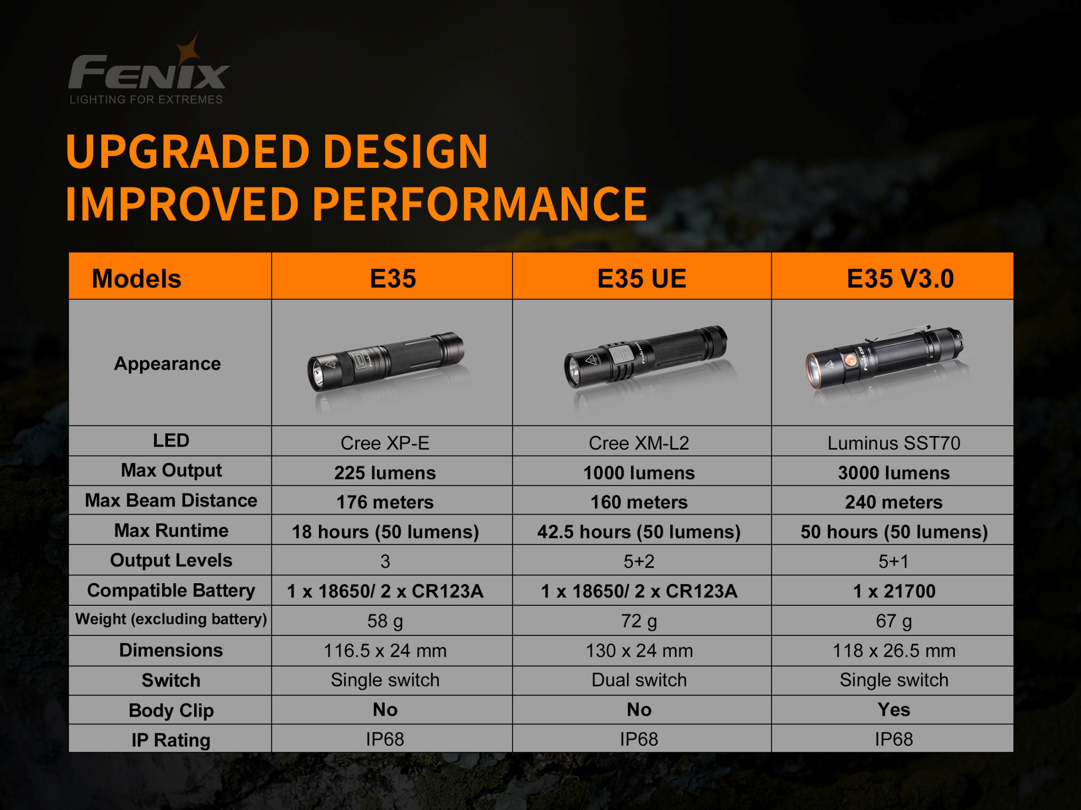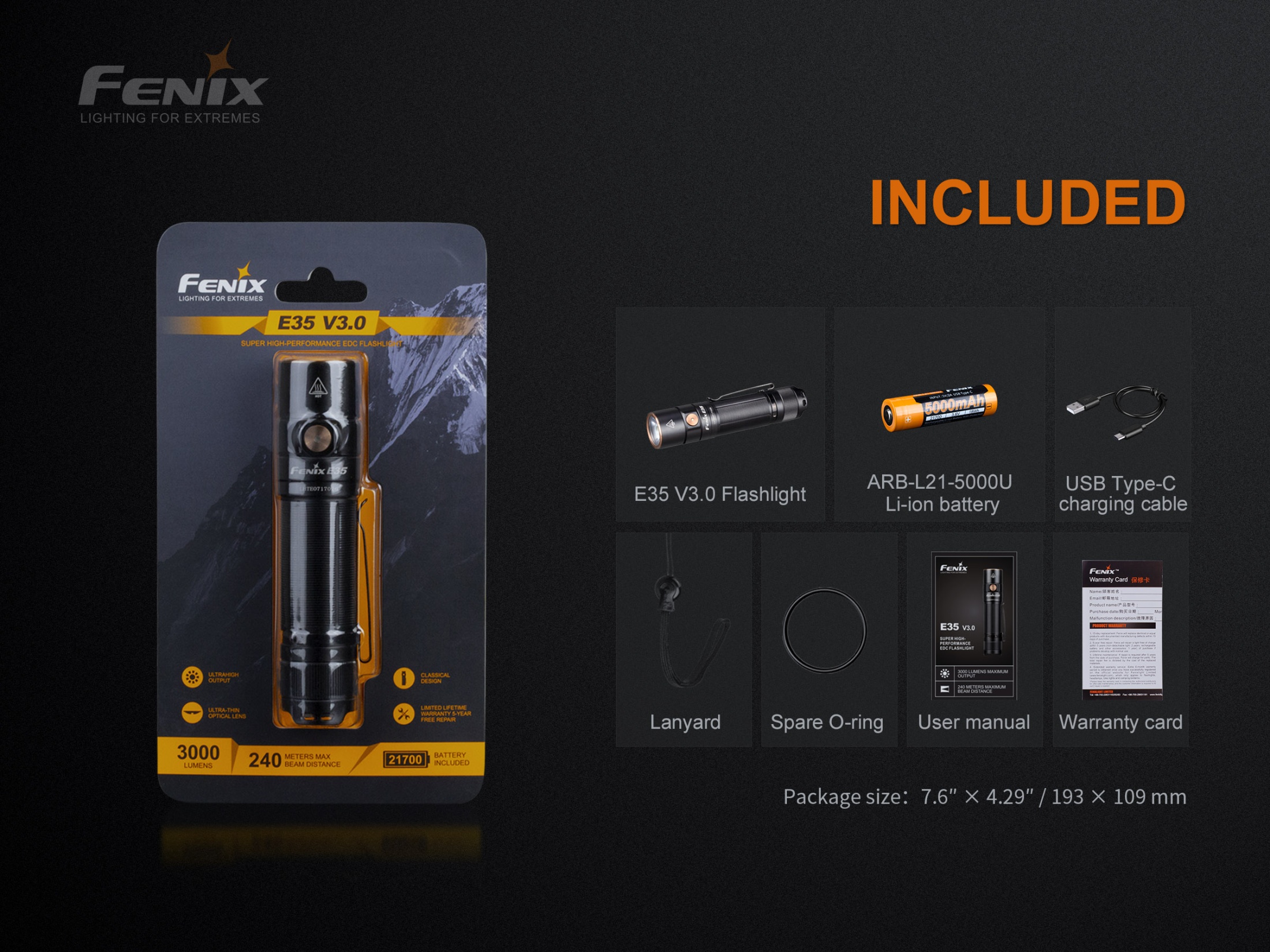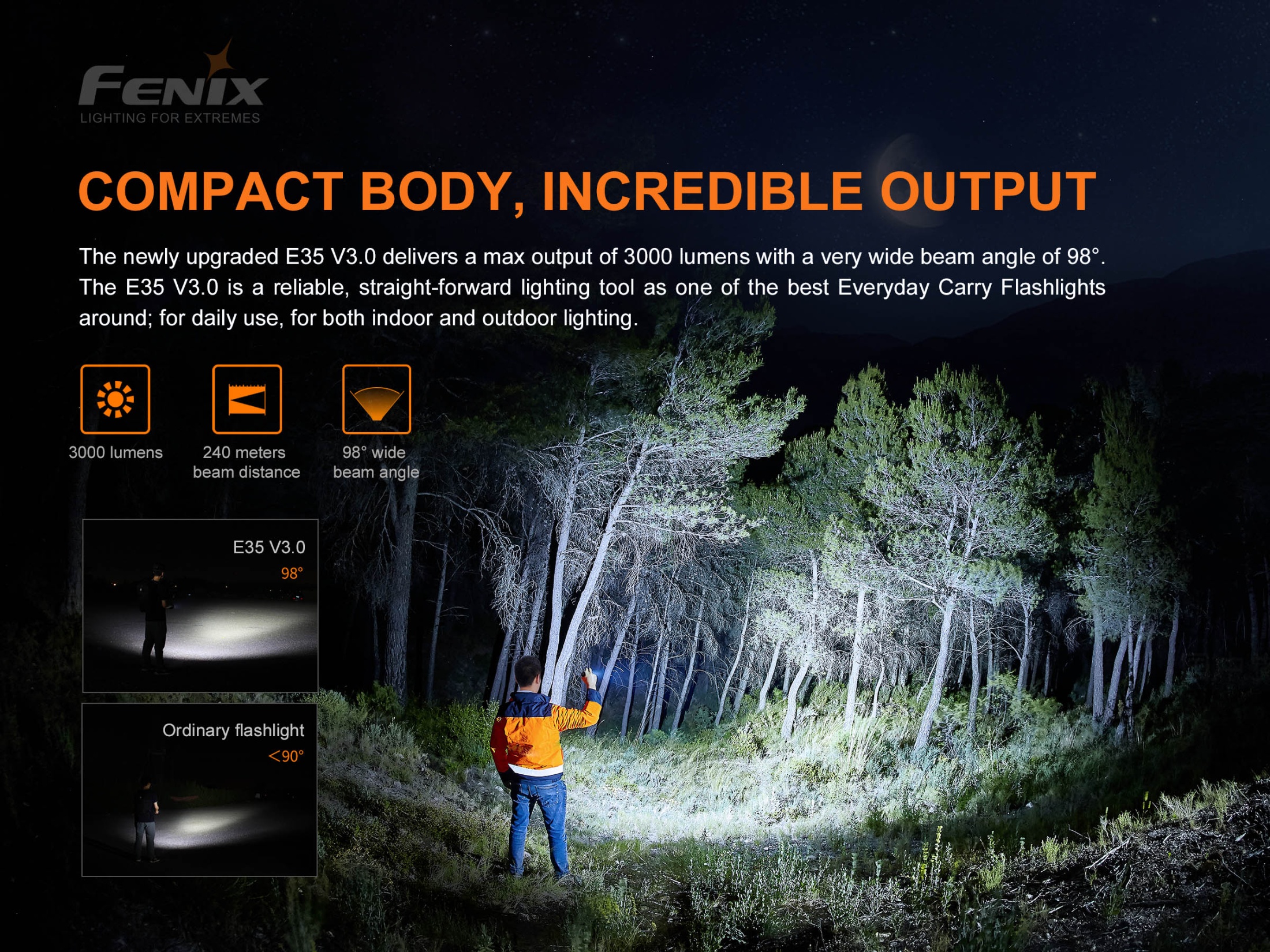 Tretia generácia LED baterky Fenix E35 V3.0 ponúka svetelný tok až 3000 lúmenov (ANSI) a dosvit až 240 metrov. Výborný výkon bol dosiahnutý použitím modernej LED Luminus SST-70. Na napájanie slúži vysokokapacitný Li-ion akumulátor typu 21700 s kapacitou 5000 mAh a zabudovaným nabíjacím USB-C konektorom (akumulátor je súčasťou balenia). Svietidlo bolo navrhnuté s ohľadom na jednoduchosť ovládania a širokú použiteľnosť. Šesť svetelných funkcií umožňuje voliť medzi vysokým výkonom a výdržou viac ako dva dni. K dispozícii je aj oslepujúci stroboskop pre núdzové situácie. Fenix E35 V3.0 je napájaná digitálne regulovaným konštantným prúdom pre zaručenie stáleho svetelného výkonu i pri znižovaní napätia v batériách (pri ich pozvoľnom vybíjaní). Svietidlo je vybavené ultra-tenkým kolimátorom, ktorý je vyrobený pomocou technológií z auto priemyslu. Zapnutie aj prepínanie režimov sa vykonáva tlačidlom ergonomicky umiestnenými na boku. Táto baterka je ideálnym svetelným nástrojom s vynikajúcim pomerom vysokého výkonu, kvality a ceny. Možno ju odporučiť pre široké spektrum outdoorových, športových i profesionálnych aktivít.