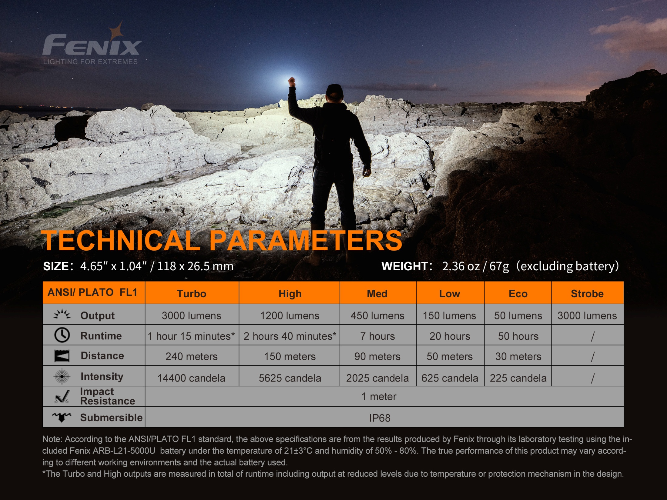 Všetky parametre baterky (svetelný tok, doba svietenia na batérie, vodotesnosť, dosvit a nárazuvzdornosť) sú merané v súlade s normou ANSI/NEMA FL 1-2009 Flashlight Basic Performance Standard.