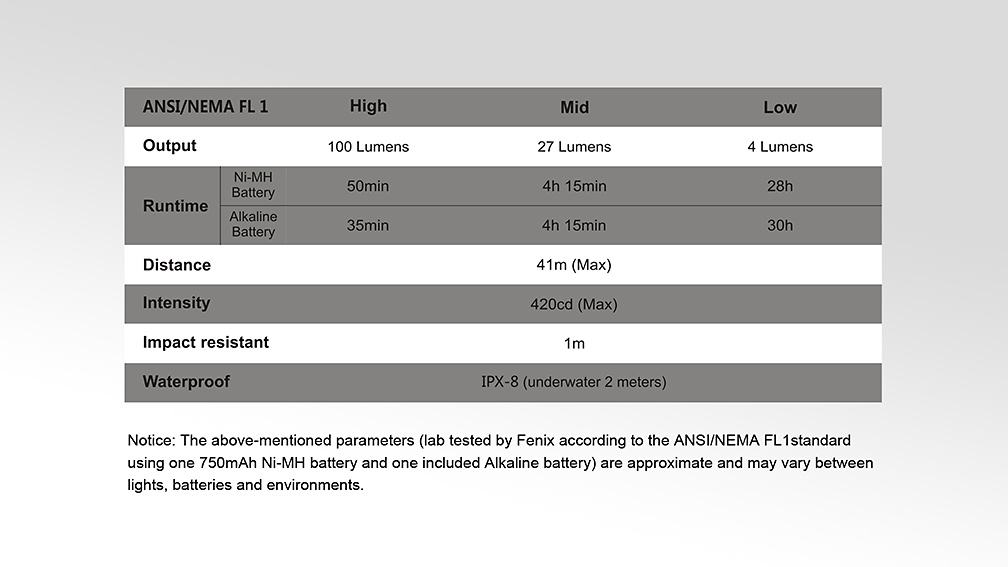 Všetky parametre svietidla (svetelný tok, doba svietenia na batérie, vodotesnosť, dosvit a nárazuvzdornosť) sú merané v súlade s normou ANSI/NEMA FL 1-2009 Flashlight Basic Performance Standard.