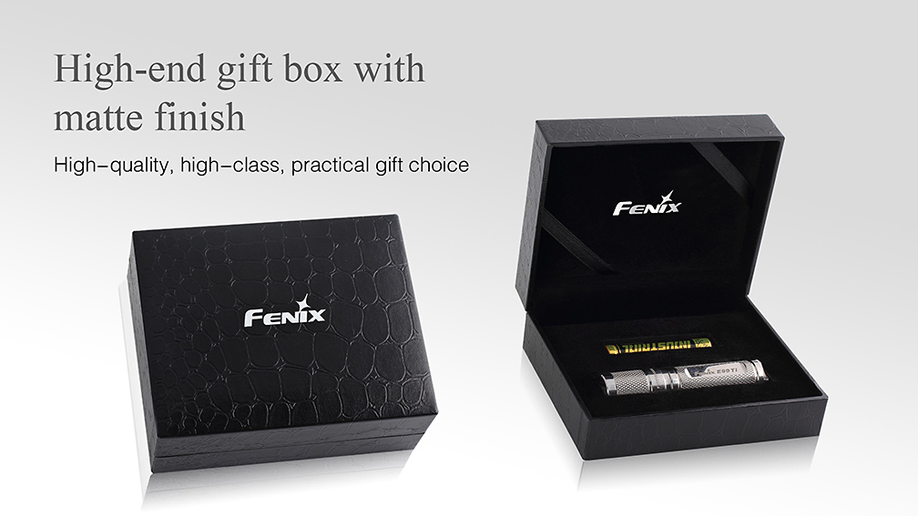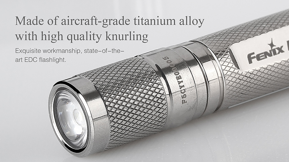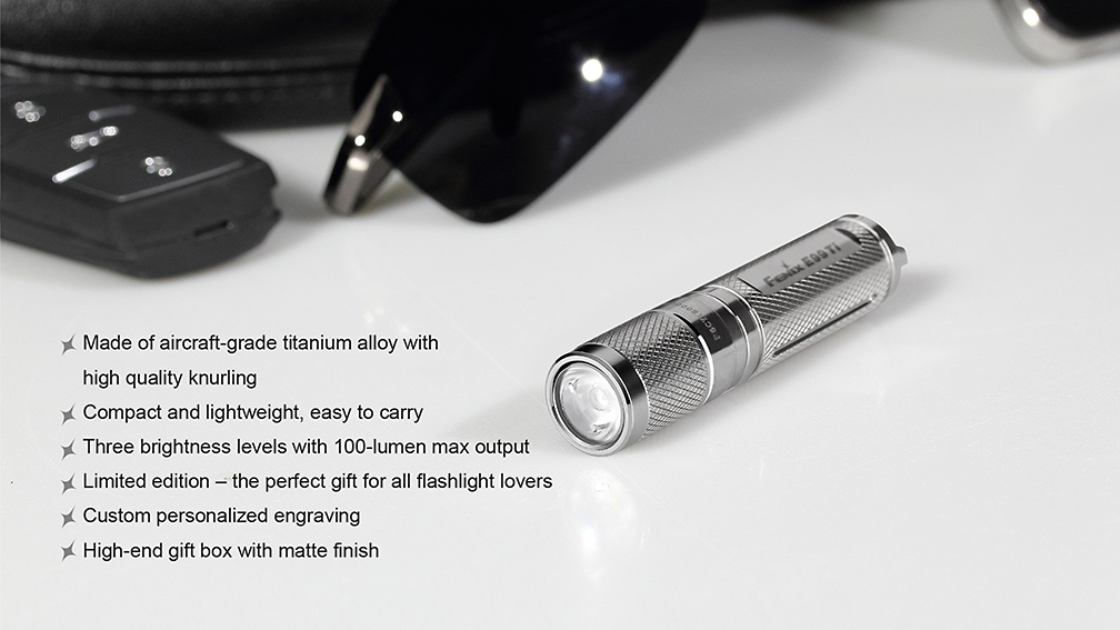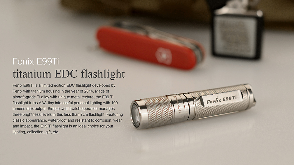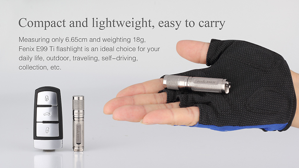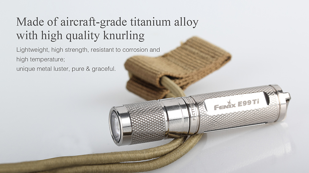 Svietidlo Fenix E99 Ti je exkluzívne vreckové mini svietidlo vyrobené z titánovej zliatiny s lešteným povrchom. Jedná sa len o limitovanú edíciu a počet vyrobených kusov je obmedzený ! Titánové telo dodáva baterke nielen luxusný vzhľad , ale aj vysokú pevnosť a nízku váhu . Vďaka svojím zanedbateľným rozmerom a váhe môže byť nosená v zásade kdekoľvek – vo vrecku, na kľúčoch či v peňaženke. Svetlo nie je o moc väčšie než mikrotužková (AAA) batéria, z ktorej je taktiež napájané. Samozrejmosťou je vysoká kvalita prevedenia, odolnosť a vodotesnosť. Jedná sa o malého užitočného spoločníka pre použitie v každodenných situáciách so svetelným výkonom až 85 lúmenov a výdržou až 15 hodín prevádzky.