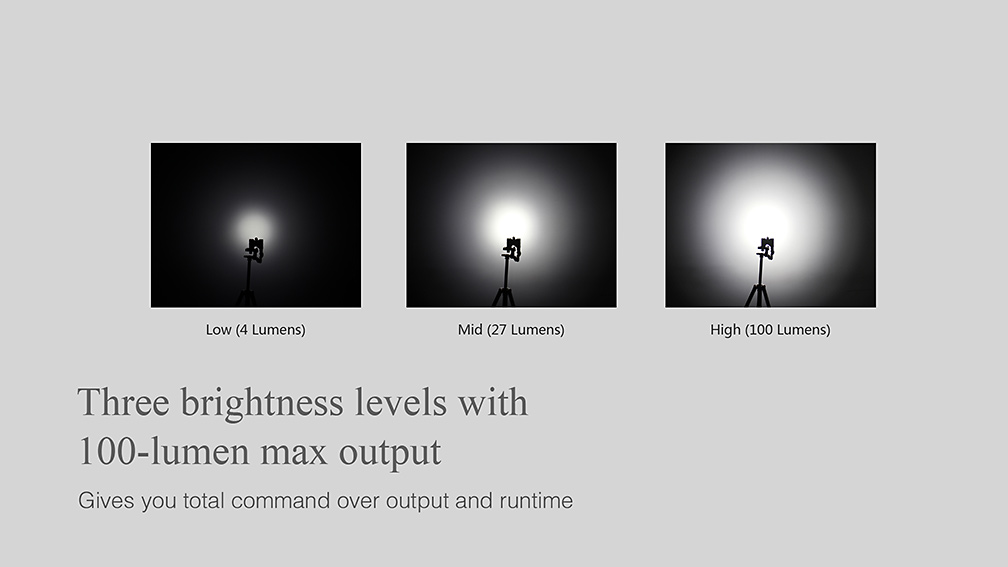 | Výkon (lúmeny) | 4 | 27 | 100 | 41 m | 420 cd | 1 m | IPX8, 2 m pod vodou | 66 mm | 15 mm | 15 mm | 18 g (bez batérií) |