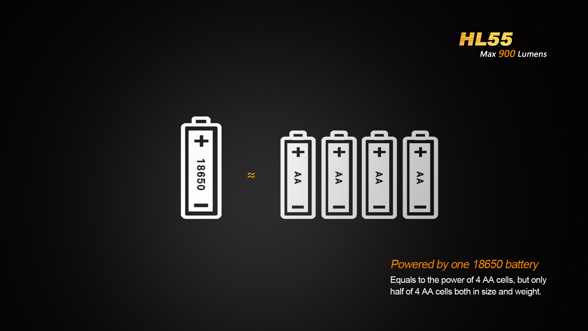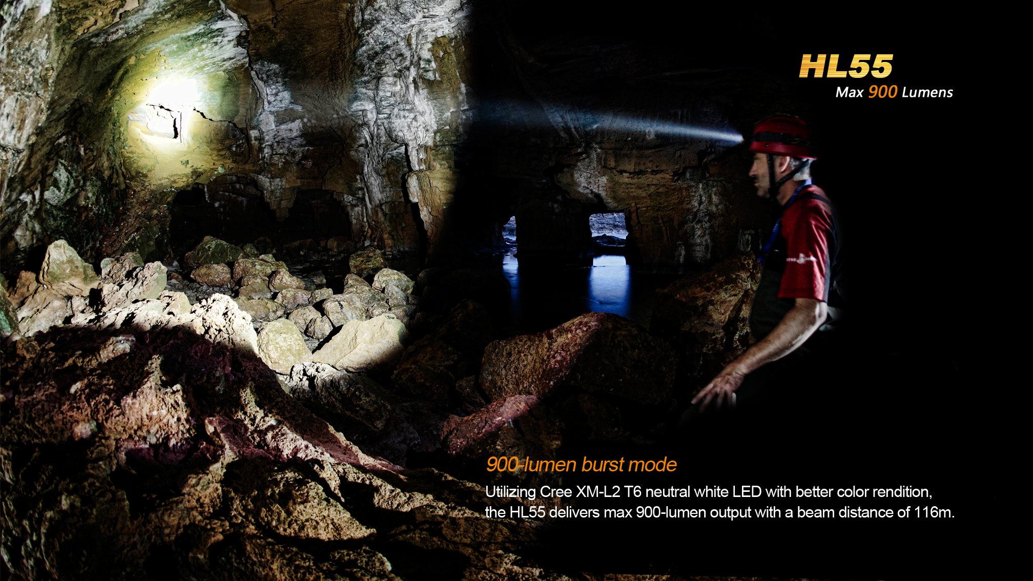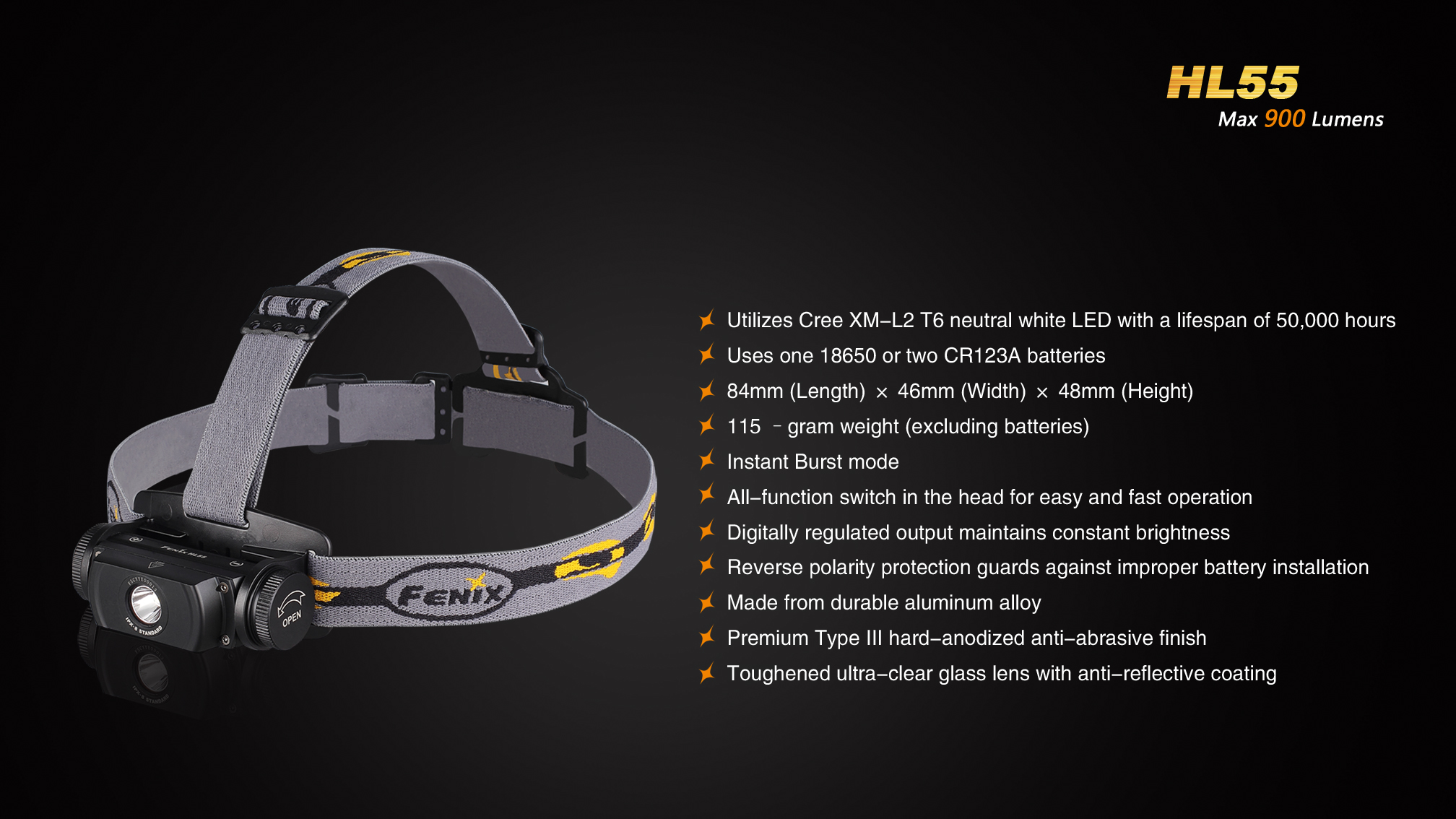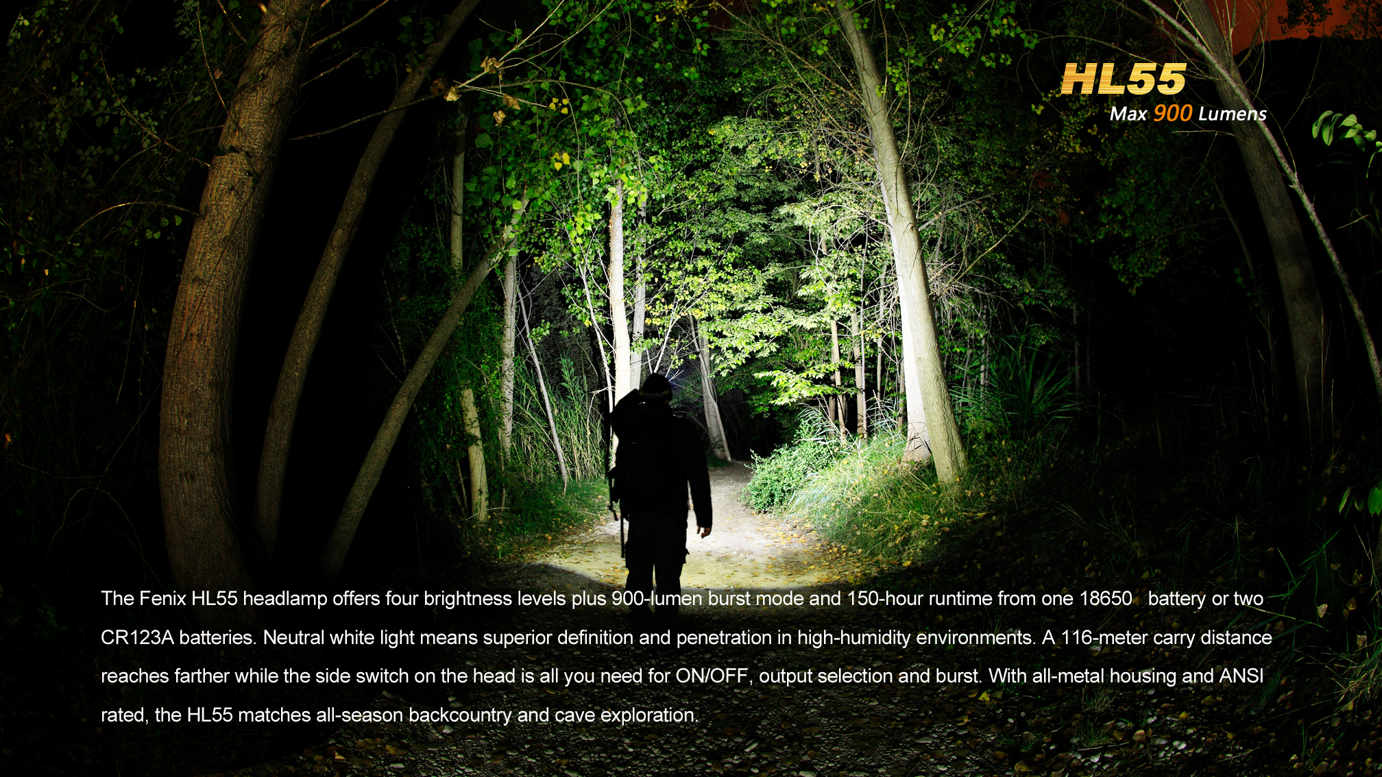 LED čelovka Fenix HL55 prináša extrémny výkon až 900 lúmenov (ANSI) a dosvit do vzdialenosti 116 metrov. Na napájanie je možné použiť buď dve lítiové batérie CR123A, alebo jeden nabíjací akumulátor li-ion 18650. Svetelným zdrojom je špičková LED Cree XM-L2 T6 s teplejším odtieňom svetla (neutral white).