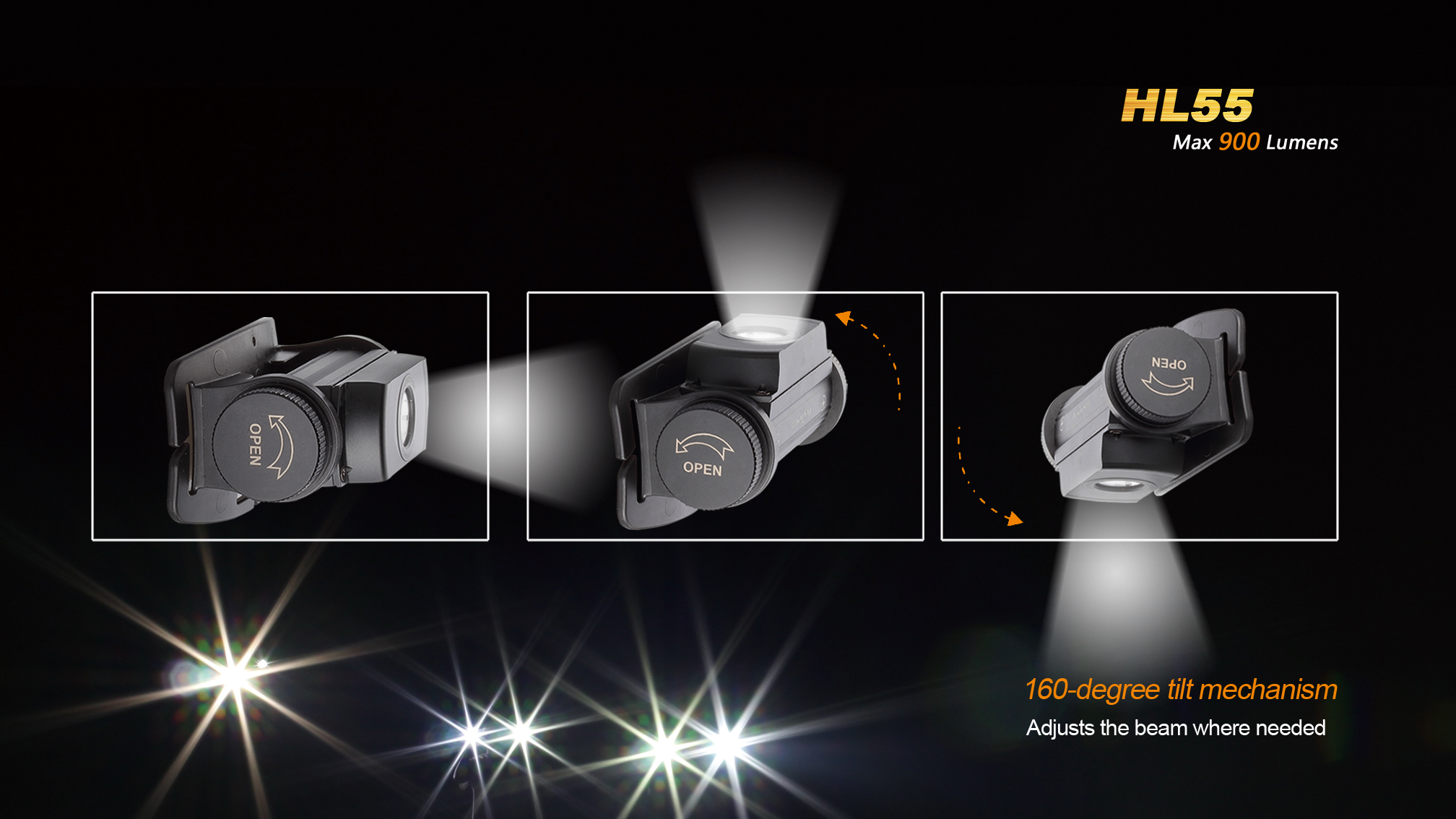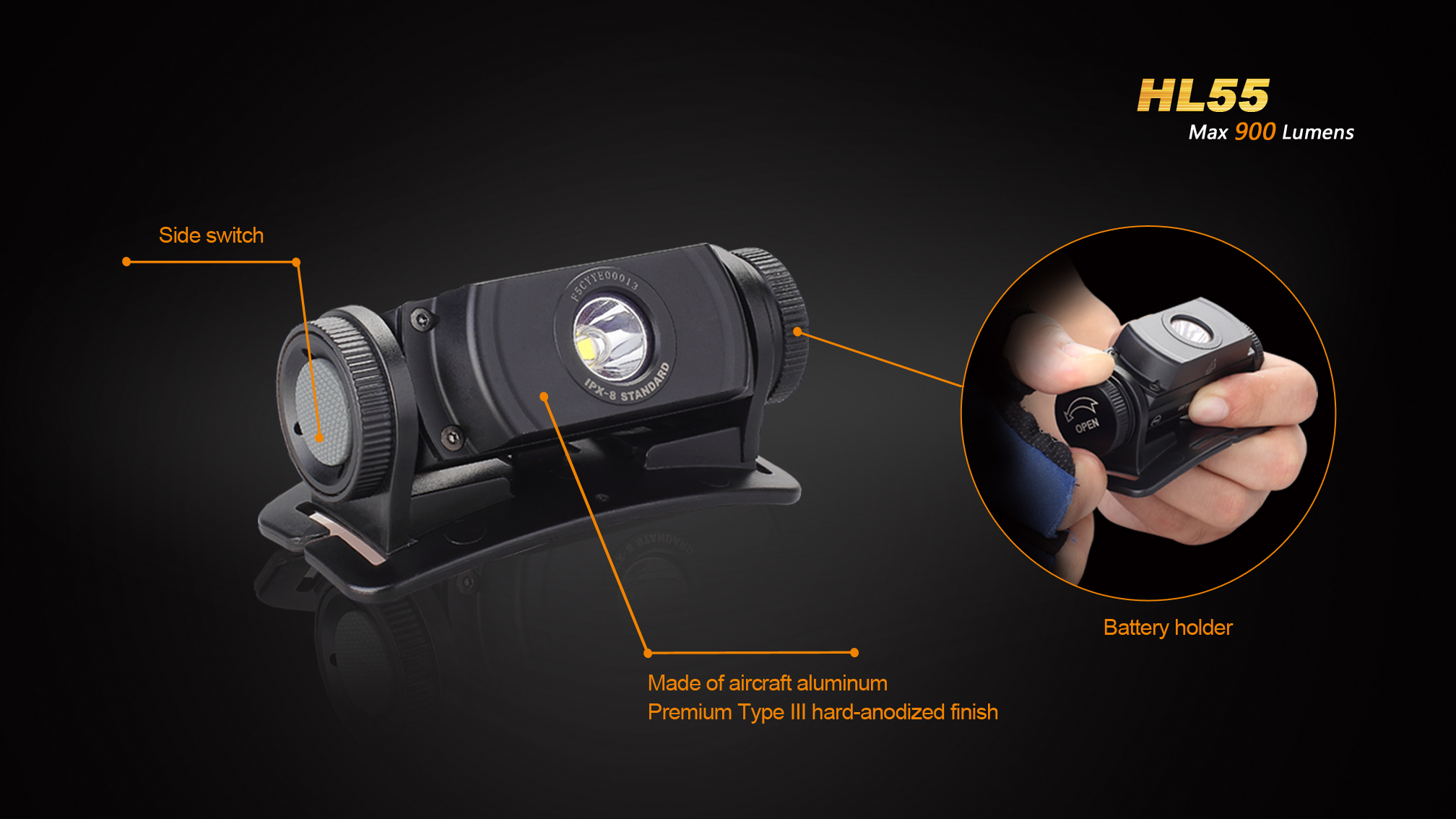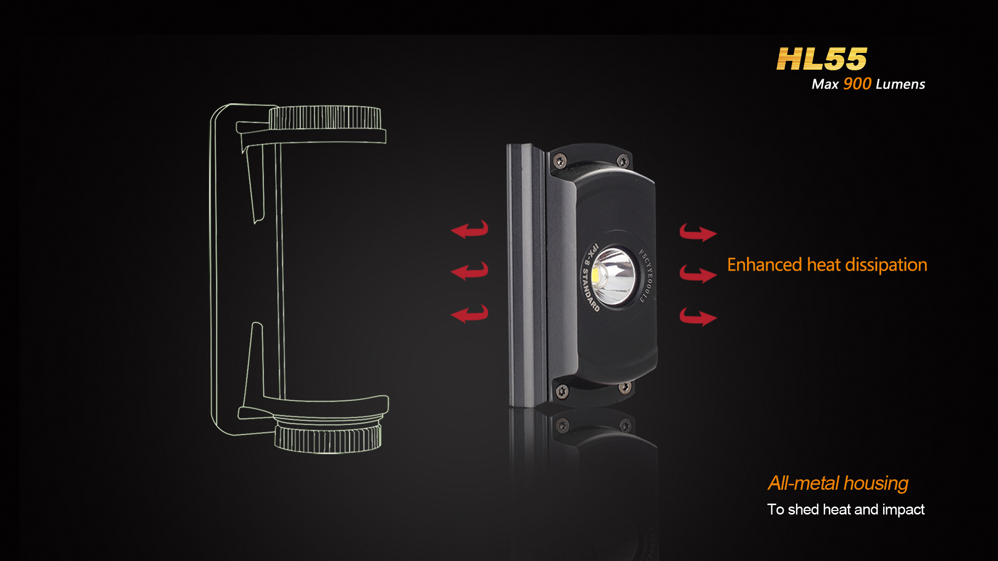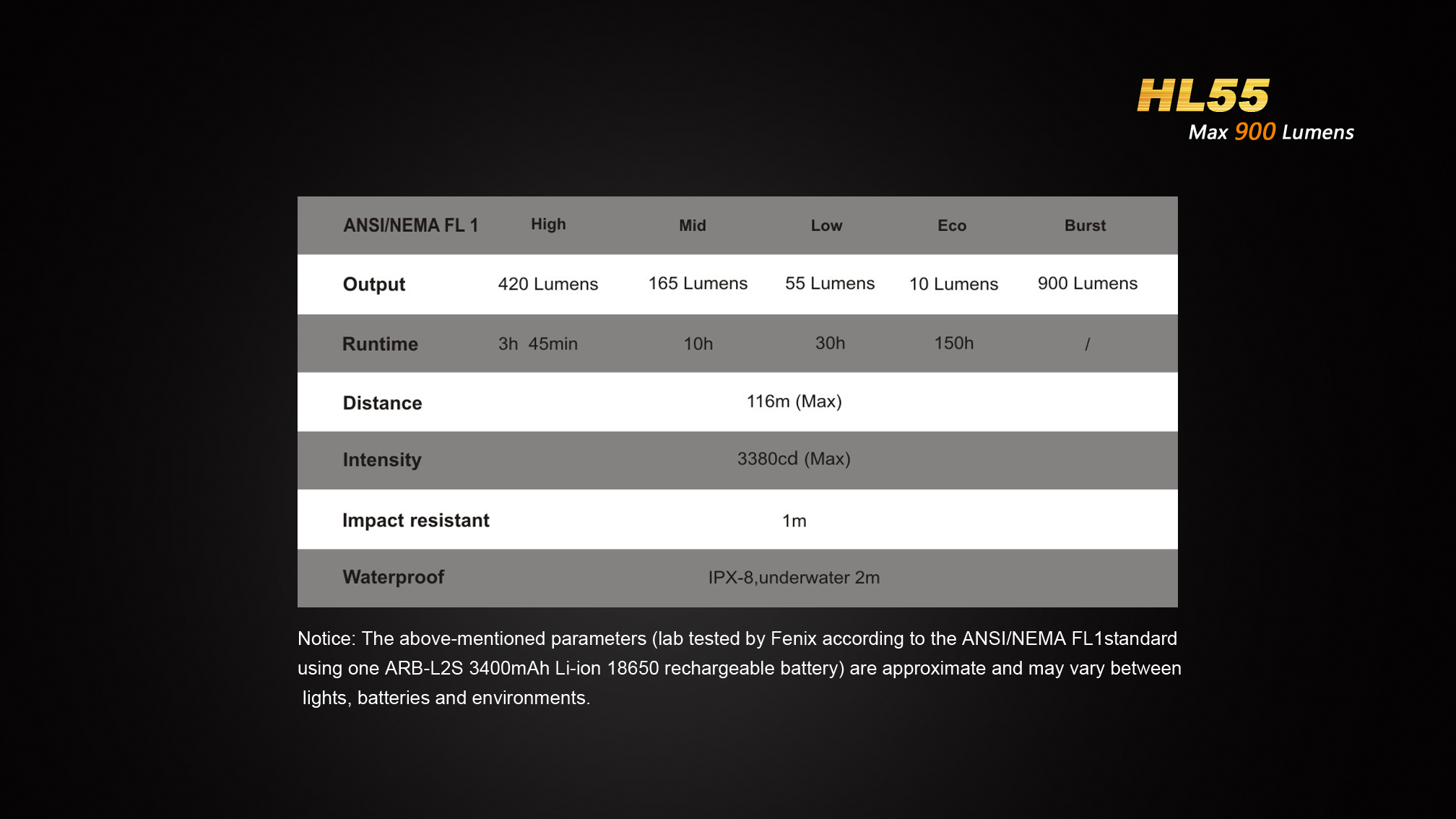 LED čelovka Fenix HL55 prináša extrémny výkon až 900 lúmenov (ANSI) a dosvit do vzdialenosti 116 metrov. Na napájanie je možné použiť buď dve lítiové batérie CR123A, alebo jeden nabíjací akumulátor li-ion 18650. Svetelným zdrojom je špičková LED Cree XM-L2 T6 s teplejším odtieňom svetla (neutral white).