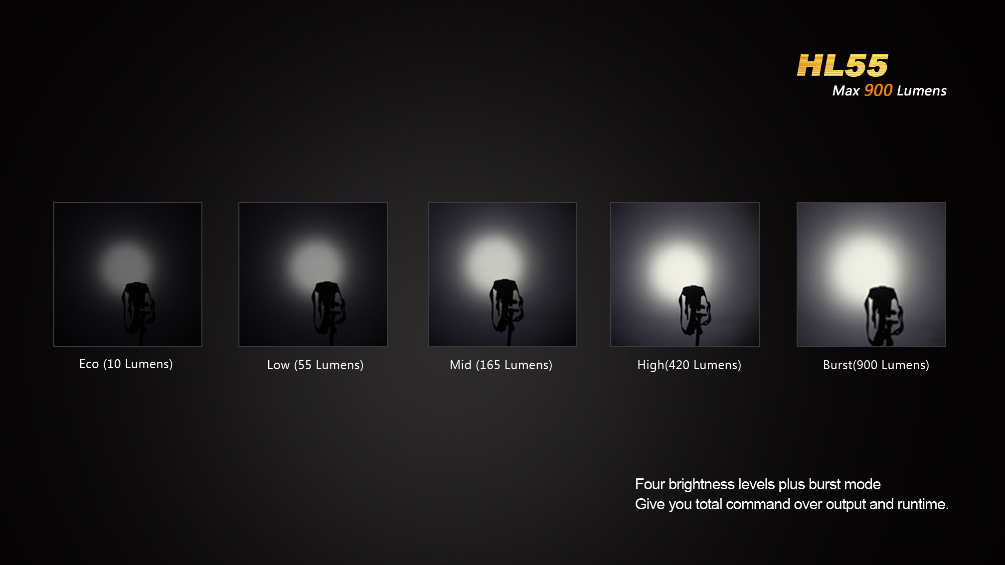 Fenix HL55 disponuje celkom piatimi režimami svietenia, voliť tak možno medzi extrémnym výkonom a dlhou dobou prevádzky až 150 hodín. Čelovka Fenix HL55 je ideálnym spoločníkom pre rôznorodé športové i domáce aktivity.