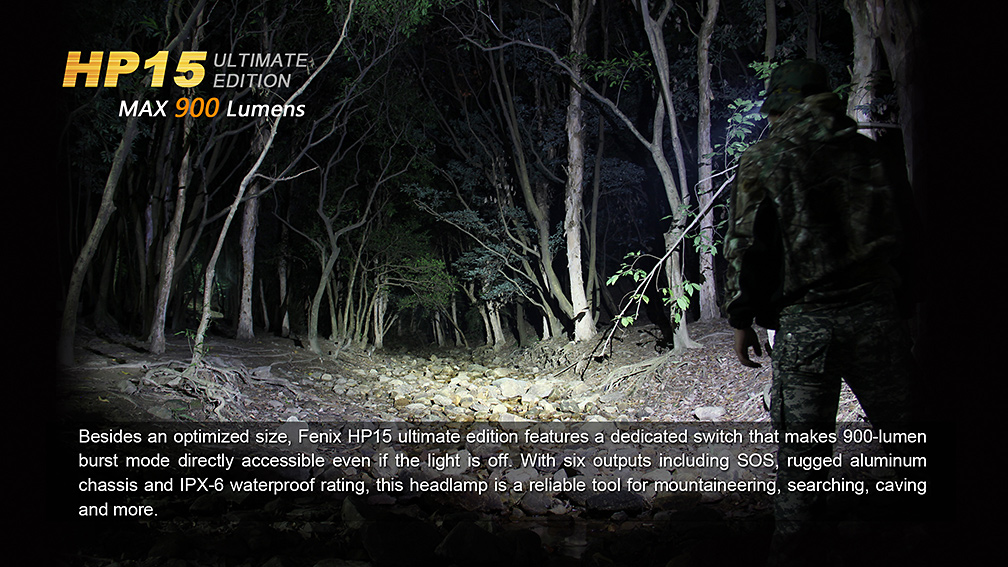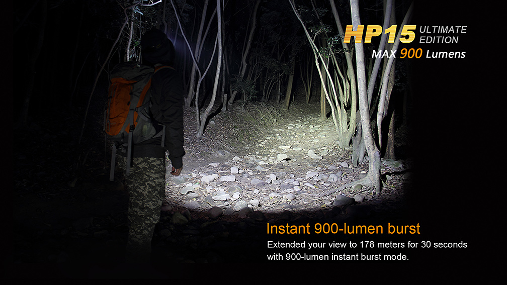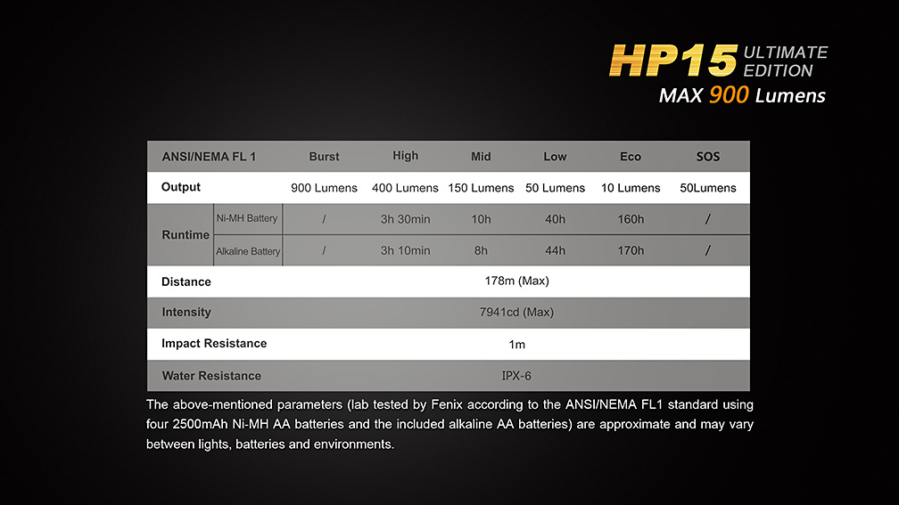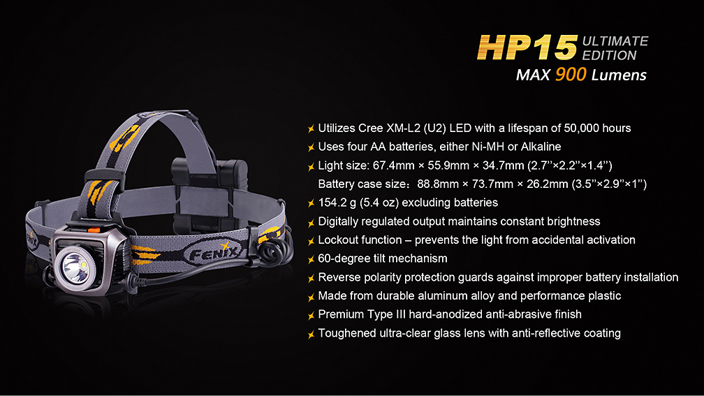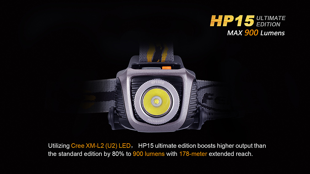 Čelovka Fenix HP15 Ultimate Edition ponúka excelentný svetelný tok až 900 lúmenov (ANSI) s dosvitom do vzdialenosti 178 metrov. K napájaniu používa bežne dostupné štyri tužkové AA batérie, ktoré sú umiestnené v puzdre na zátylku. Ako svetelný zdroj slúži najnovšia LED Cree XM-L2. Jedná sa tak o najsilnejšiu čelovú LED lampu na tužkové batérie na trhu!