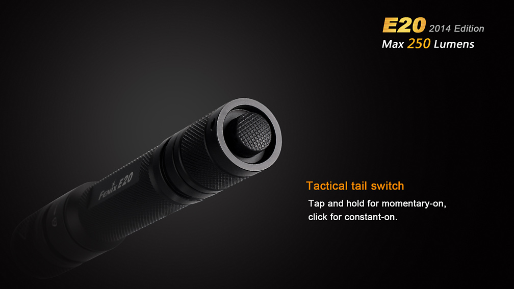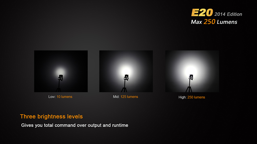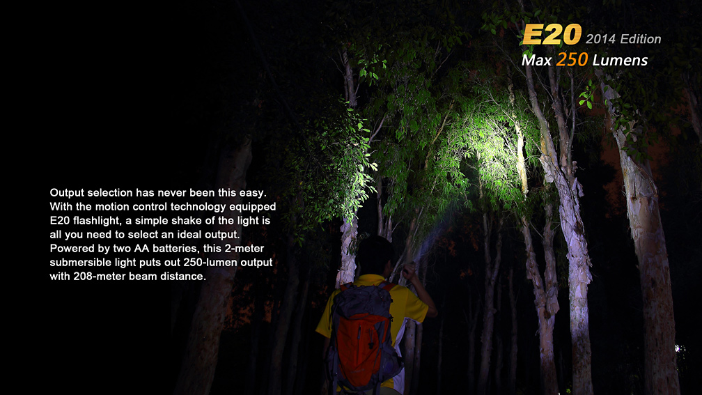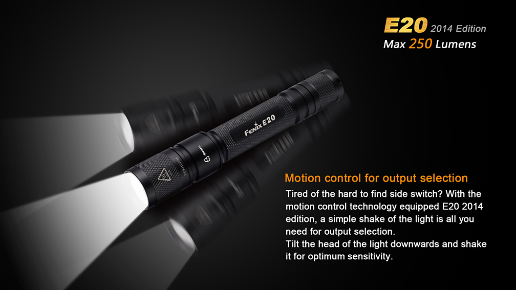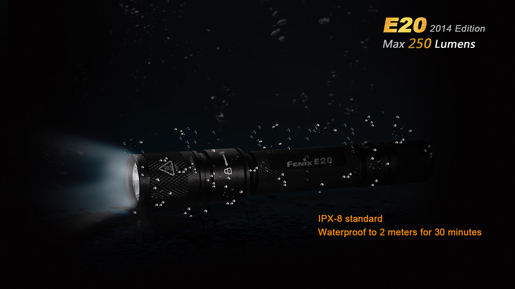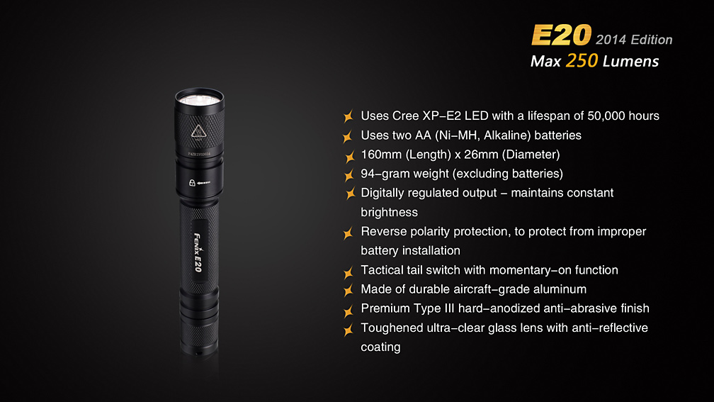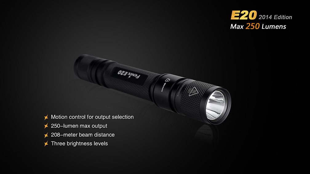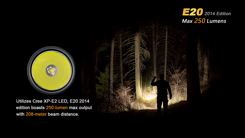 Ručný LED lampáš Fenix E20 XP-E2 ponúka svetelný tok až 250 lúmenov (ANSI). Svetlo bolo navrhnuté s ohľadom na vysoký výkon, širokú použiteľnosť a dobrú cenu. Tri úrovne svetelného výkonu s dobou prevádzky až 80 hodín užívateľom umožňujú zvoliť medzi vysokým výkonom a slušnou výdržou. Starostlivo navrhnutý reflektor vytvára svetelný kužeľ s optimálnou rovnováhou medzi dosvitom (až 208 metrov) a šírkou osvetlenej plochy.