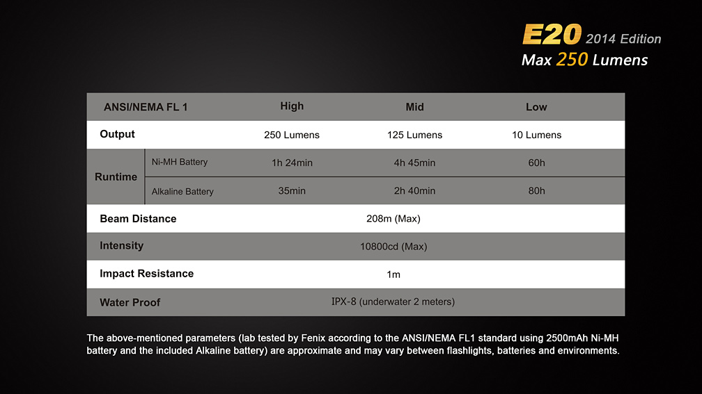 Všetky parametre baterky (svetelný tok, doba svietenia na batérie, vodotesnosť, dosvit a nárazuvzdornosť) sú merané v súlade s normou ANSI/NEMA FL 1-2009 Flashlight Basic Performance Standard.