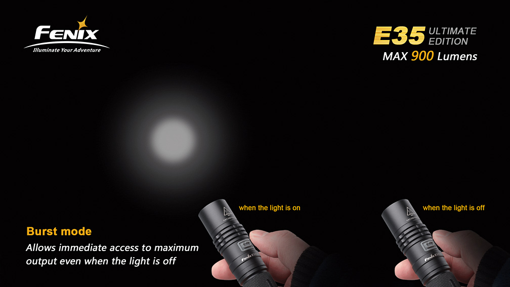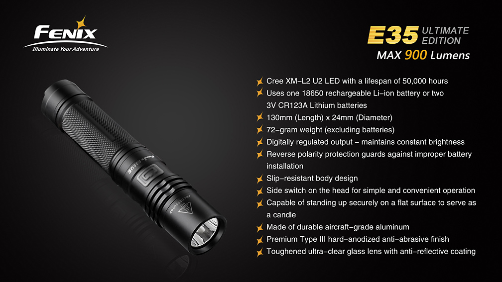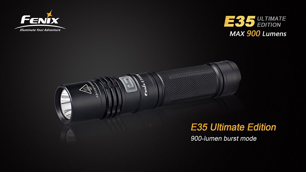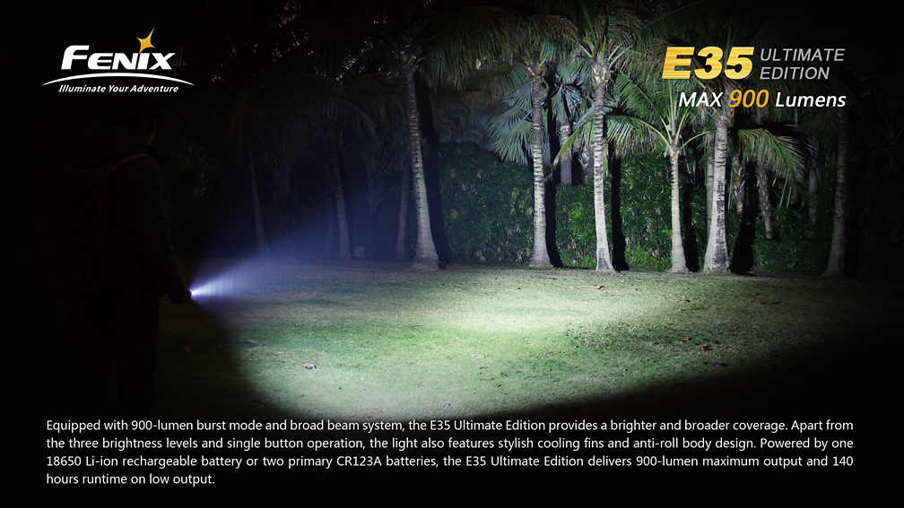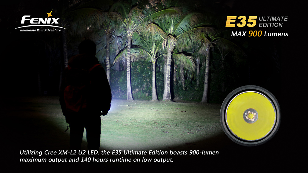 Ručné LED svietidlo Fenix E35 Ultimate Edition je osádzané vysoko výkonnou svetelnou diódou Cree XM-L2 U2. Ponúka prekvapivý svetelný tok až 900 lúmenov (ANSI) v krátkodobom BURST režime. K napájaniu možno použiť vysokokapacitný li-ion akumulátor typu 18650 a alebo dve jednorazové CR123A batérie. Tri režimy umožňujú voliť medzi vysokým výkonom s dosvitom až 156 metrov a dlhou výdržou až 140 hodín. Svetlo Fenix E35 používa digitálnu elektroniku s konštantnou reguláciou pre zaručenie stáleho svetelného výkonu i pri znižovaní napätia v batériách (pri ich pozvoľnom vybíjaní). Zapnutie i prepínanie režimov je pohodlné a rýchle cez tlačidlo ergonomicky umiestnené na boku tela. Ručné svetlo Fenix E35 Ultimate je ideálnym svetelným nástrojom s vynikajúcim pomerom vysokého výkonu, kvality a ceny. Je vhodné do domácnosti, na turistiku alebo cyklistiku.
