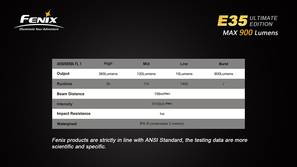 Všetky parametre svietidla (svetelný tok, doba svietenia na batérie, vodotesnosť, dosvit a nárazuvzdornosť) sú merané v súlade s normou ANSI/NEMA FL 1-2009 Flashlight Basic Performance Standard.