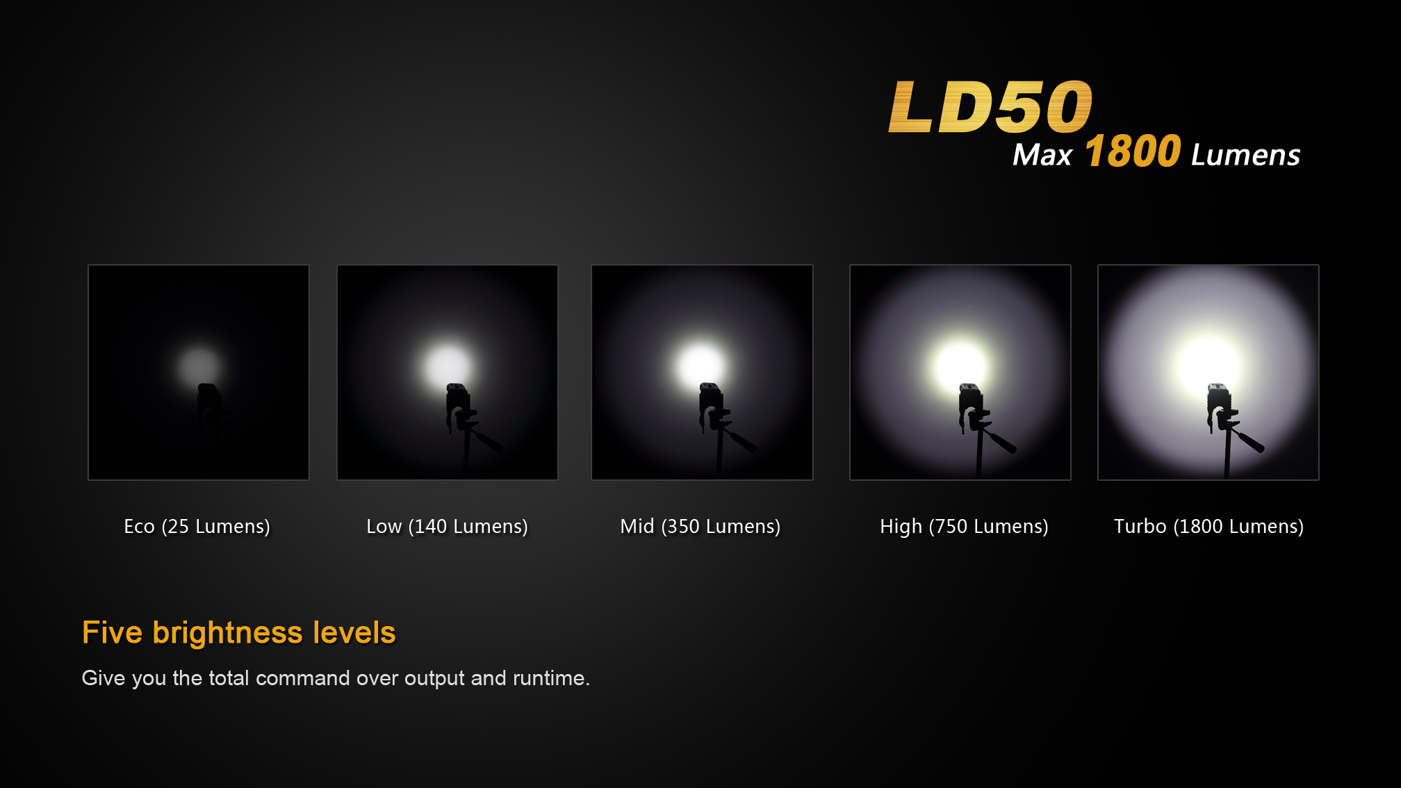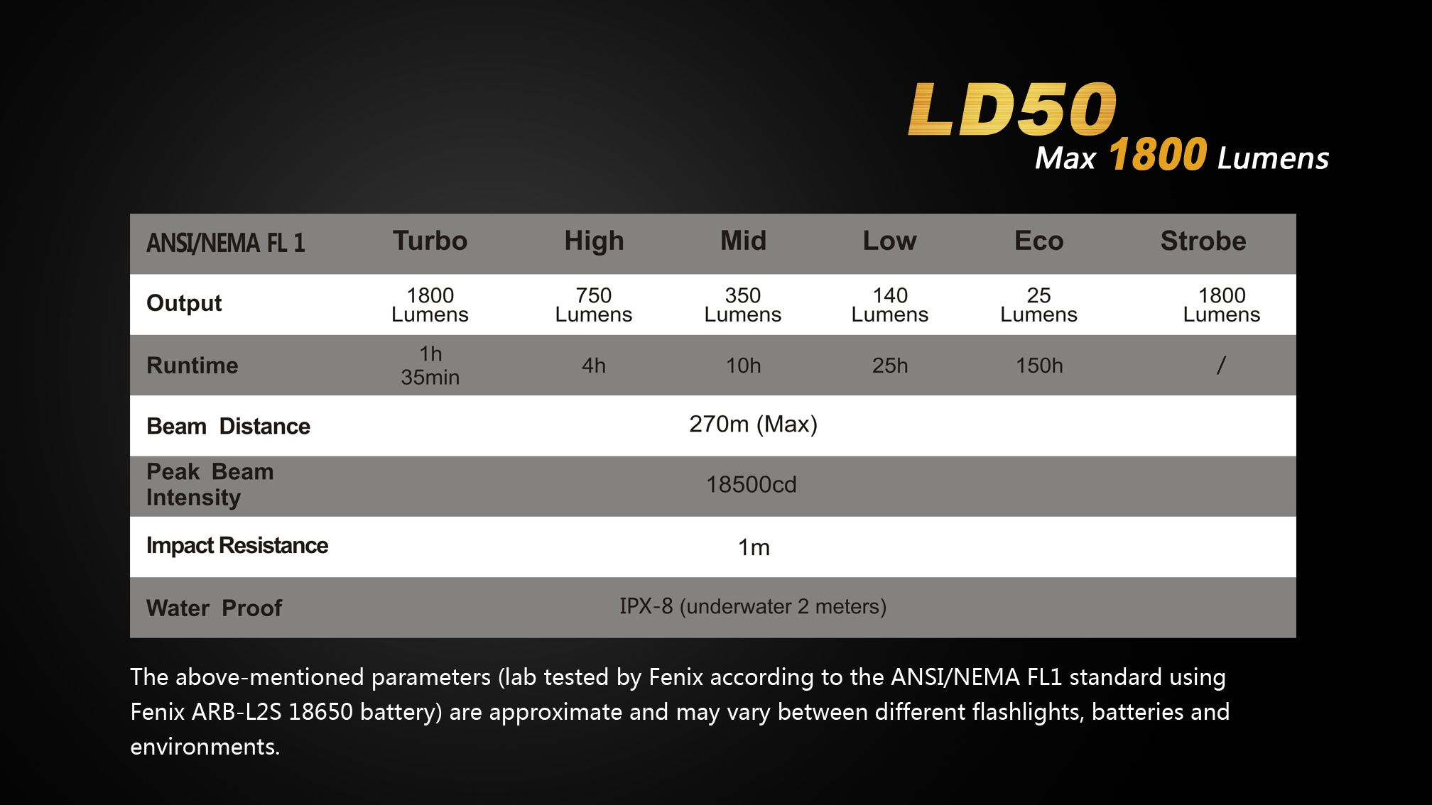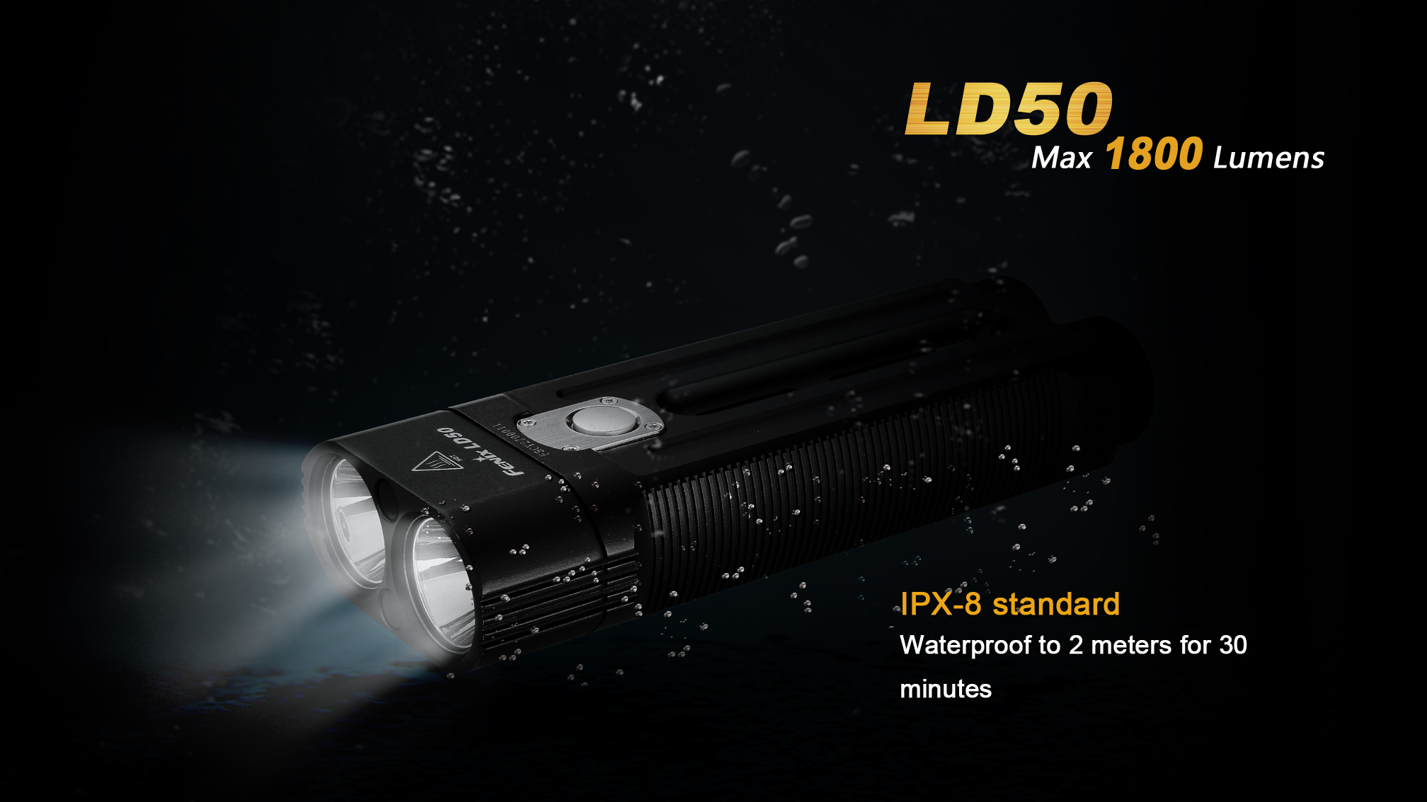 Ručné LED svetlo Fenix LD50 je osadené dvomi špičkovými svetelnými diódami Cree XM-L2 U2 s ponukou celkom šiestich režimov svietenia s maximálnym výkonom neuveriteľných 1 800lm. Svetlo používa digitálnu elektroniku s konštantnou reguláciou pre zaručenie stáleho svetelného výkonu i pri znižovaní napätia v batériách. Svetlo možno napájať 2-4 kusmi CR123A batérií resp. 1-2 kusy 18650 akumulátorov. Pre fungovanie svietidla stačí vložiť batérie iba do jednej pozície, ale výkon potom bude iba polovičný (svieti len jedna z dvoch LED). Vďaka usporiadaniu batérií i reflektora vedľa seba je svetlo veľmi kompaktné. S dĺžkou necelých 14 centimetrov perfektne padne do ruky.